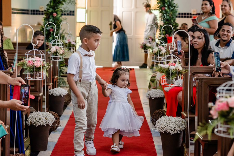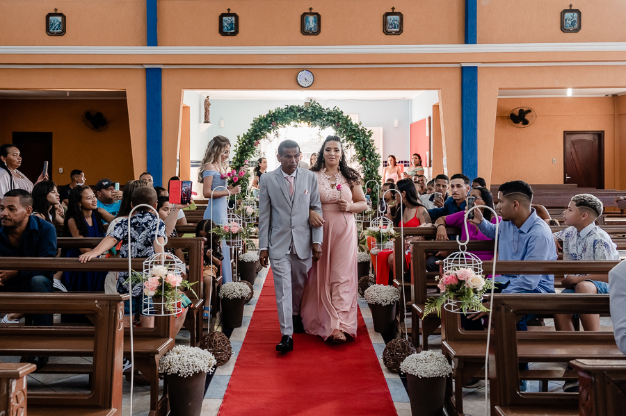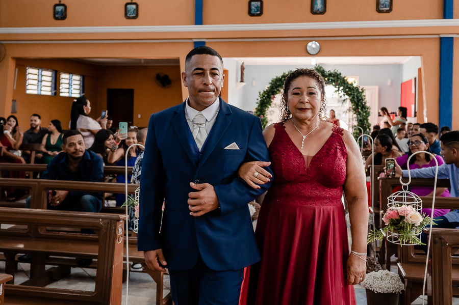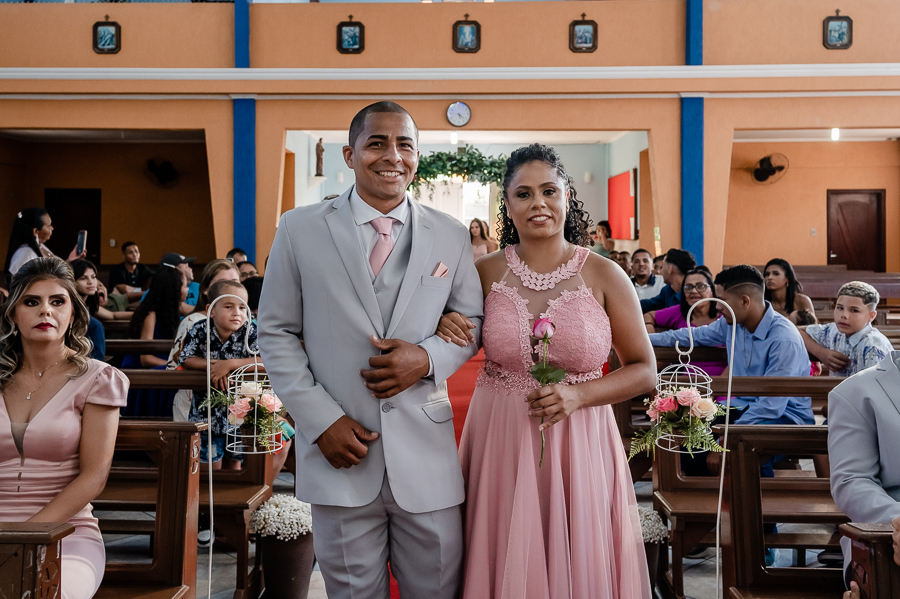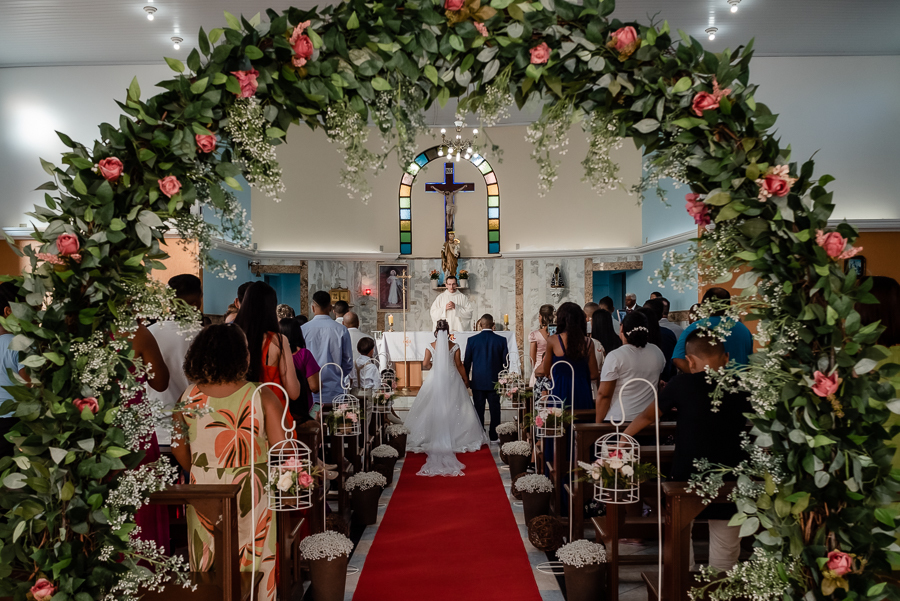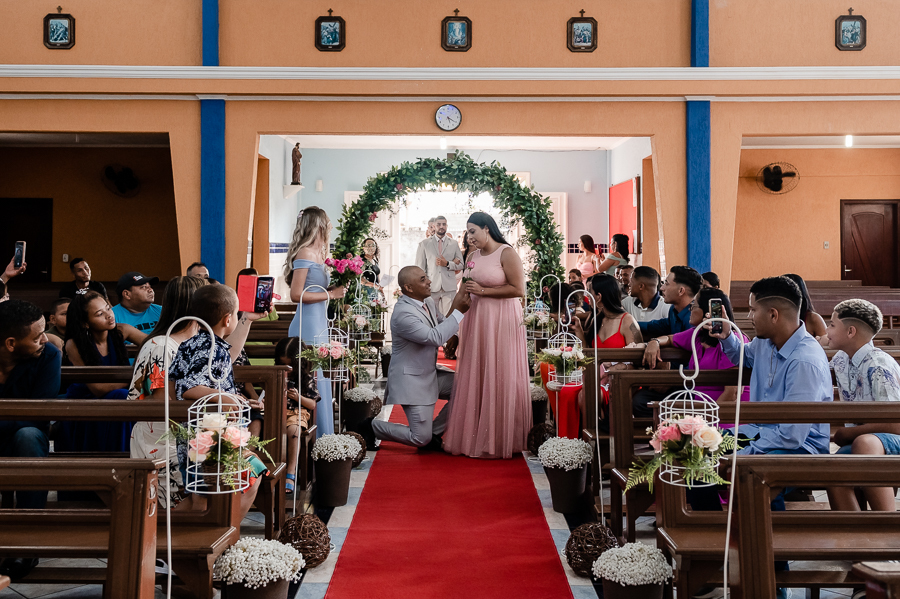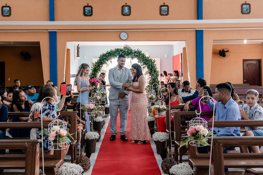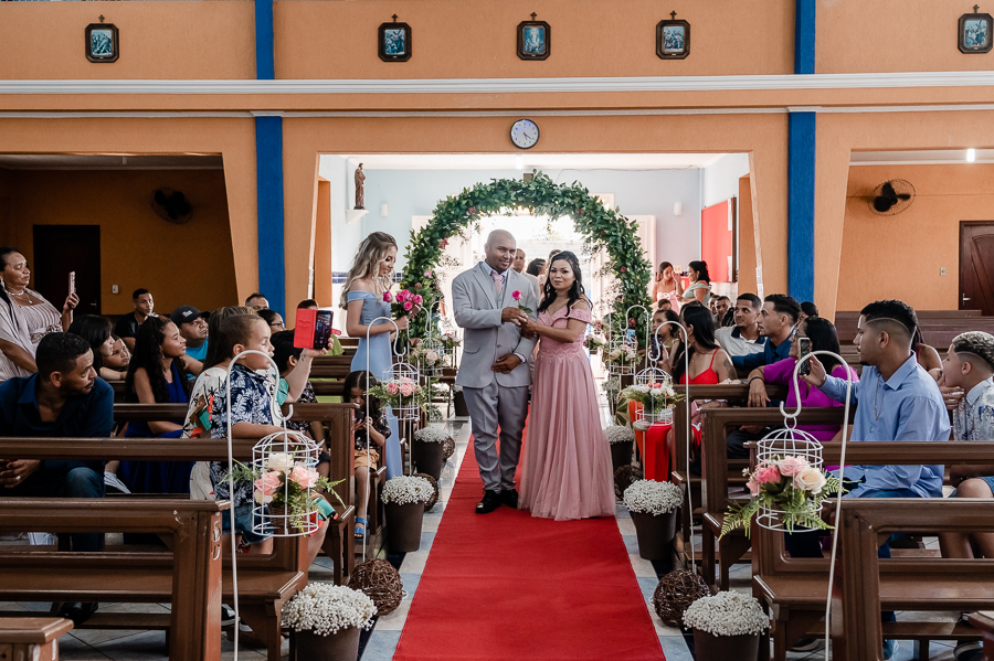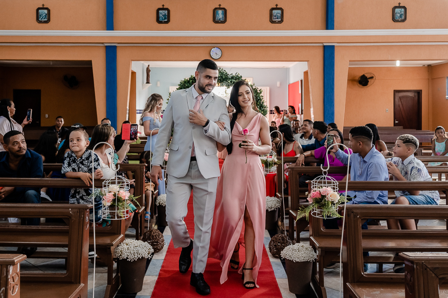 Seguimos então para a igreja, onde acompanhamos a chegada do noivo, das madrinhas e padrinhos, da família e amigos.