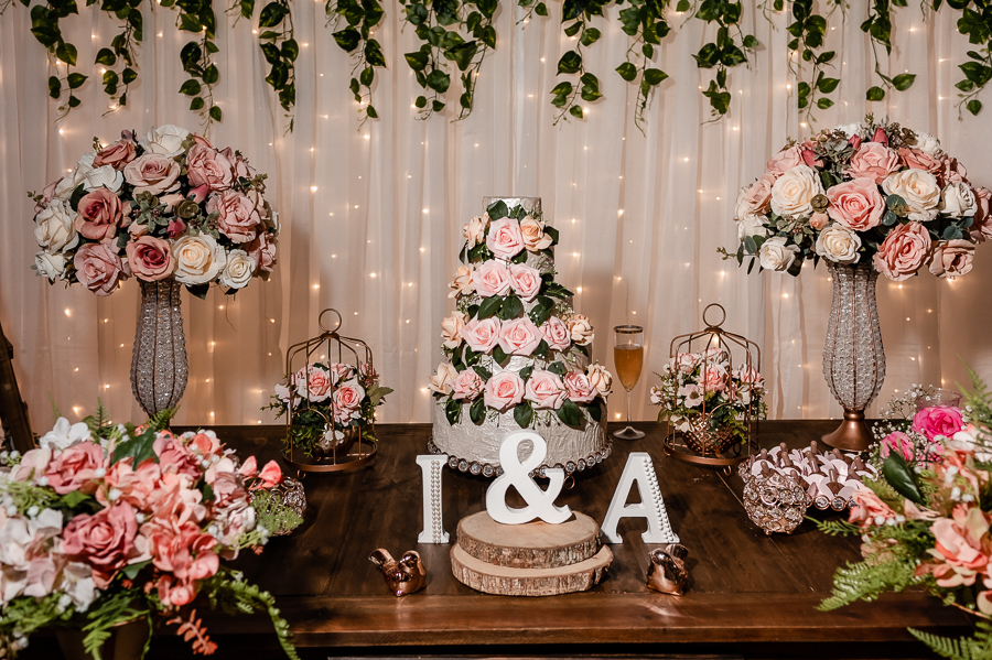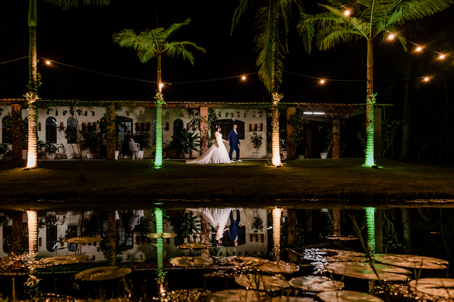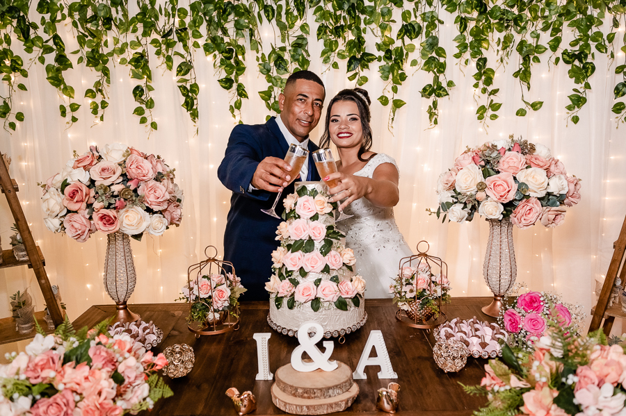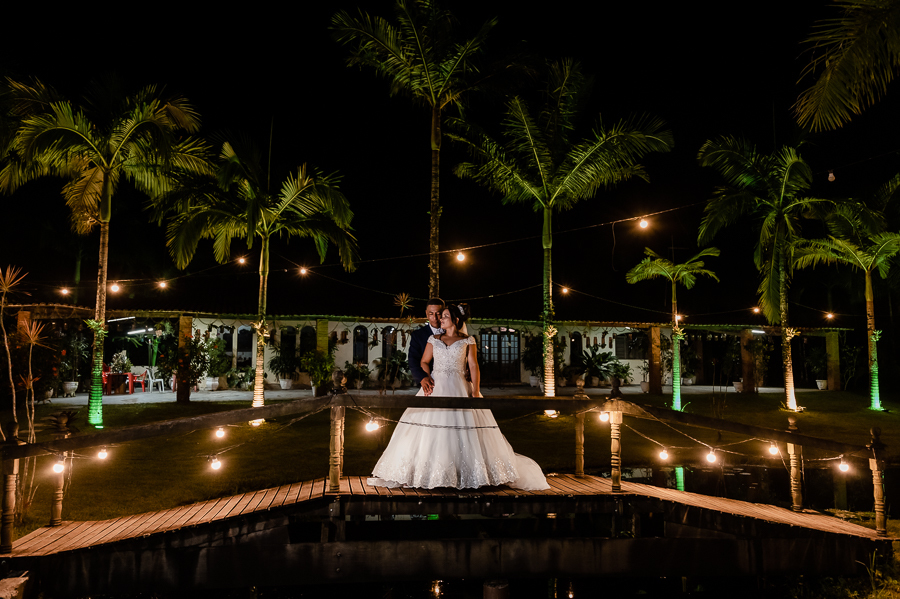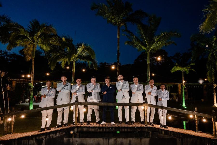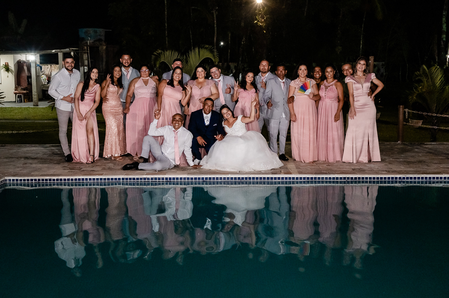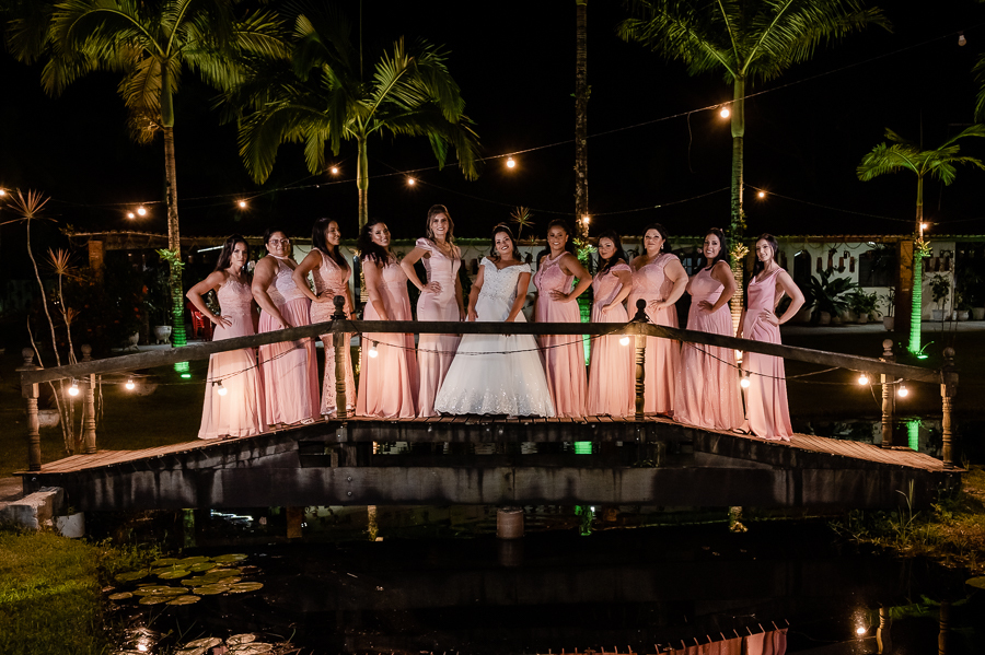 As primeiras fotos no local foram as das madrinhas e padrinhos junto com os noivos, estava uma noite muito quente e todos estavam loucos para trocar de roupa. Fizemos também as fotos na mesa do bolo e depois, um pequeno ensaio pós cerimônia com a Andressa e o Ivaldo.