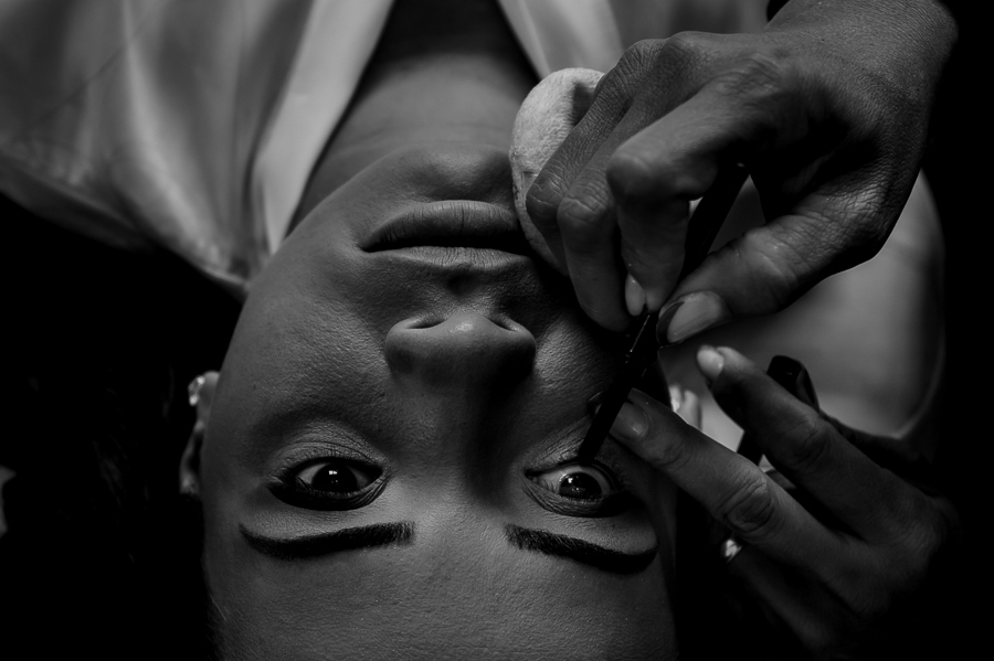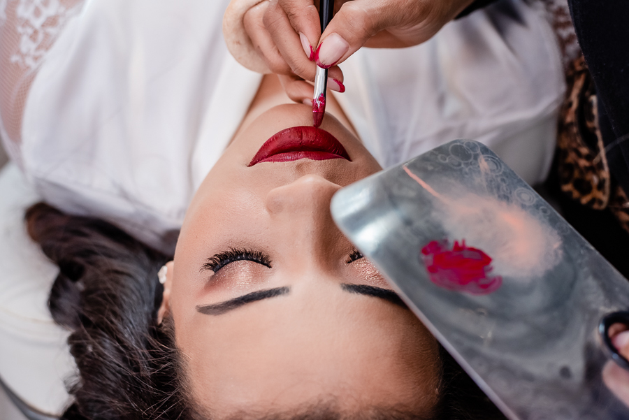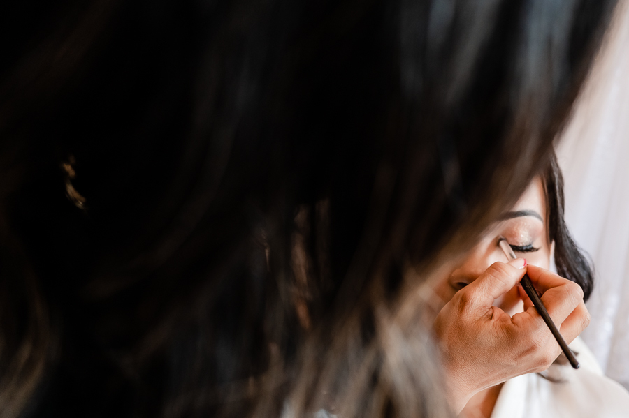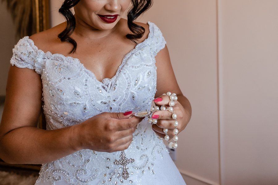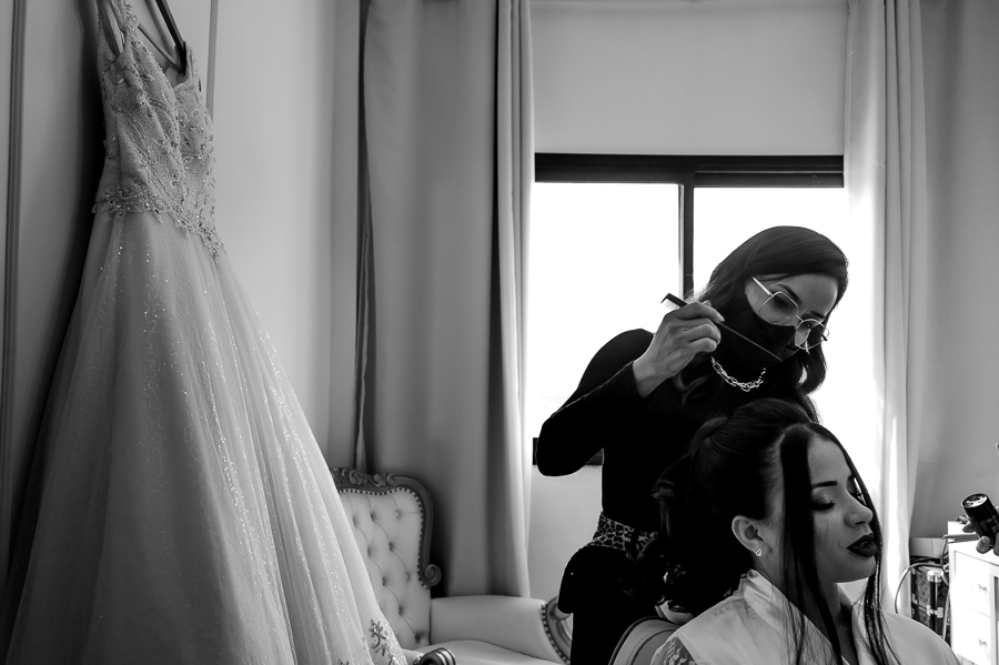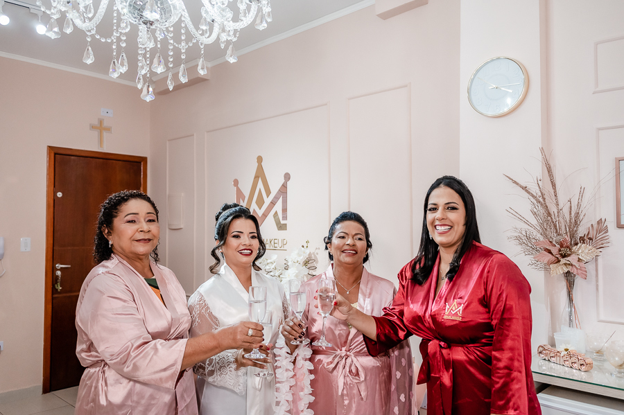 Acompanhamos a preparação da Andressa, no Espaço Angel Makeup, onde ela viveu seus primeiros momentos de emoção ao se ver após a make finalizada, depois vestida de noiva junto com sua mãe, sua sogra e sua cunhada e ao segurar o terço onde colocou a foto de seu falecido pai.
