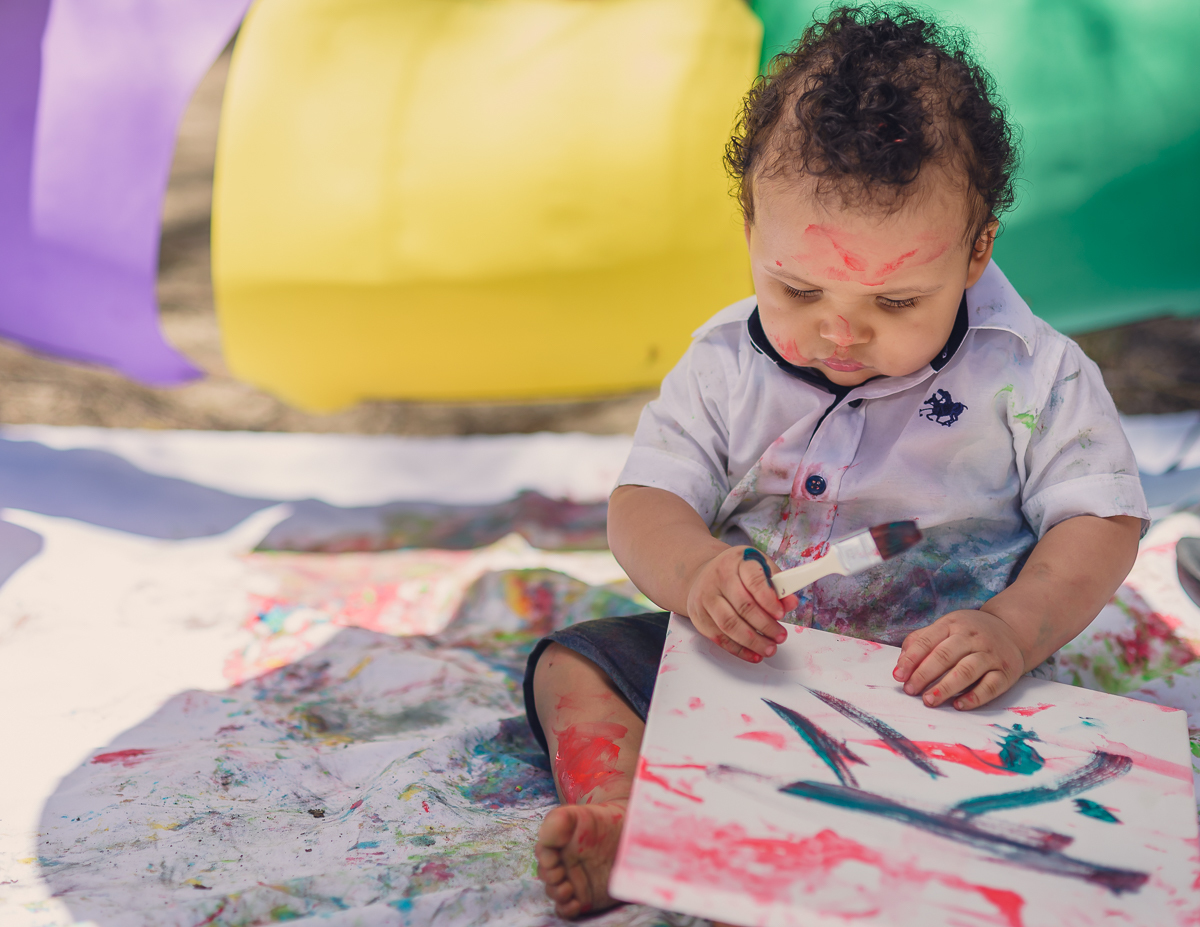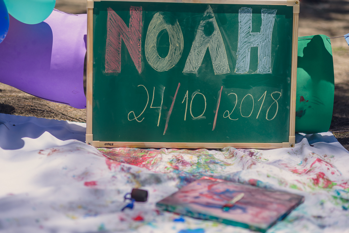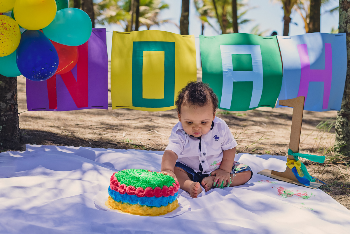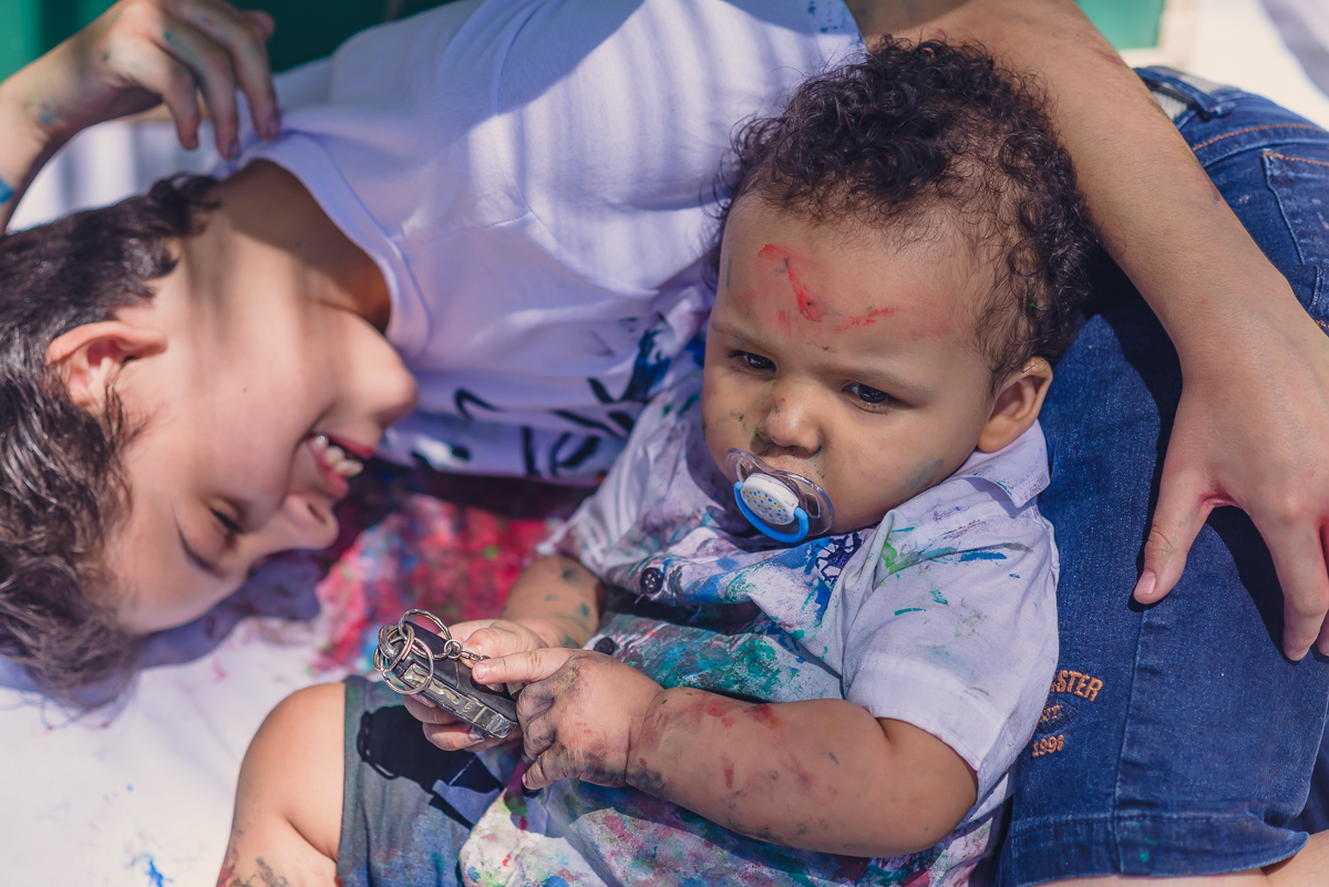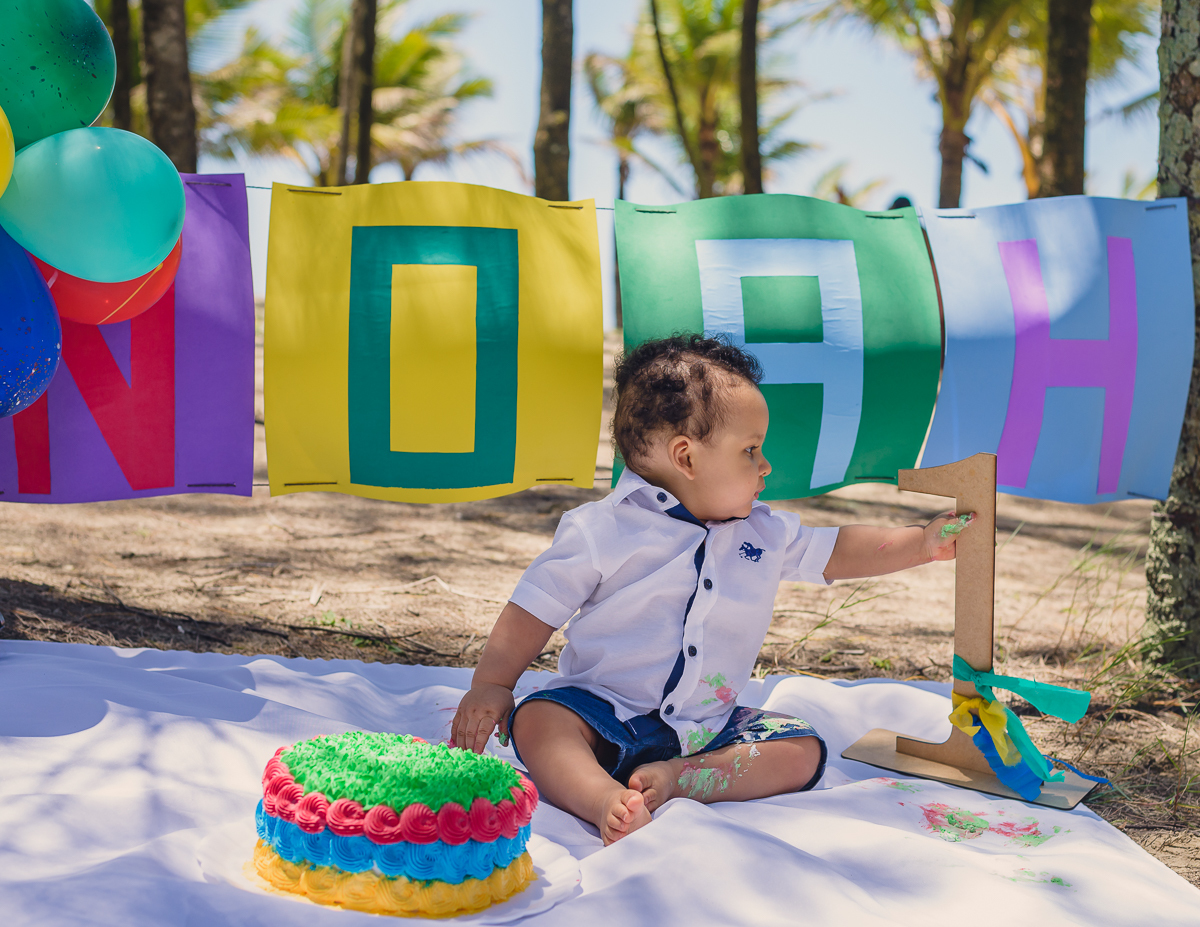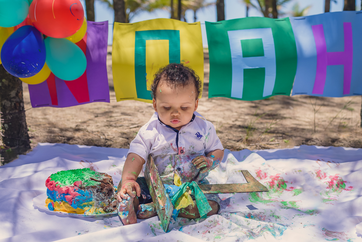 O Noah estava tímido no início mas, muito curioso ele logo começou a interagir com seu bolo, com o cenário e deu muitos sorrisos. Noah recebeu muito carinho do papai e da mamãe e brincou muito com o irmãozão Pedro e com as tintas.