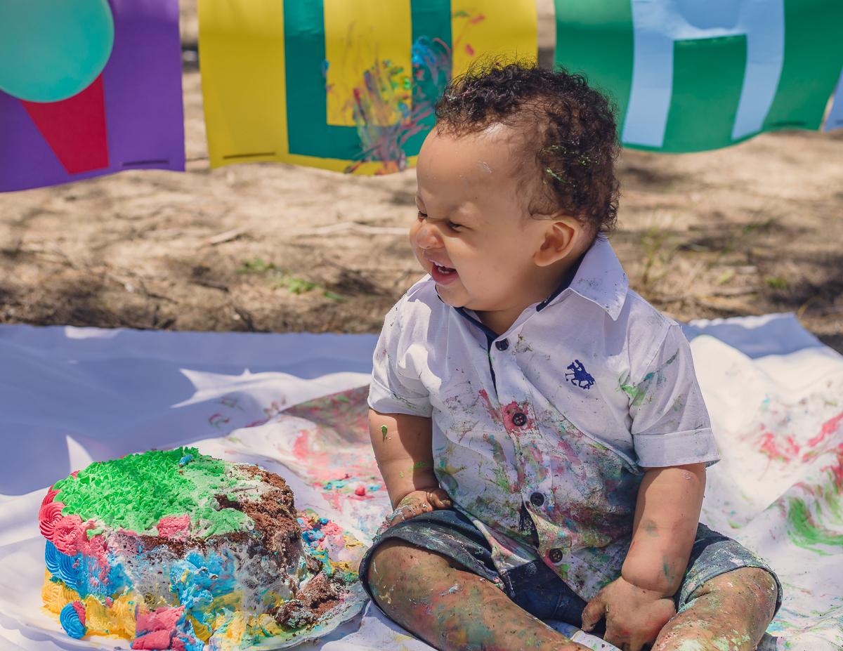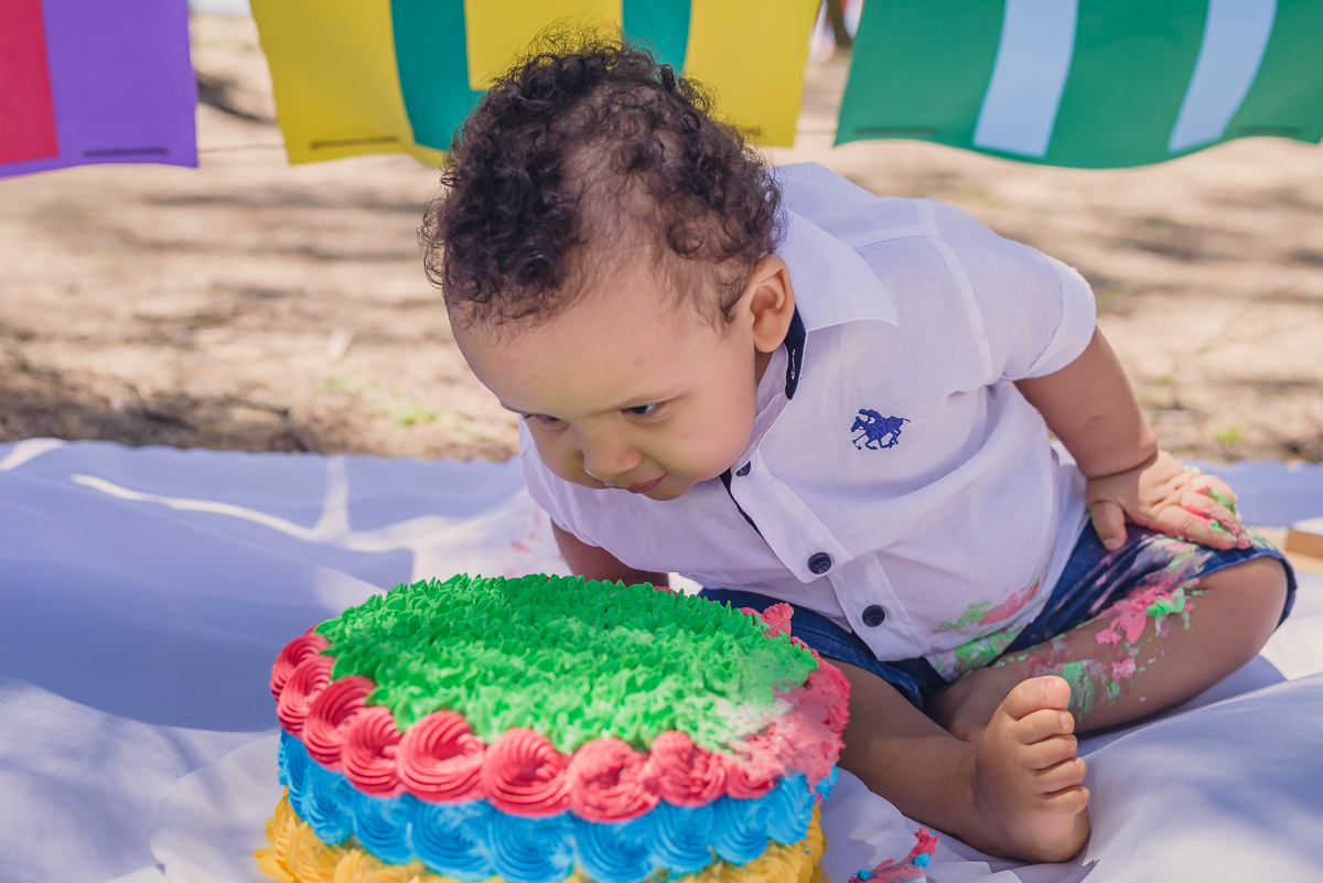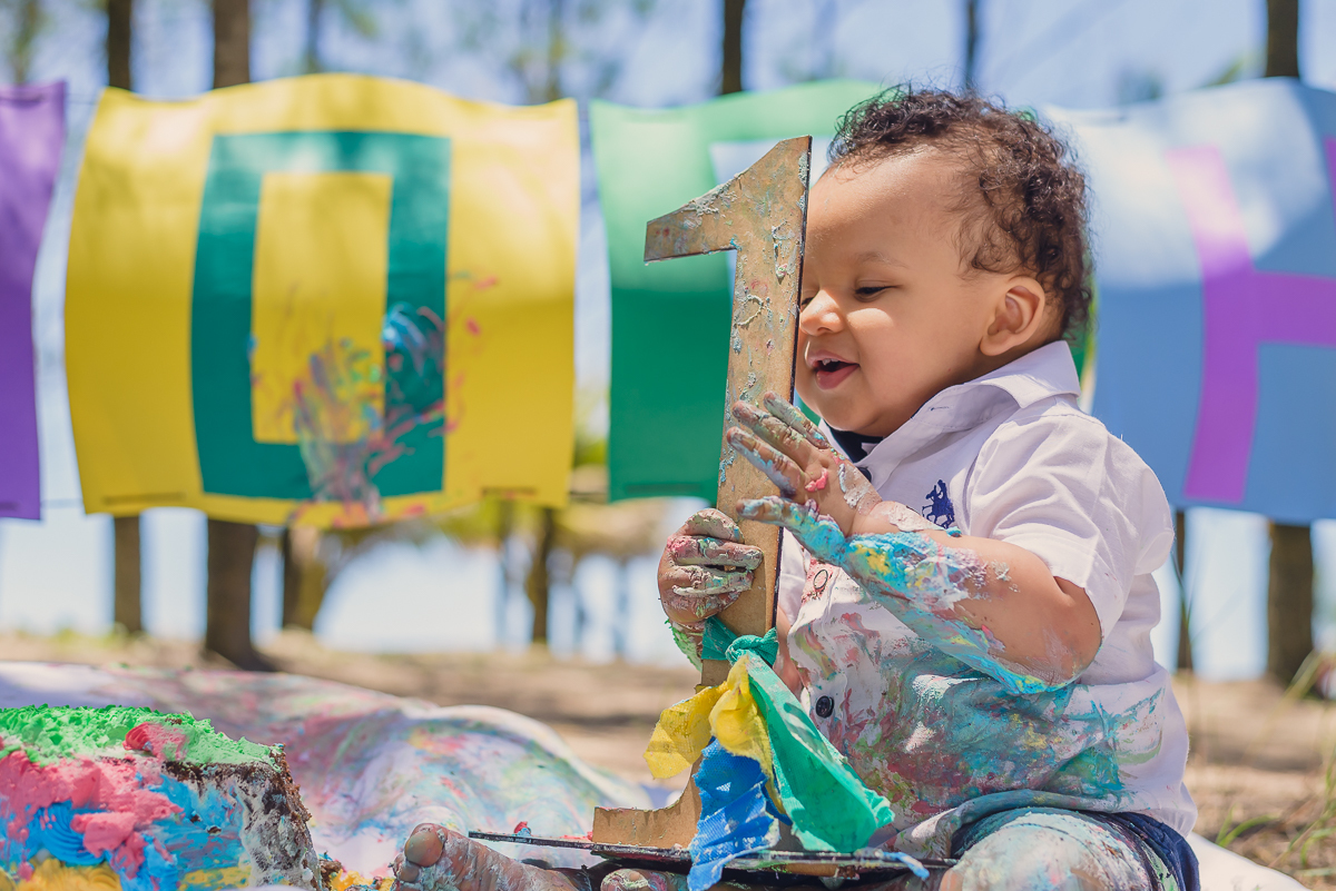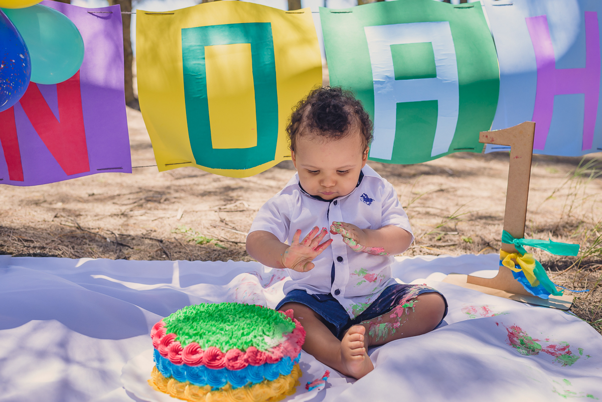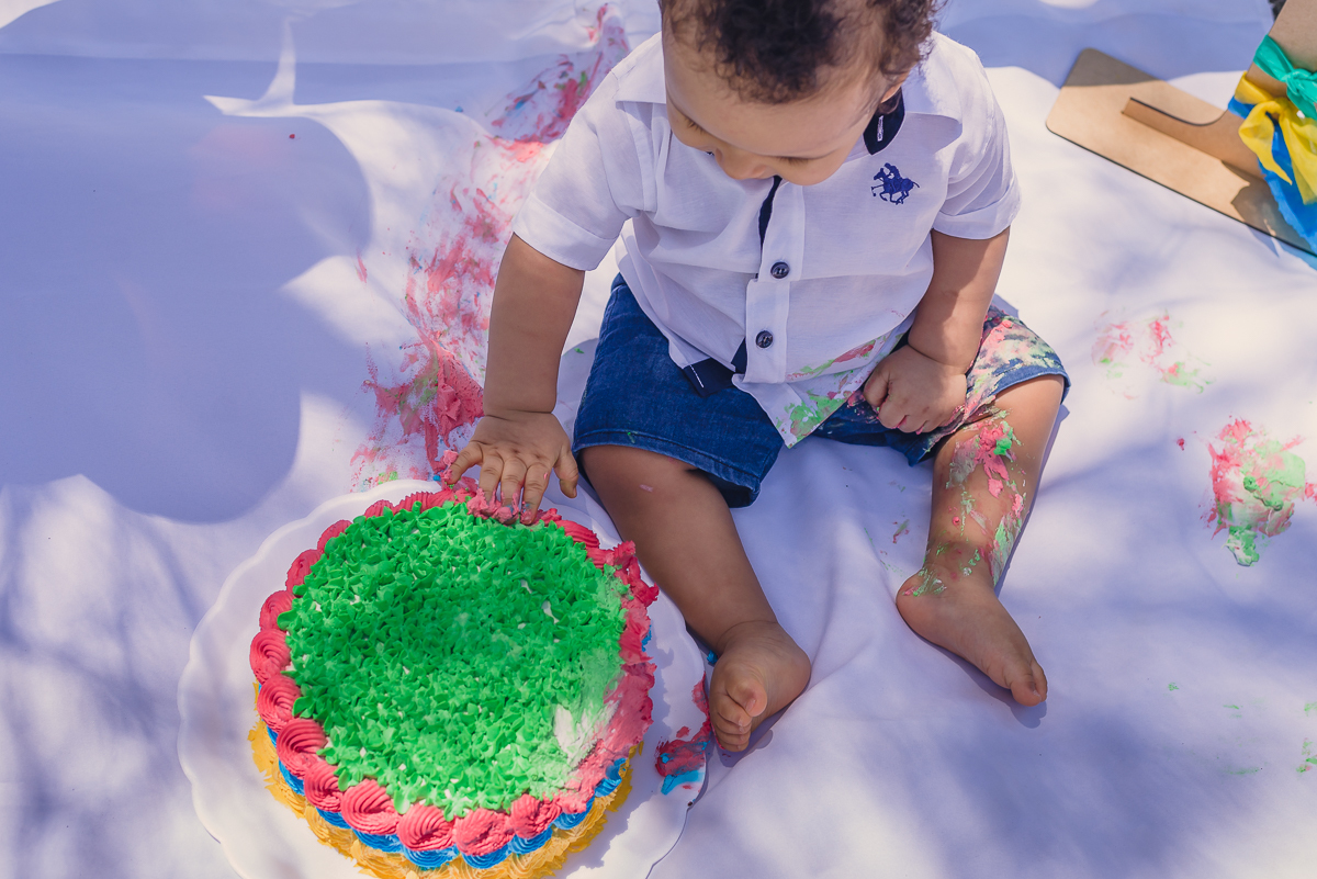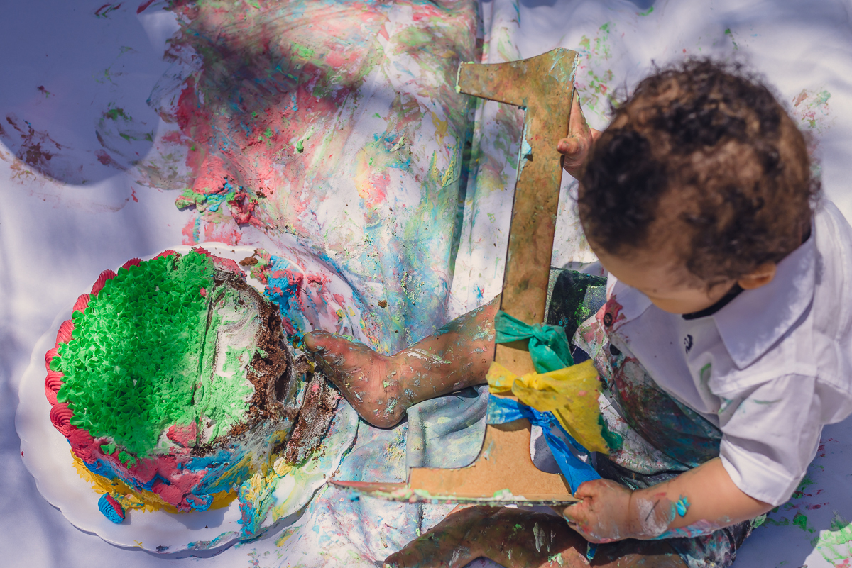 O Noah estava tímido no início mas, muito curioso ele logo começou a interagir com seu bolo, com o cenário e deu muitos sorrisos. Noah recebeu muito carinho do papai e da mamãe e brincou muito com o irmãozão Pedro e com as tintas.