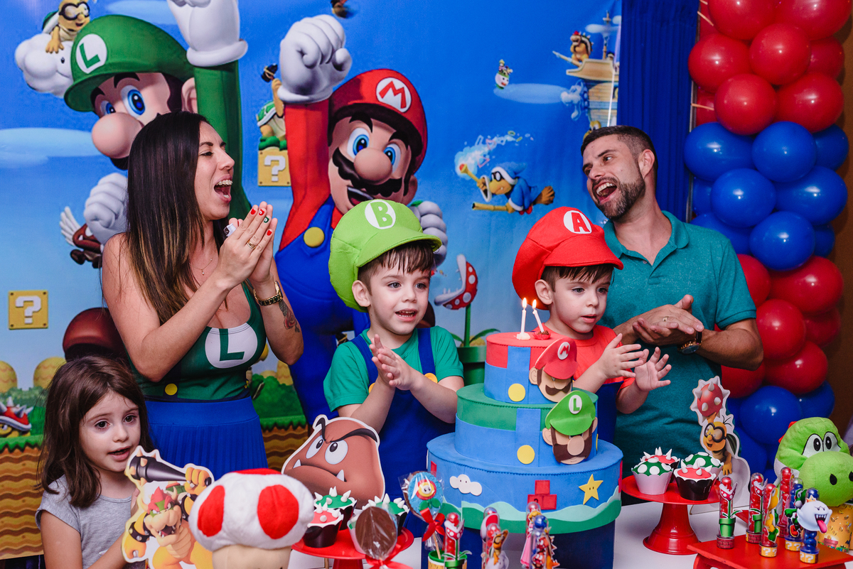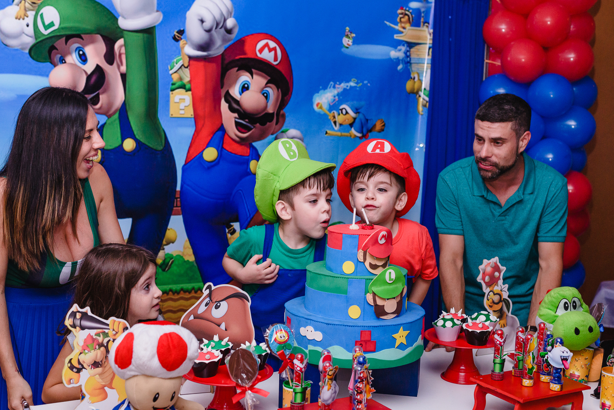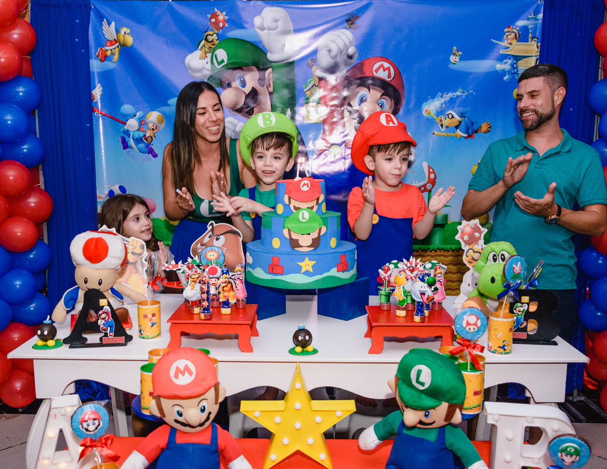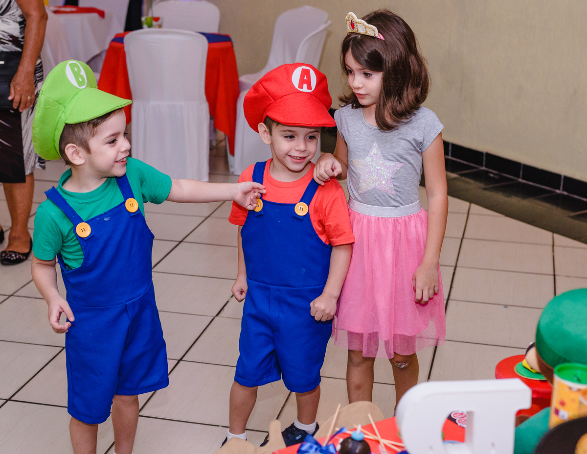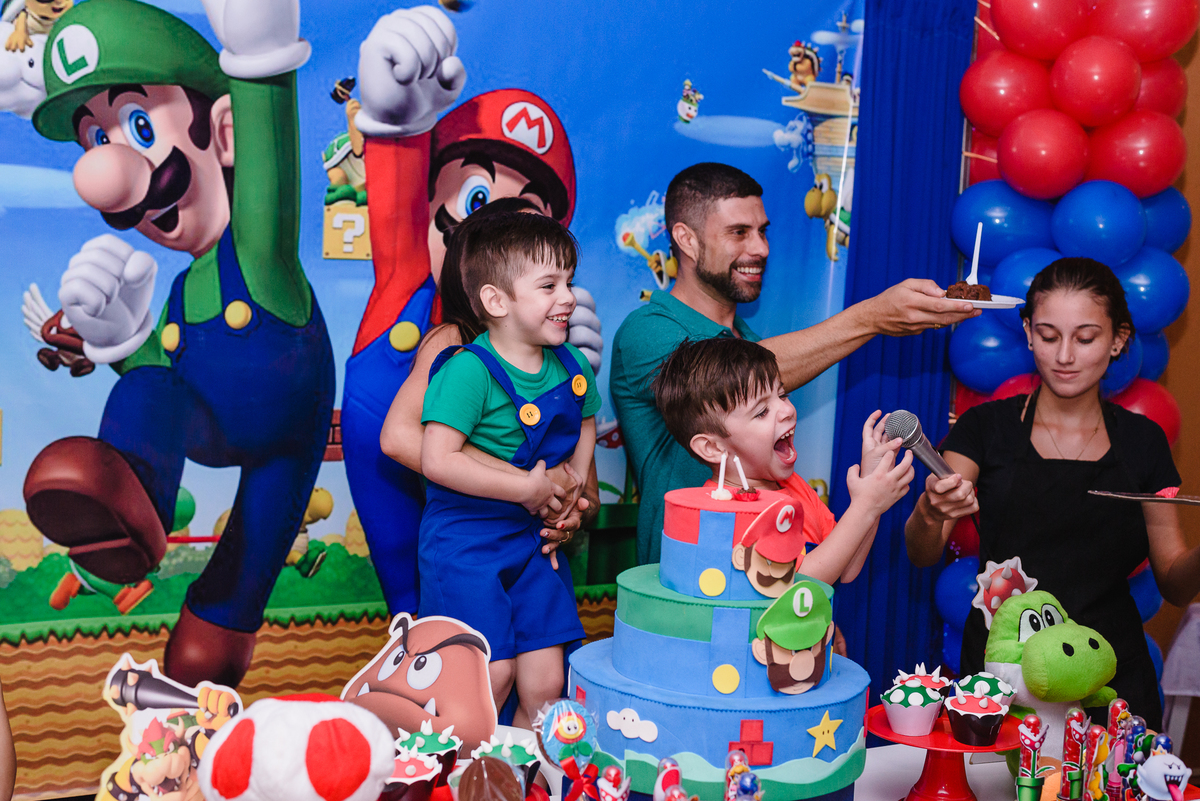 O tema do aniversário este ano, realizado em Praia Grande - SP, foi Mário Bros e Luigi, com direito a fantasia e uma decoração linda! Os meninos brincaram o tempo todo com os amiguinhos, com a prima Maria Clara, a irmã Mirella, o padrinho Luan, que fez a alegria da criançada, e o tio Bubu querido deles.