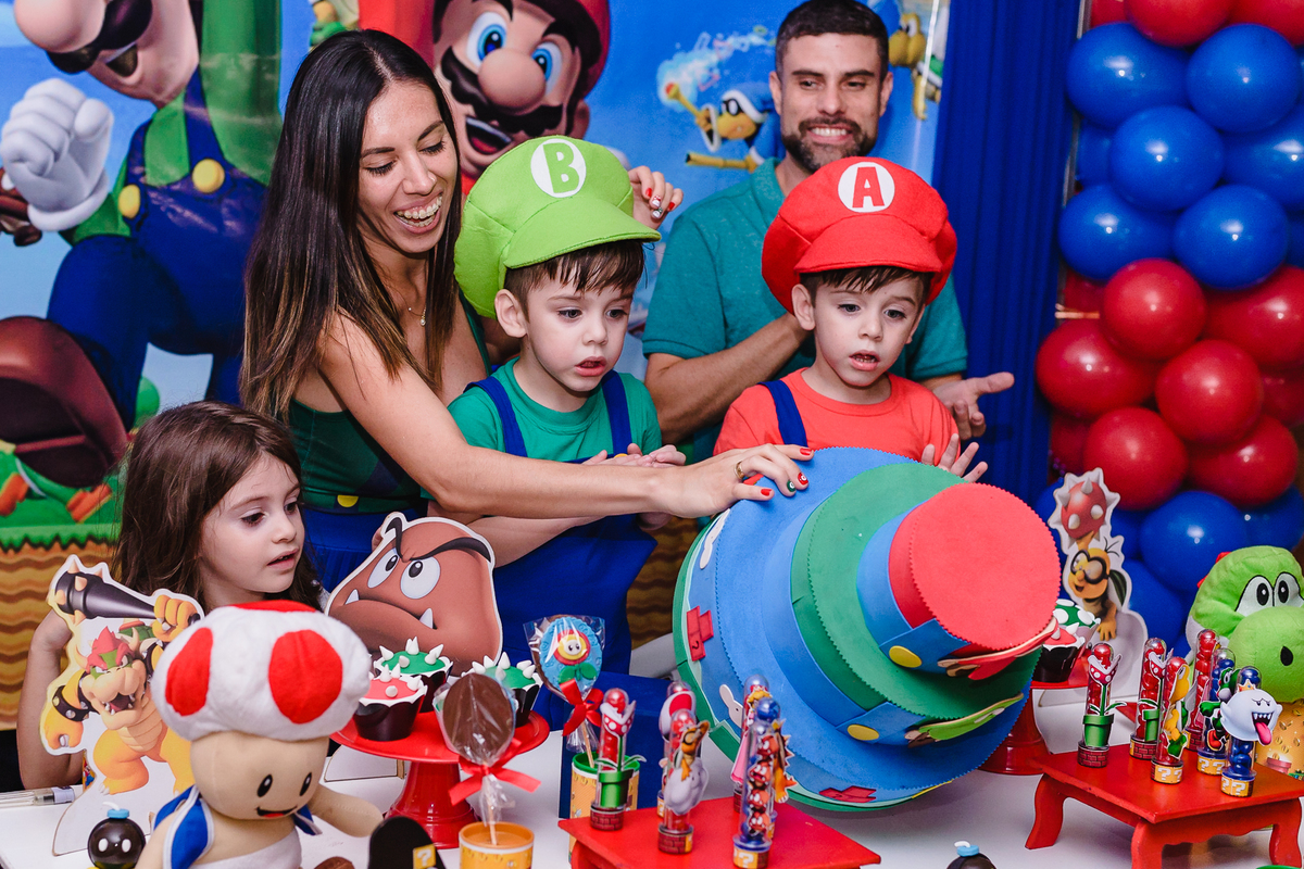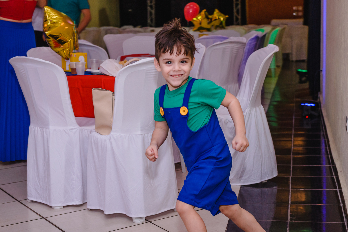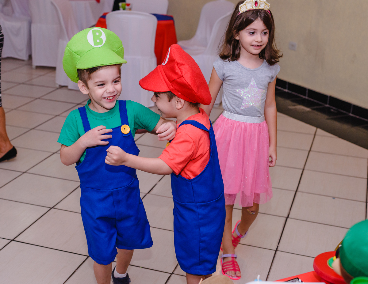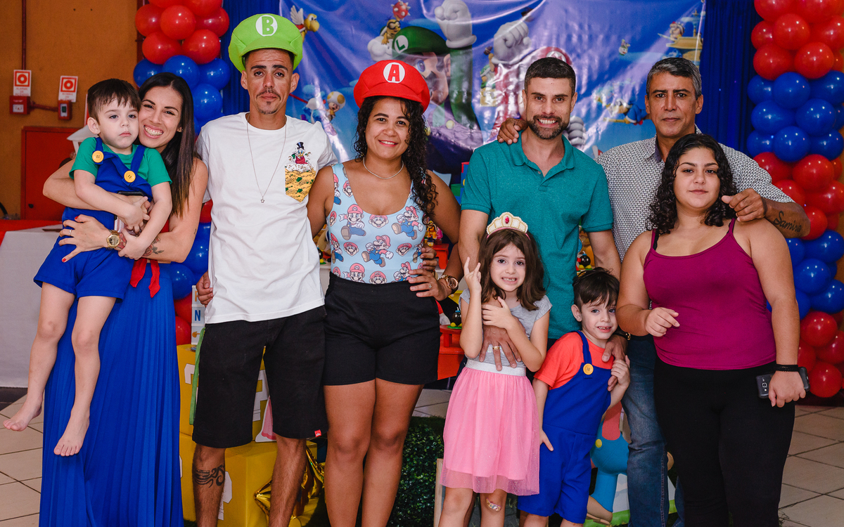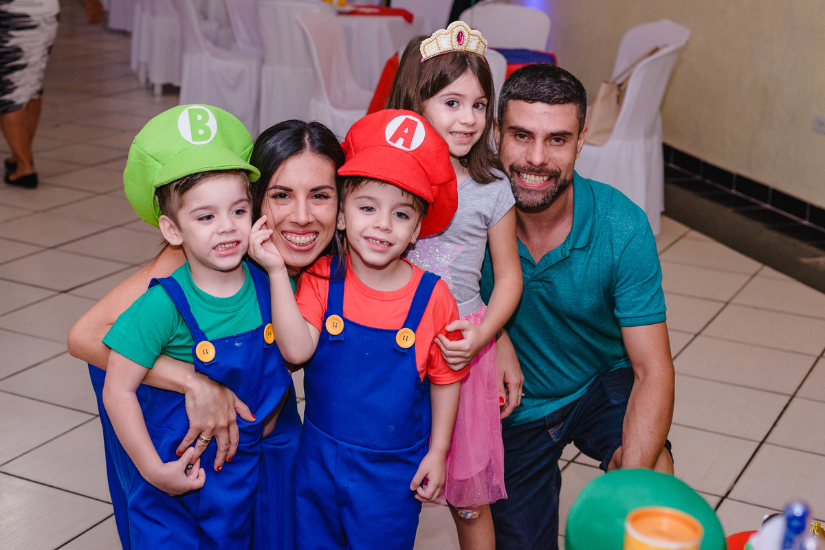 O tema do aniversário este ano, realizado em Praia Grande - SP, foi Mário Bros e Luigi, com direito a fantasia e uma decoração linda! Os meninos brincaram o tempo todo com os amiguinhos, com a prima Maria Clara, a irmã Mirella, o padrinho Luan, que fez a alegria da criançada, e o tio Bubu querido deles.