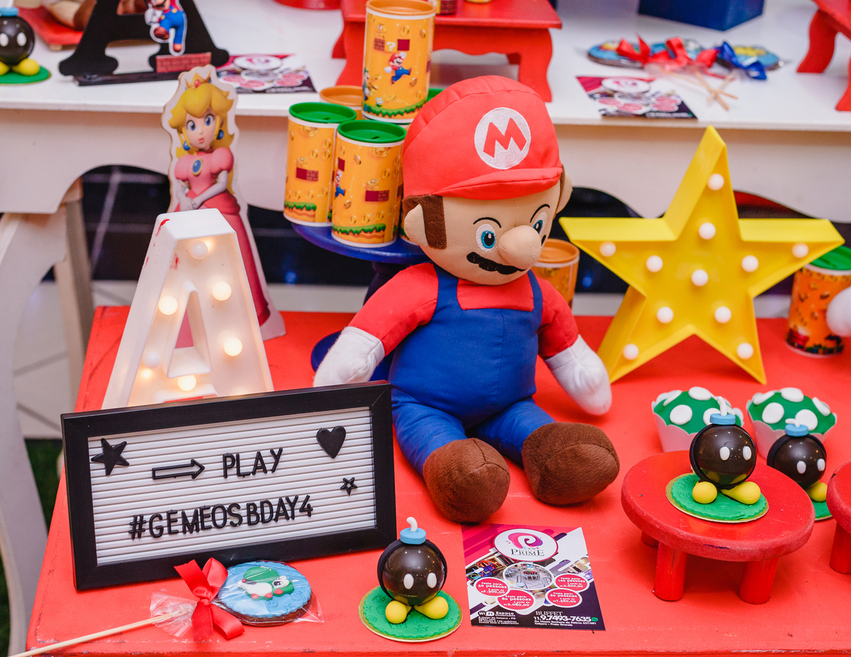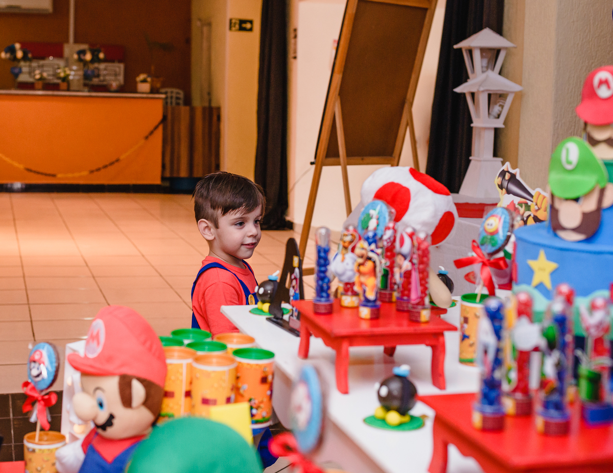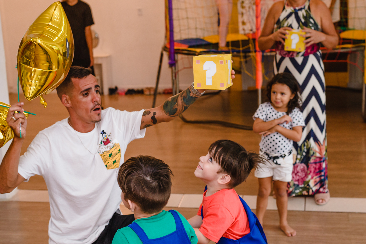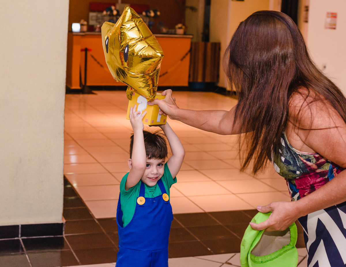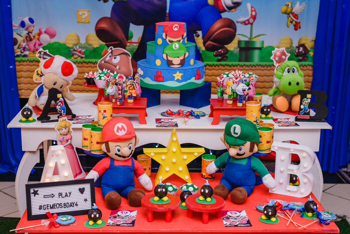 O tema do aniversário este ano, realizado em Praia Grande - SP, foi Mário Bros e Luigi, com direito a fantasia e uma decoração linda! Os meninos brincaram o tempo todo com os amiguinhos, com a prima Maria Clara, a irmã Mirella, o padrinho Luan, que fez a alegria da criançada, e o tio Bubu querido deles.