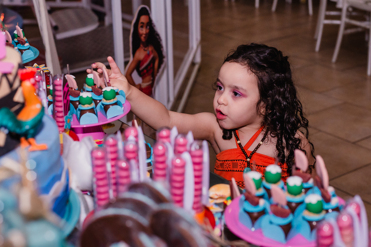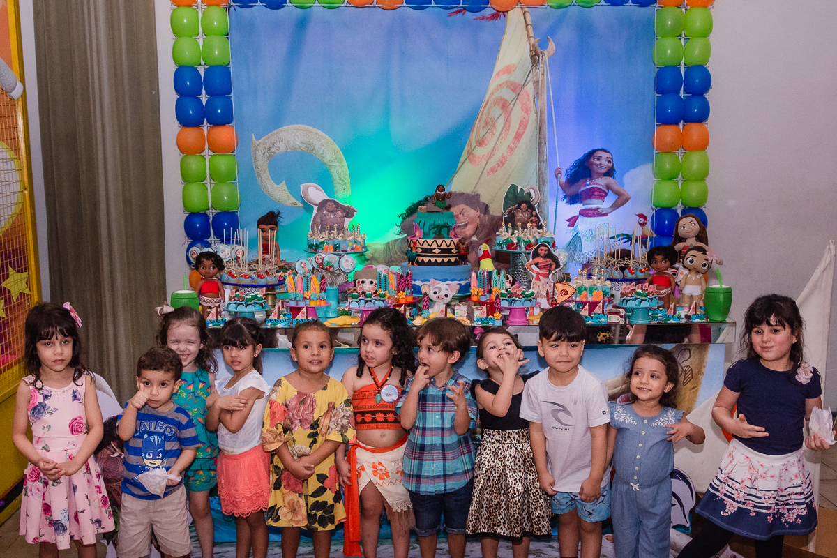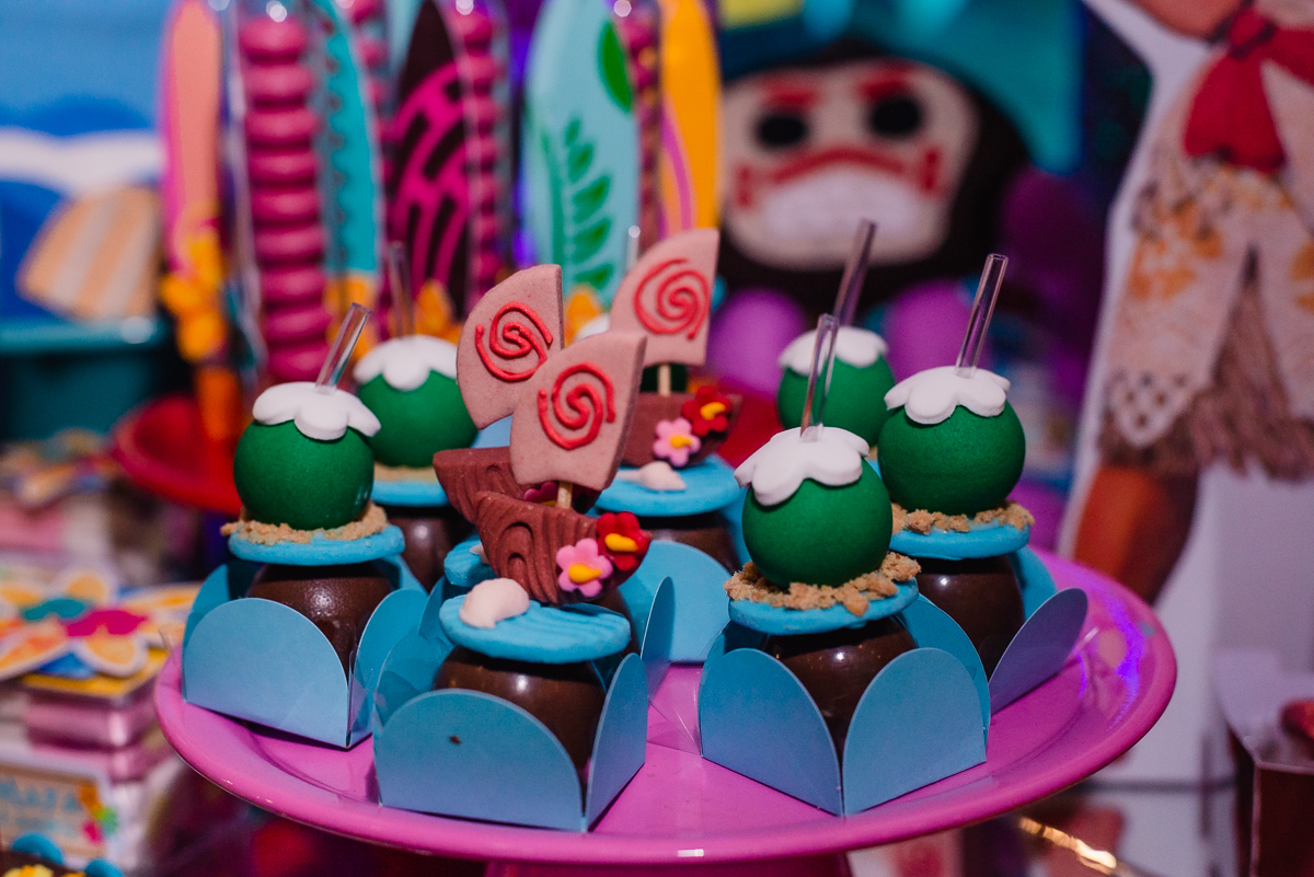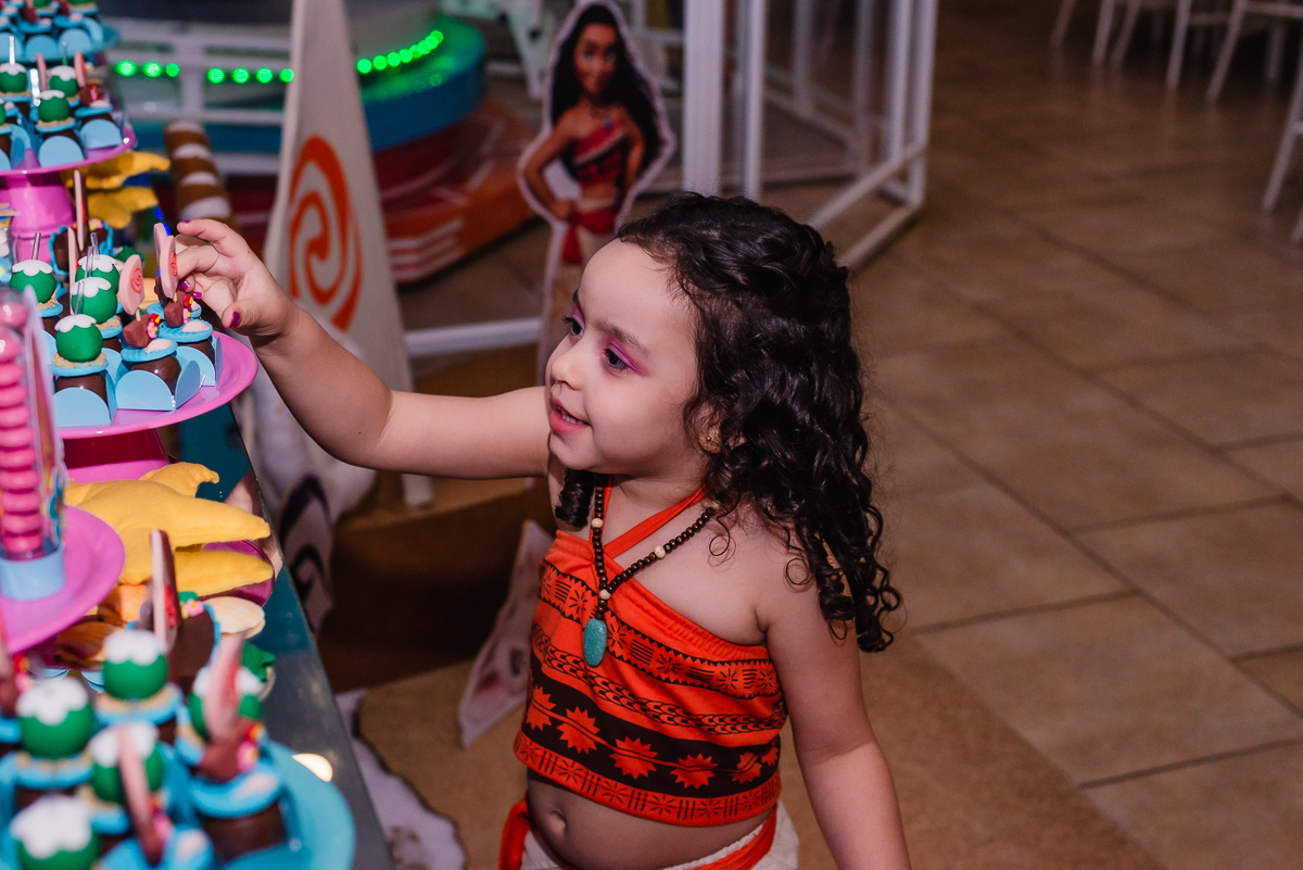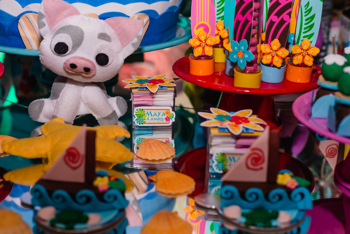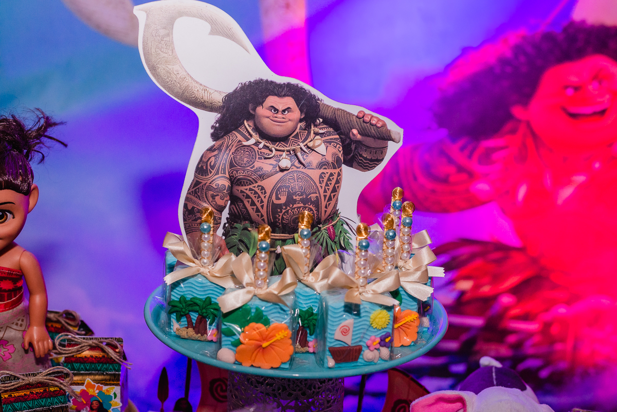 A Maya veio toda no estilo de Moana, um dos seus desenhos prediletos e pode contemplar uma mesa temática do mesmo desenho realizado no Buffet Magic Time, na cidade de Praia Grande - SP.