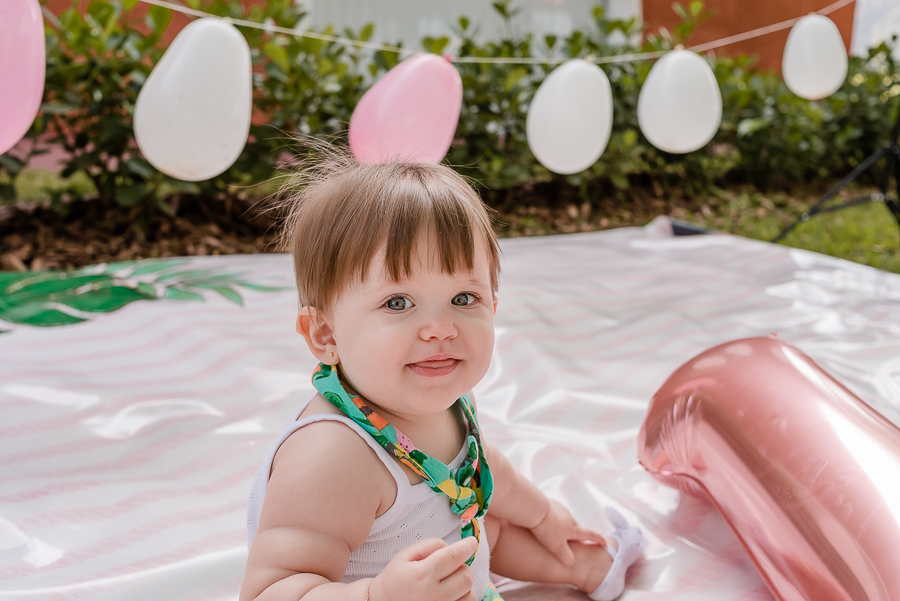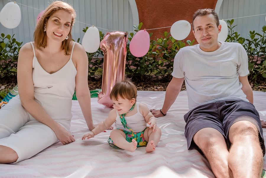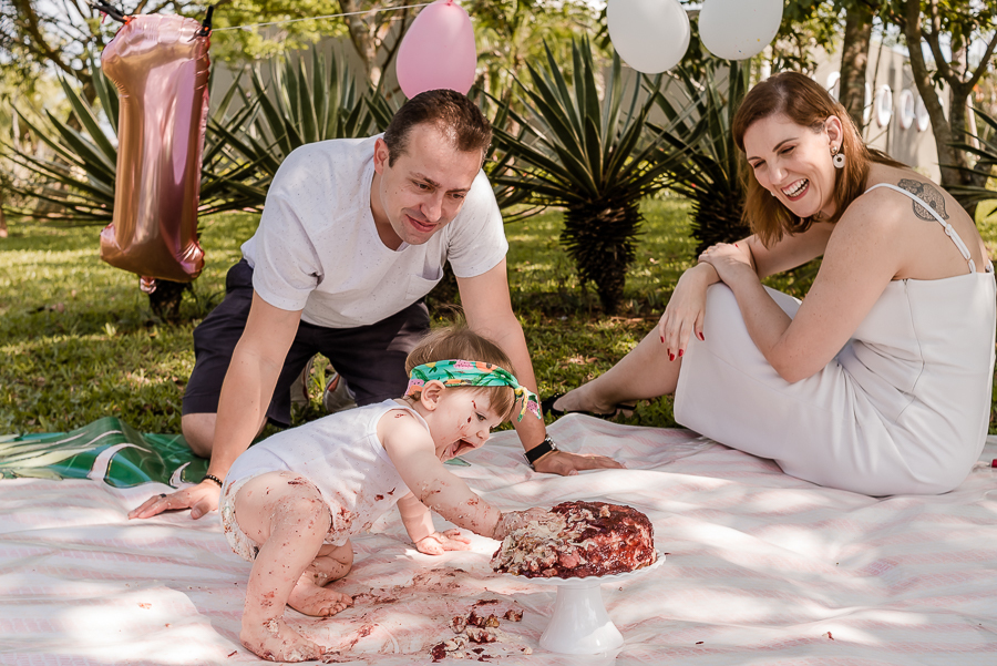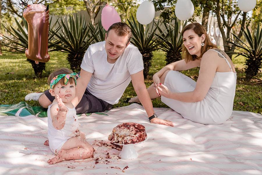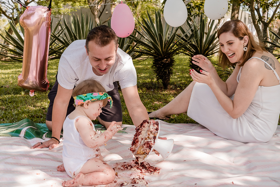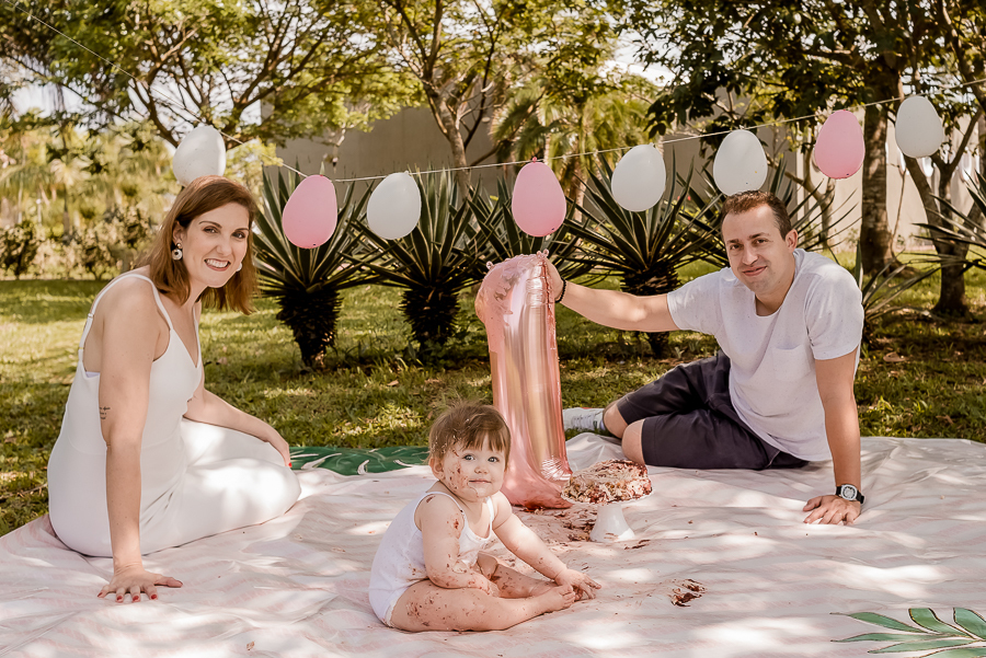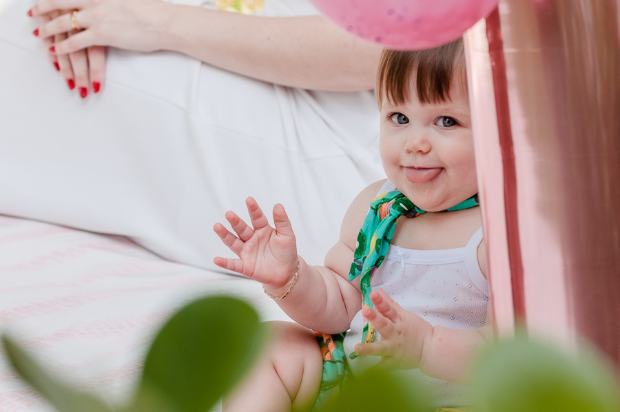 A Alice brincou com os balões, deu carinho na mamãe e no papai e aproveitou seu momento com um bolo inteirinho para ela. Foi uma farra só!