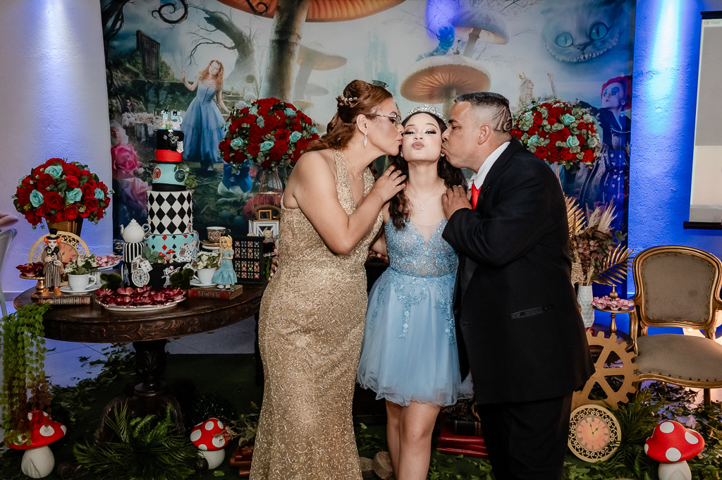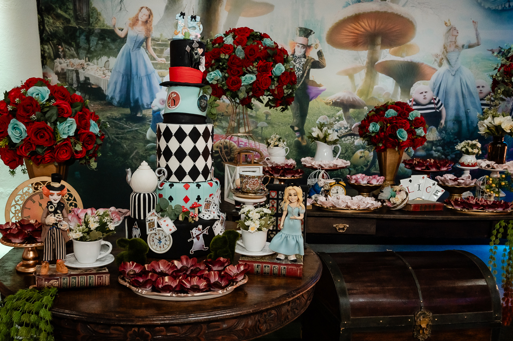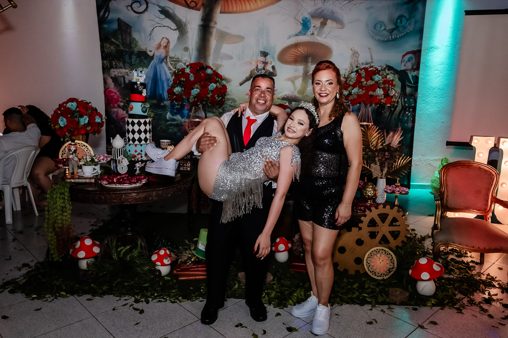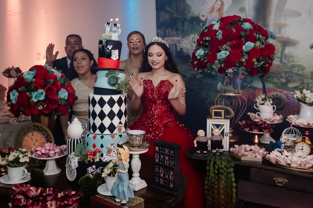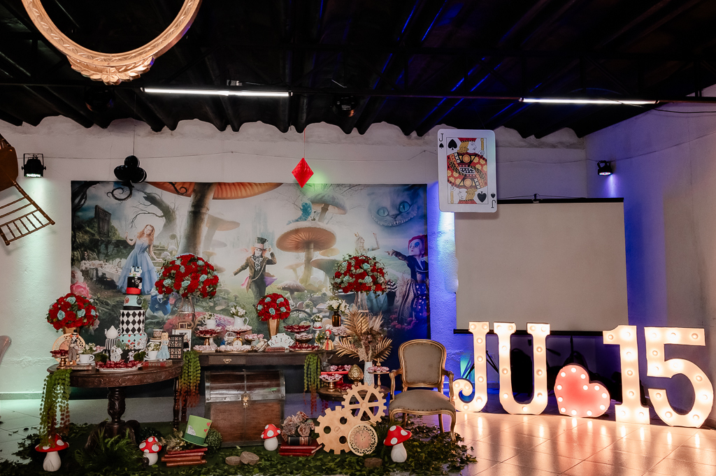 O aniversário de 15 anos da Júlia foi realizado no espaço Arco-Íris, em Praia Grande - SP. O tema escolhido foi "Alice no País das Maravilhas" e a decoração estava simplesmente incrível e rica em detalhes.