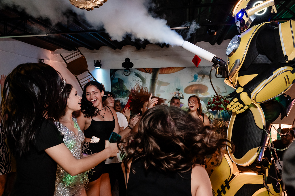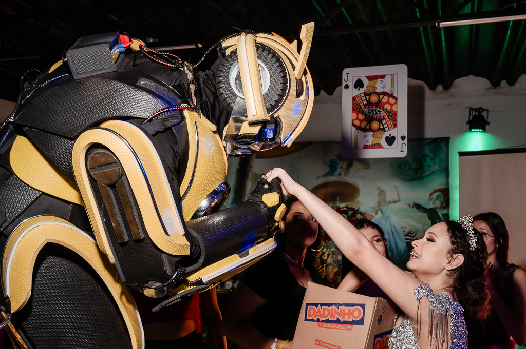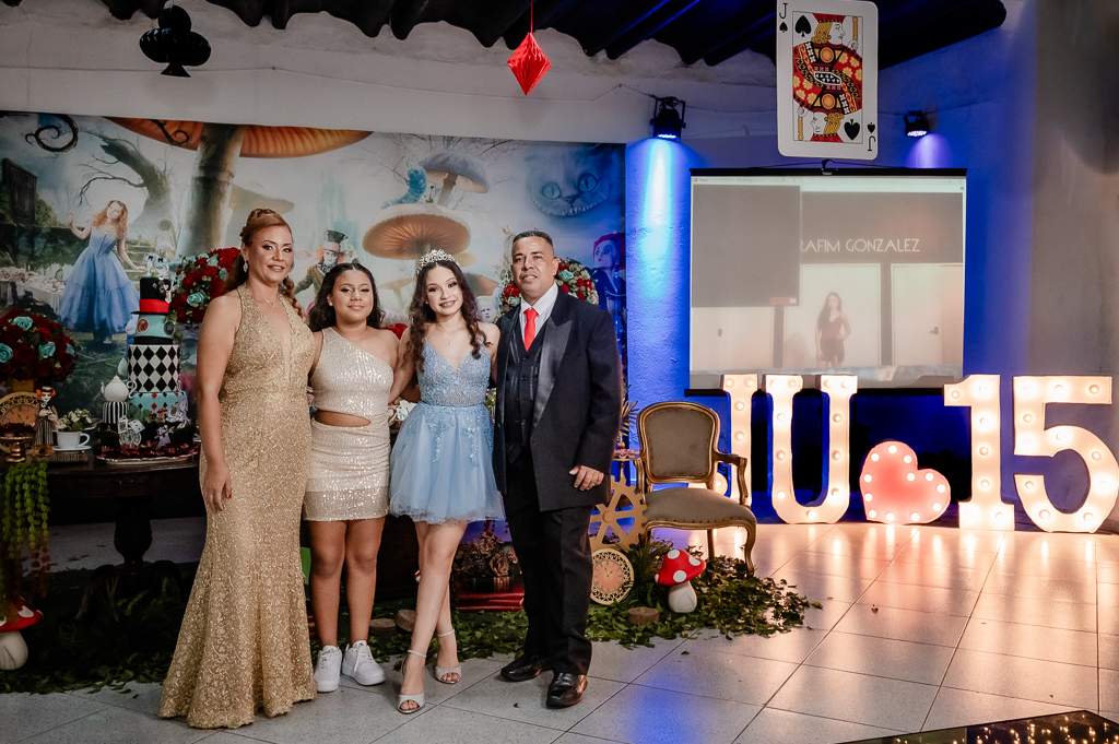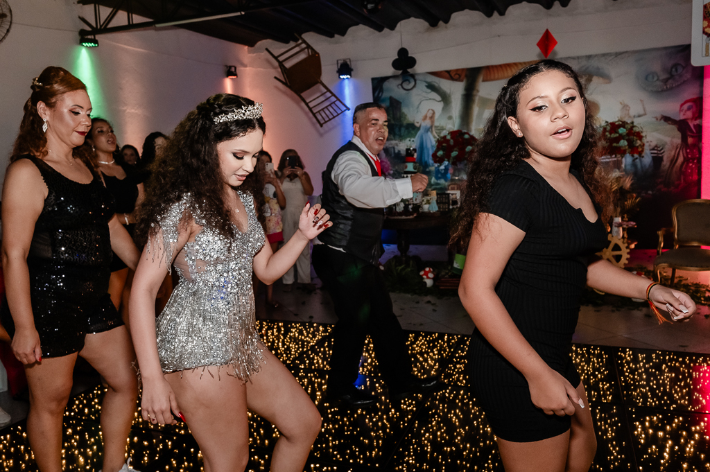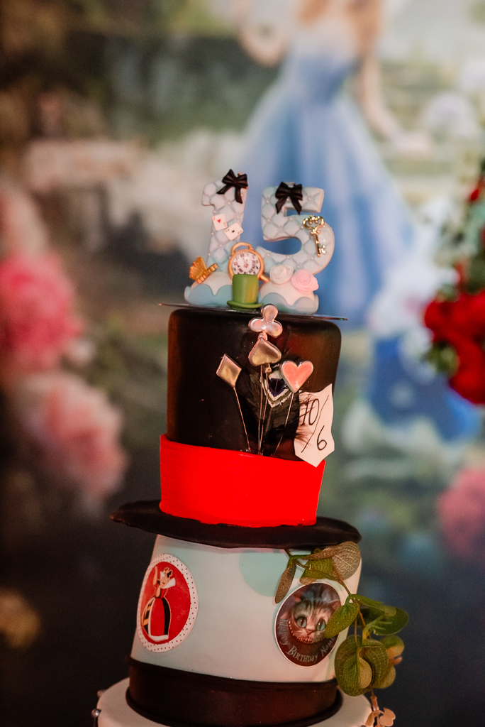 O aniversário de 15 anos da Júlia foi realizado no espaço Arco-Íris, em Praia Grande - SP. O tema escolhido foi "Alice no País das Maravilhas" e a decoração estava simplesmente incrível e rica em detalhes.