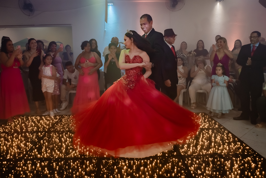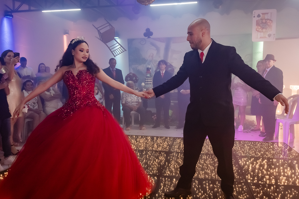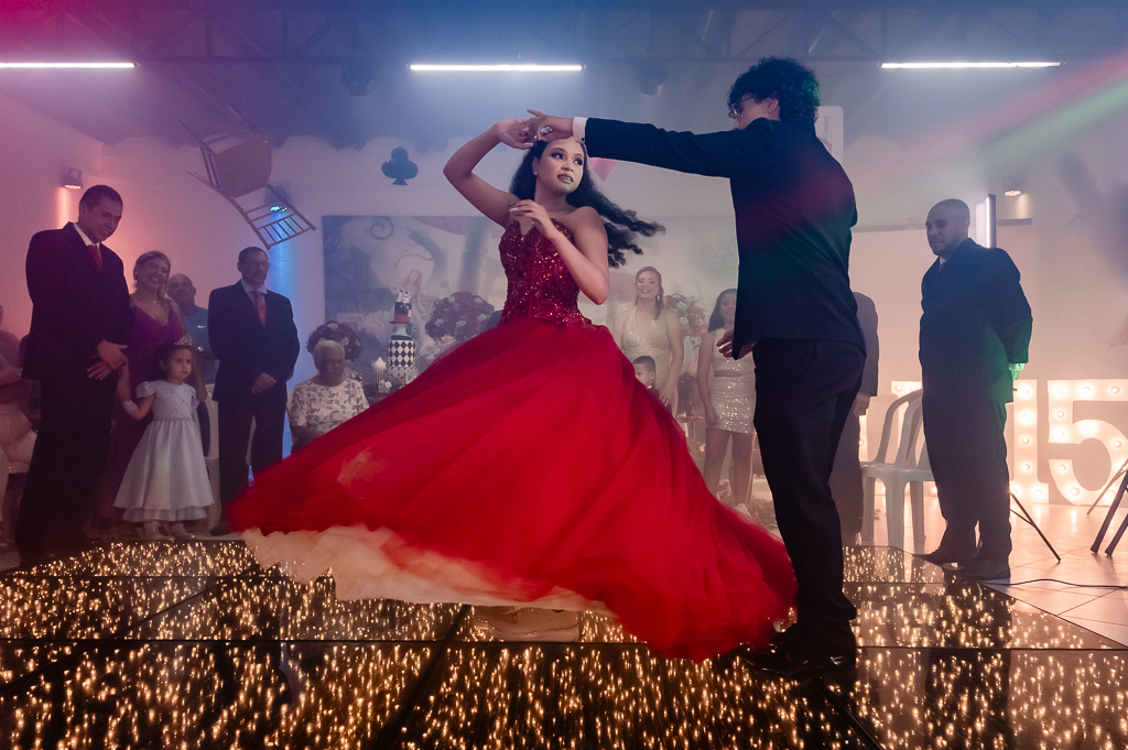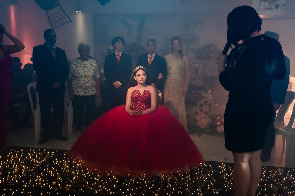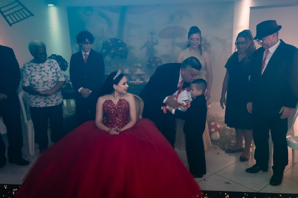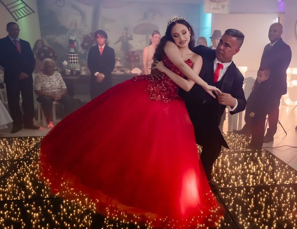 Logo chegou o momento do cerimonial e troca de sapato feita pelo pai da Júlia. Ela fez a troca de vestido e apareceu em um lindo vestido vermelho, no verdadeiro estilo princesa. Seus pais, avós, seu primo, padrinho e namorado, participaram da cerimônia onde aconteceu a troca de sapatos, feita pelo pai e claro, a valsa com seus protetores (pai, avô, primo, namorado e padrinho). Foram momentos emocionantes para todos enquanto a celebrante ia narrando um pouquinho da história da Júlia, de sua família e de seu sonho de viver esse dia tão importante.