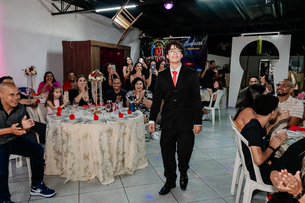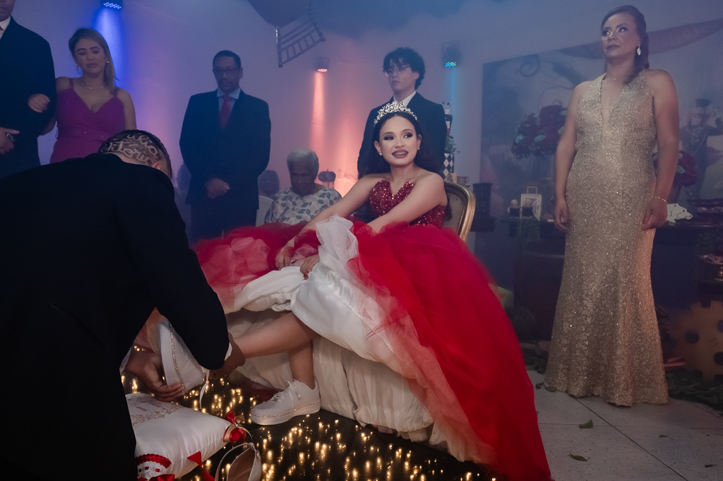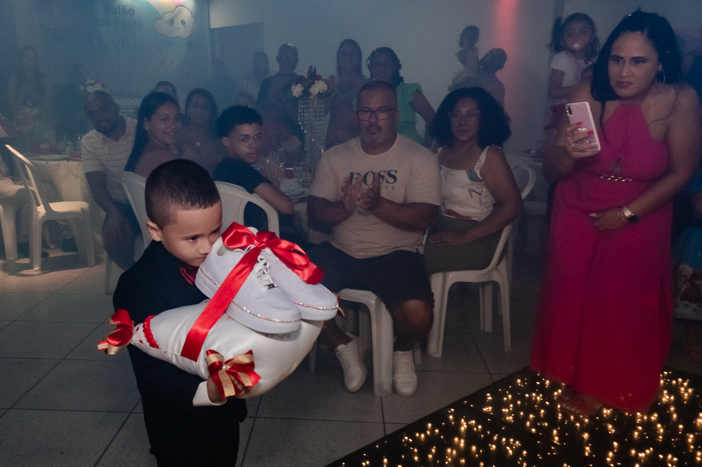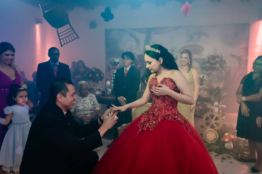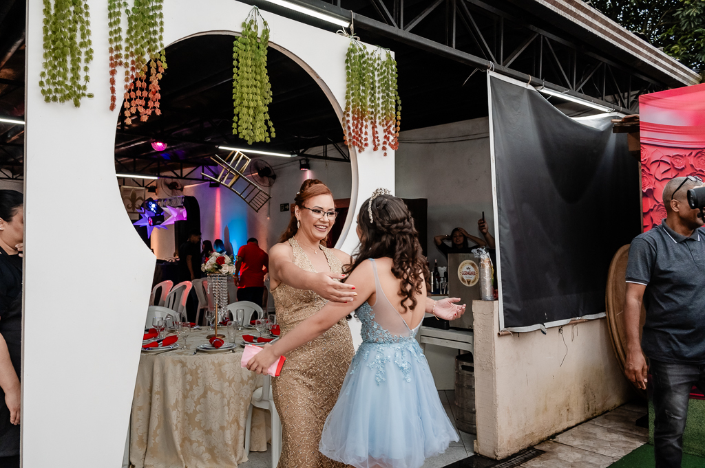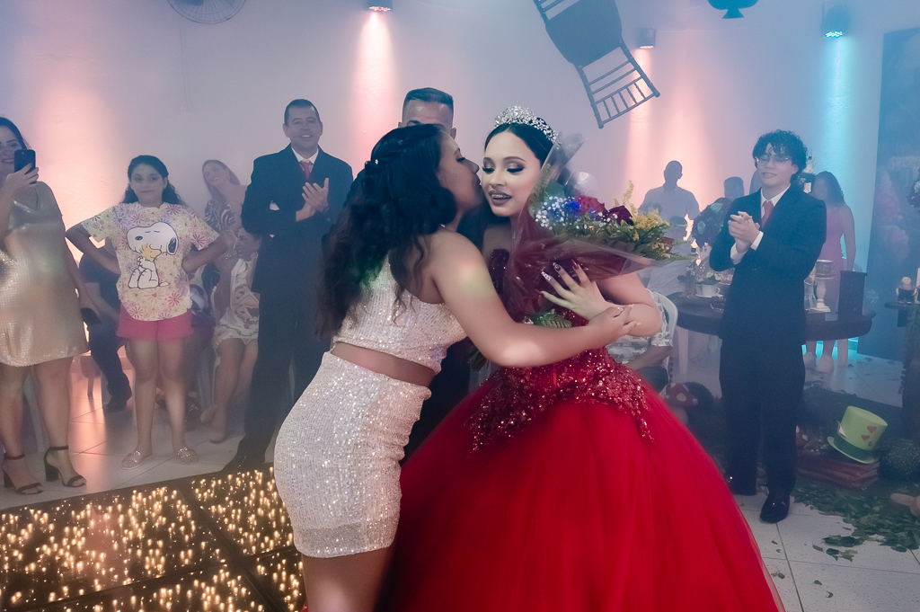 Logo chegou o momento do cerimonial e troca de sapato feita pelo pai da Júlia. Ela fez a troca de vestido e apareceu em um lindo vestido vermelho, no verdadeiro estilo princesa. Seus pais, avós, seu primo, padrinho e namorado, participaram da cerimônia onde aconteceu a troca de sapatos, feita pelo pai e claro, a valsa com seus protetores (pai, avô, primo, namorado e padrinho). Foram momentos emocionantes para todos enquanto a celebrante ia narrando um pouquinho da história da Júlia, de sua família e de seu sonho de viver esse dia tão importante.
