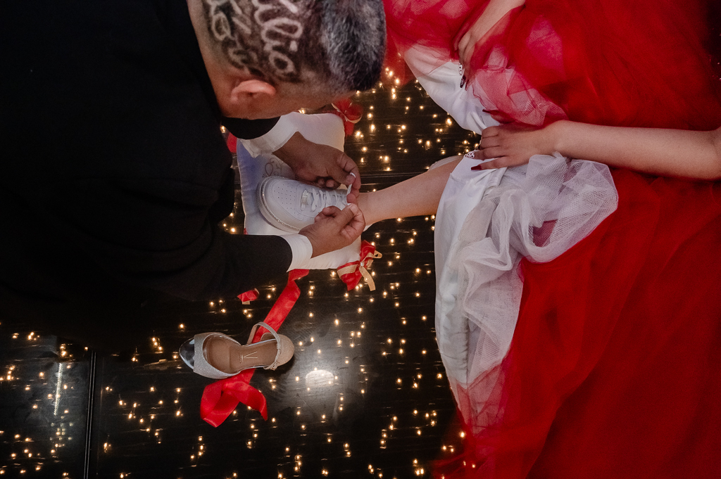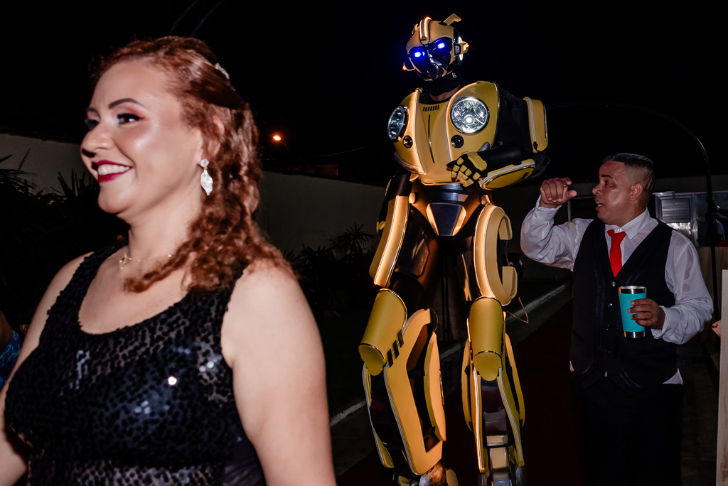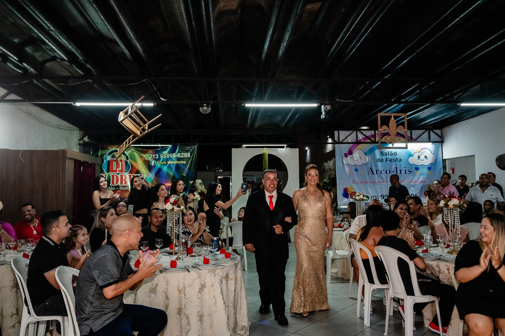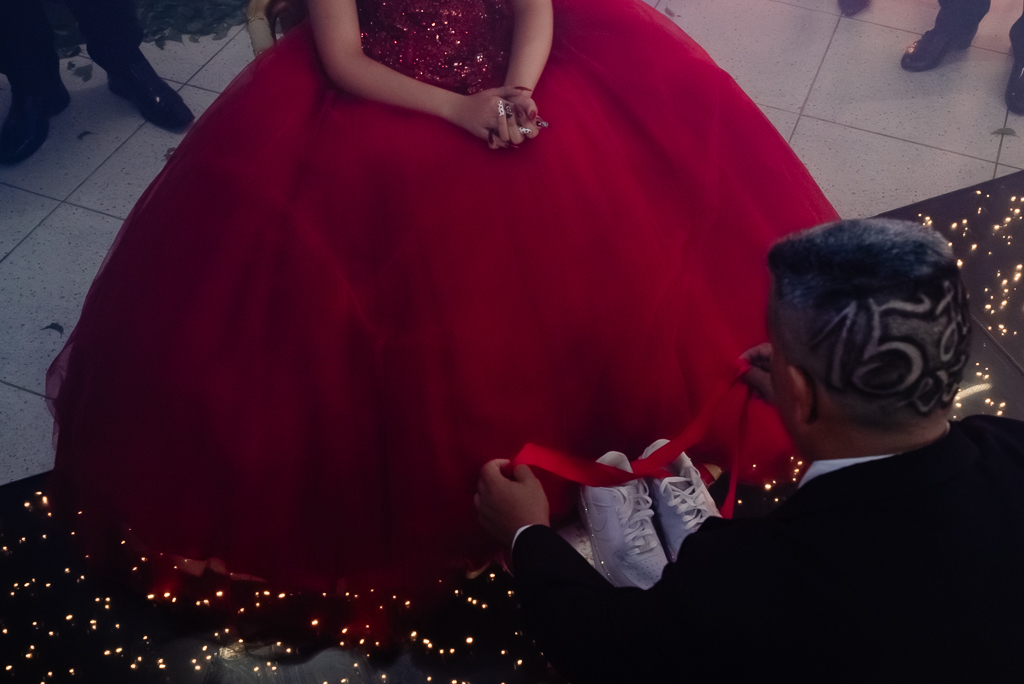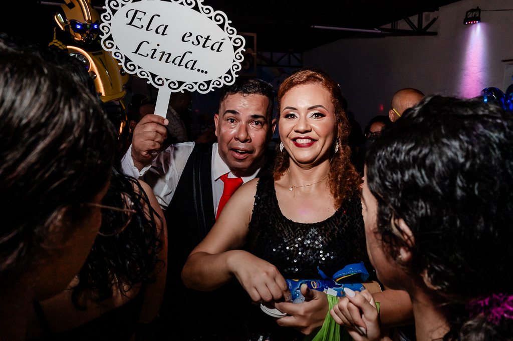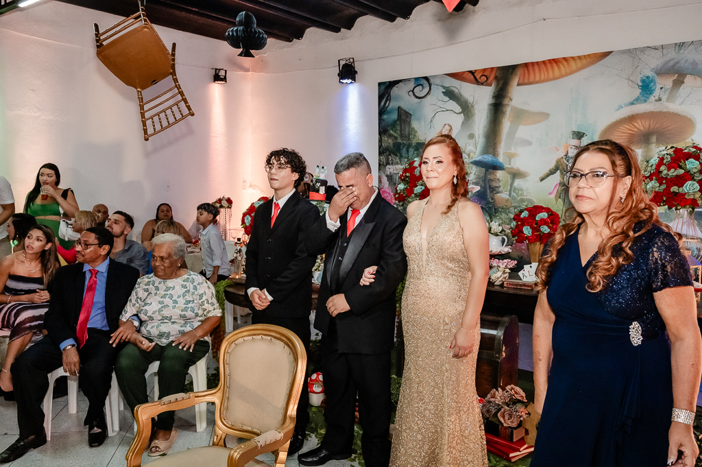 Logo chegou o momento do cerimonial e troca de sapato feita pelo pai da Júlia. Ela fez a troca de vestido e apareceu em um lindo vestido vermelho, no verdadeiro estilo princesa. Seus pais, avós, seu primo, padrinho e namorado, participaram da cerimônia onde aconteceu a troca de sapatos, feita pelo pai e claro, a valsa com seus protetores (pai, avô, primo, namorado e padrinho). Foram momentos emocionantes para todos enquanto a celebrante ia narrando um pouquinho da história da Júlia, de sua família e de seu sonho de viver esse dia tão importante.