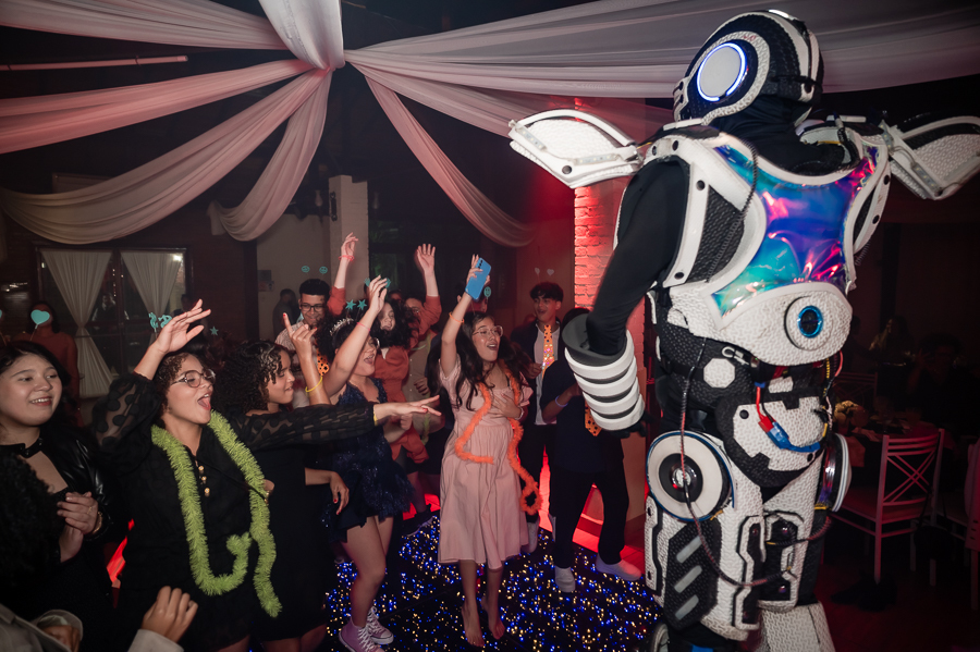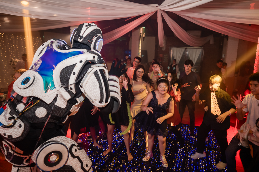 Mas o destaque da noite foi a sua entrada surpreendente: Vitória iniciou a balada de uma forma única, tocando bateria. Essa apresentação poderosa deu o tom para uma noite de muita animação, celebrando sua personalidade marcante e seu talento, com direito a Robô surpresa ao final de uma festa vibrante e cheia de energia!