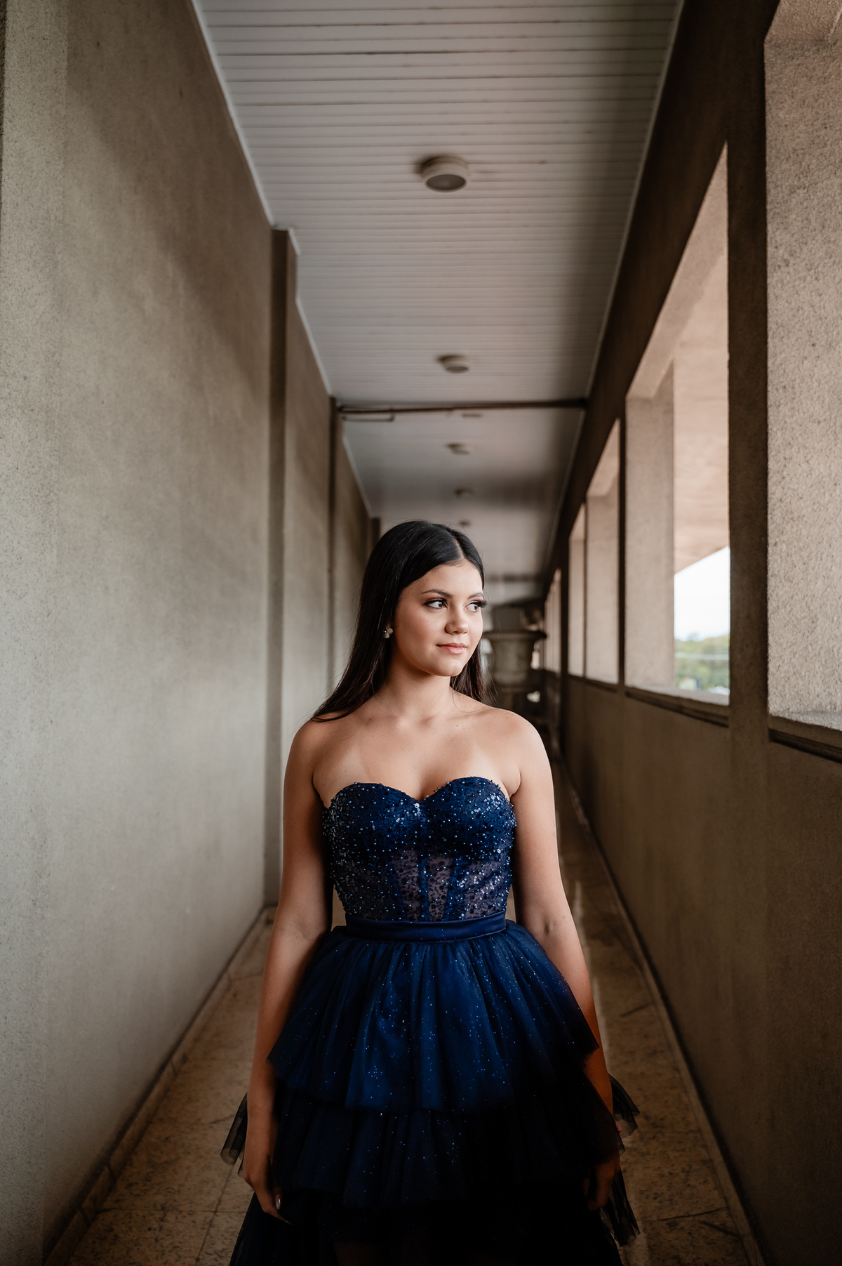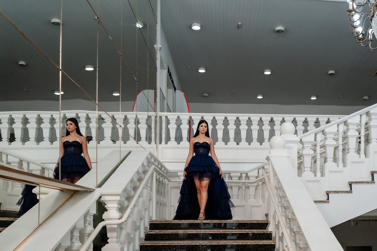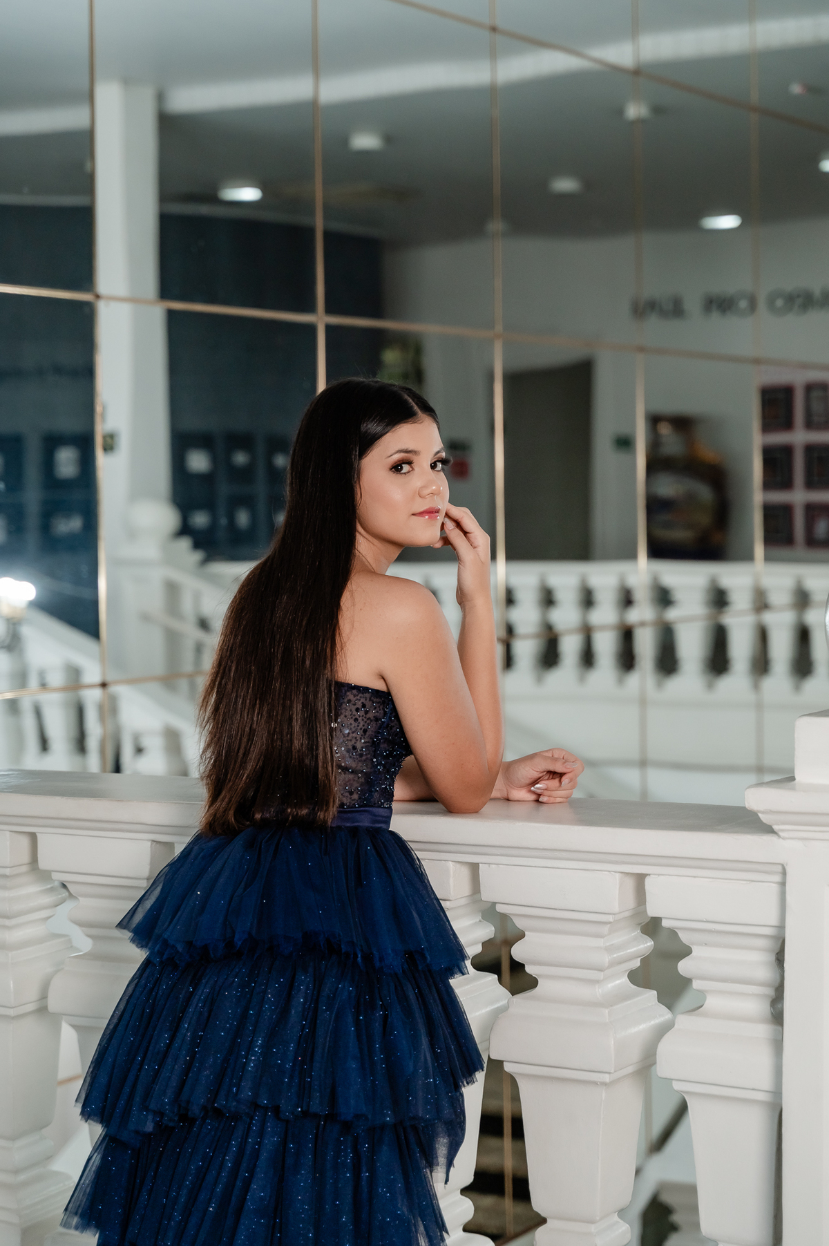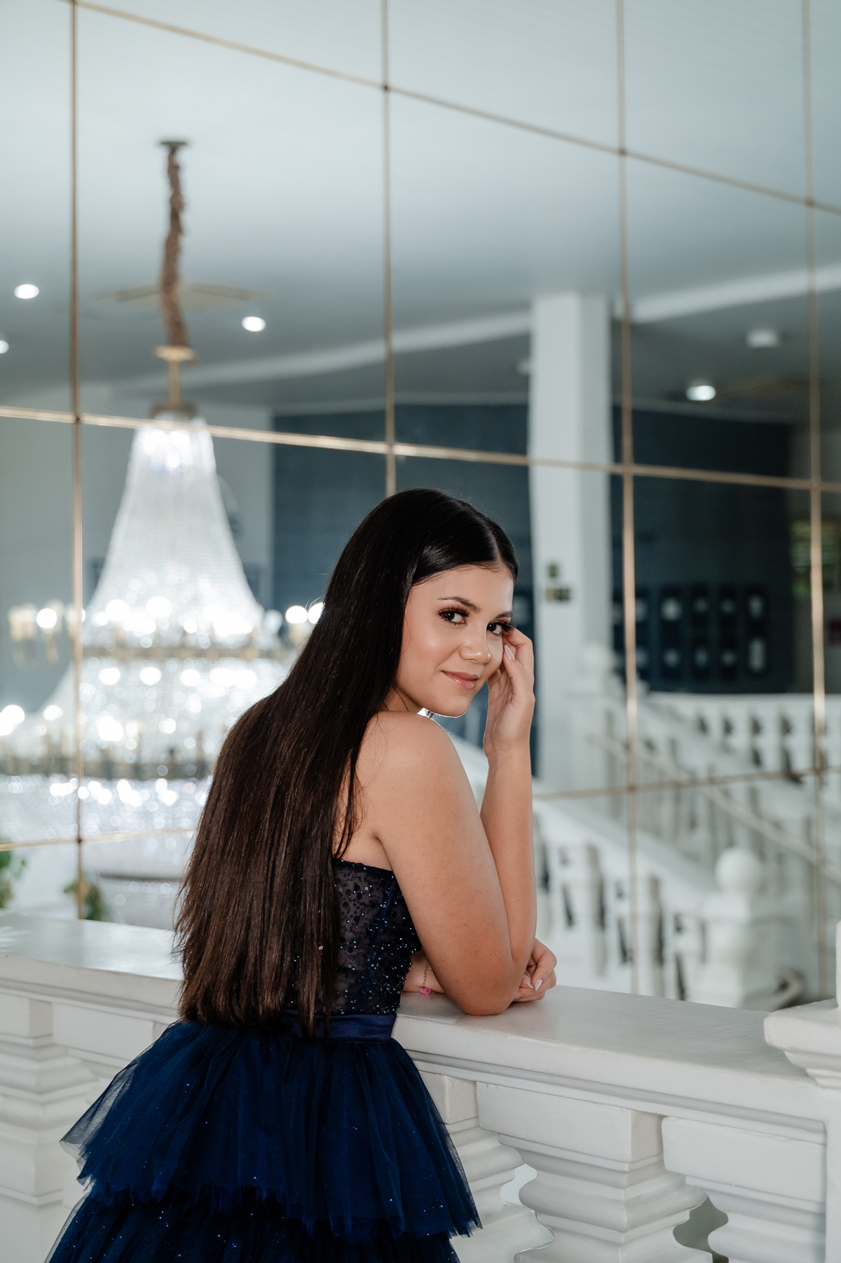 Outros registros a mostram em poses mais seguras, corpo erguido, olhar direto — evocando transformação, presença e o momento de celebrar “quem eu sou” ao entrar nos quinze anos, em um lindo cenário (escadas, colunas, corredores largos) criando metáforas visuais: a escadaria pode sugerir o “subir”, o crescimento; os espaços amplos podem sugerir novas possibilidades.