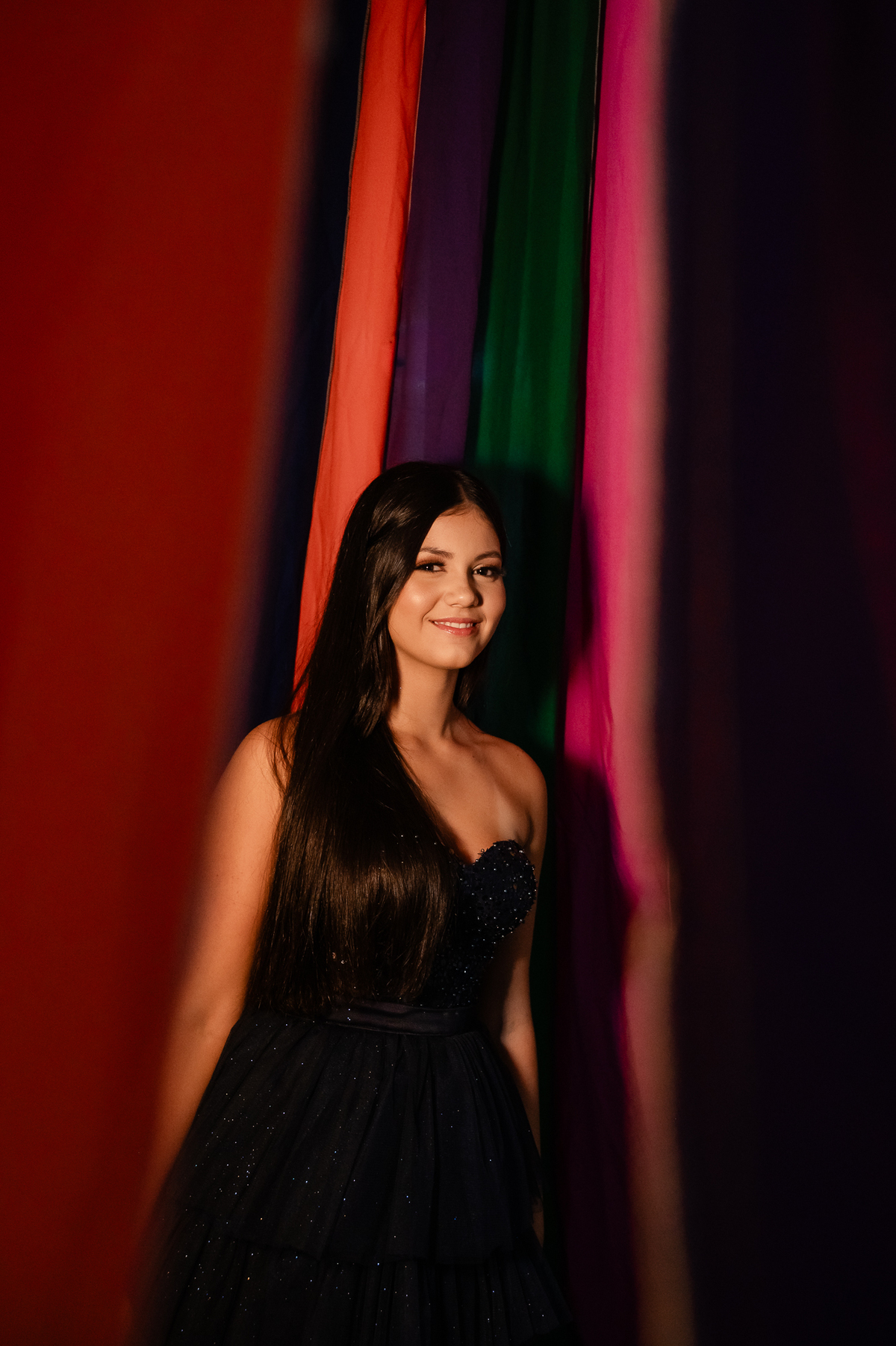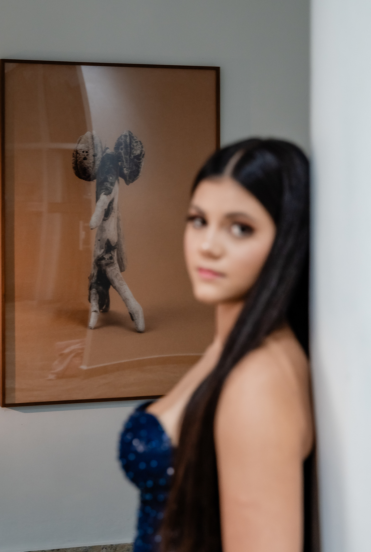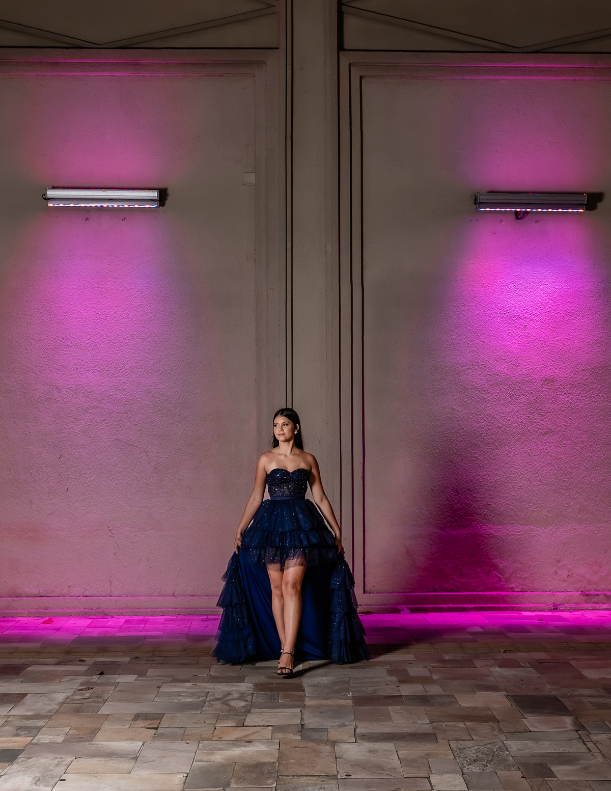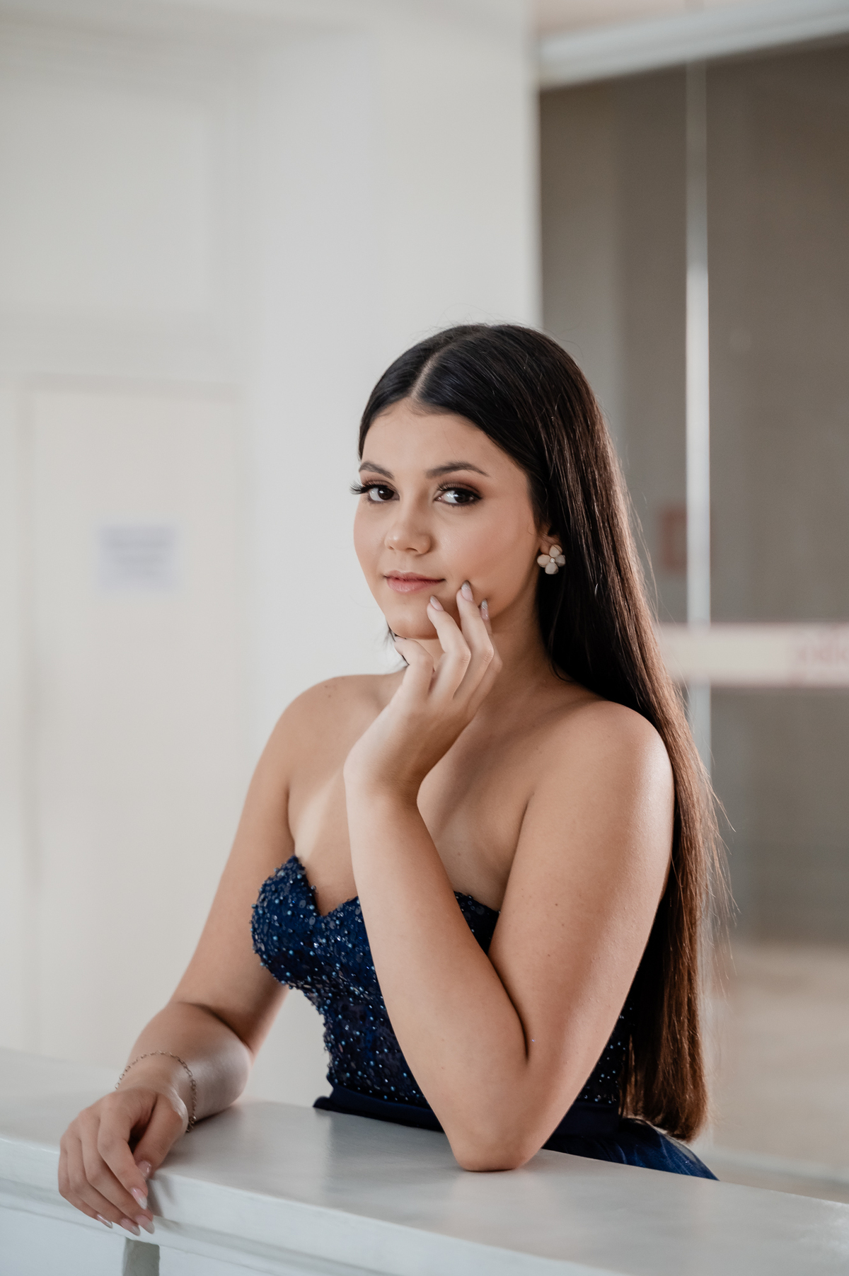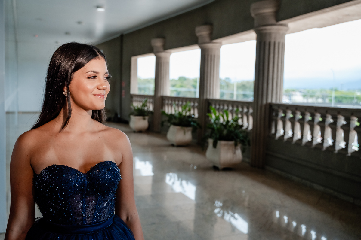 Outros registros a mostram em poses mais seguras, corpo erguido, olhar direto — evocando transformação, presença e o momento de celebrar “quem eu sou” ao entrar nos quinze anos, em um lindo cenário (escadas, colunas, corredores largos) criando metáforas visuais: a escadaria pode sugerir o “subir”, o crescimento; os espaços amplos podem sugerir novas possibilidades.
