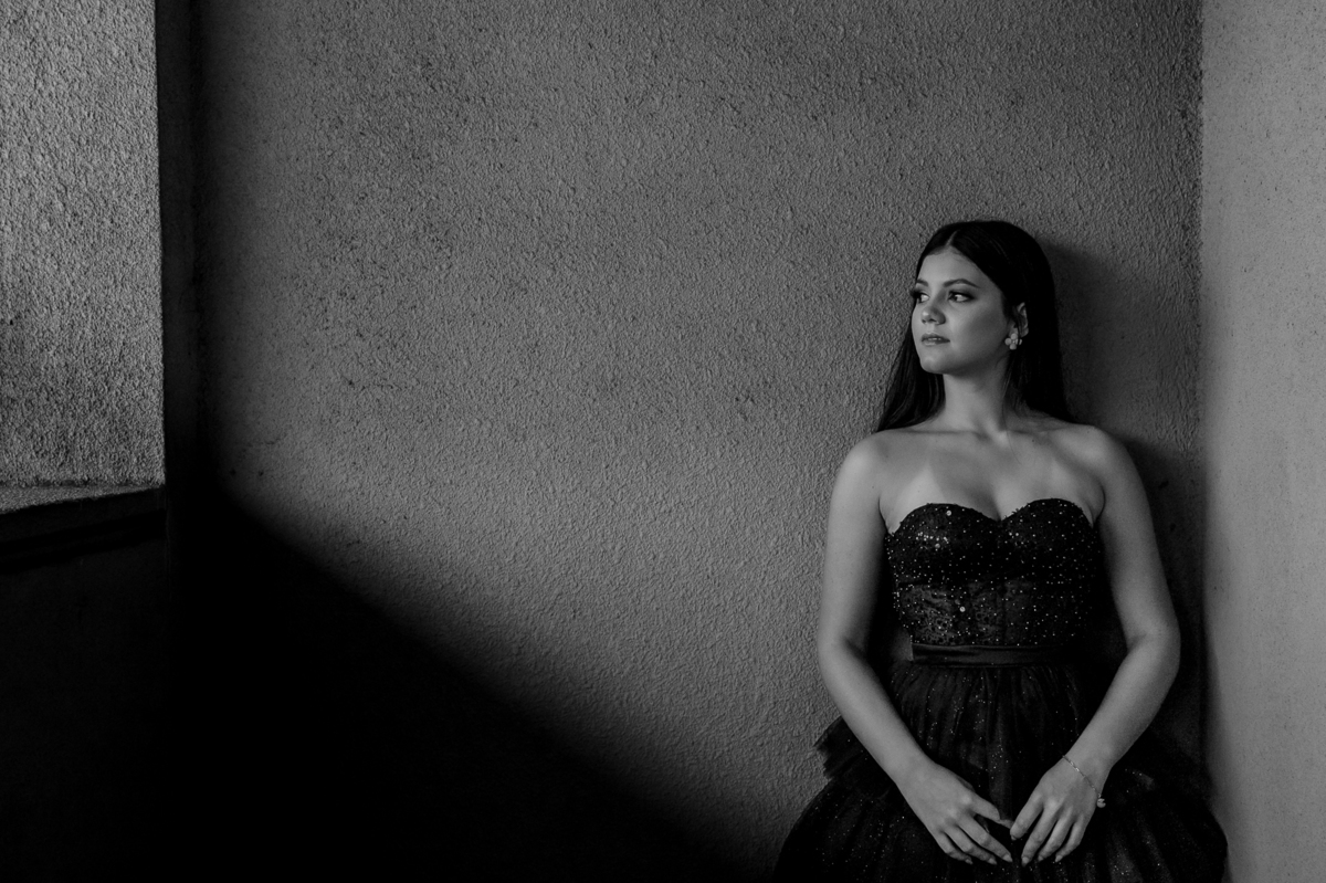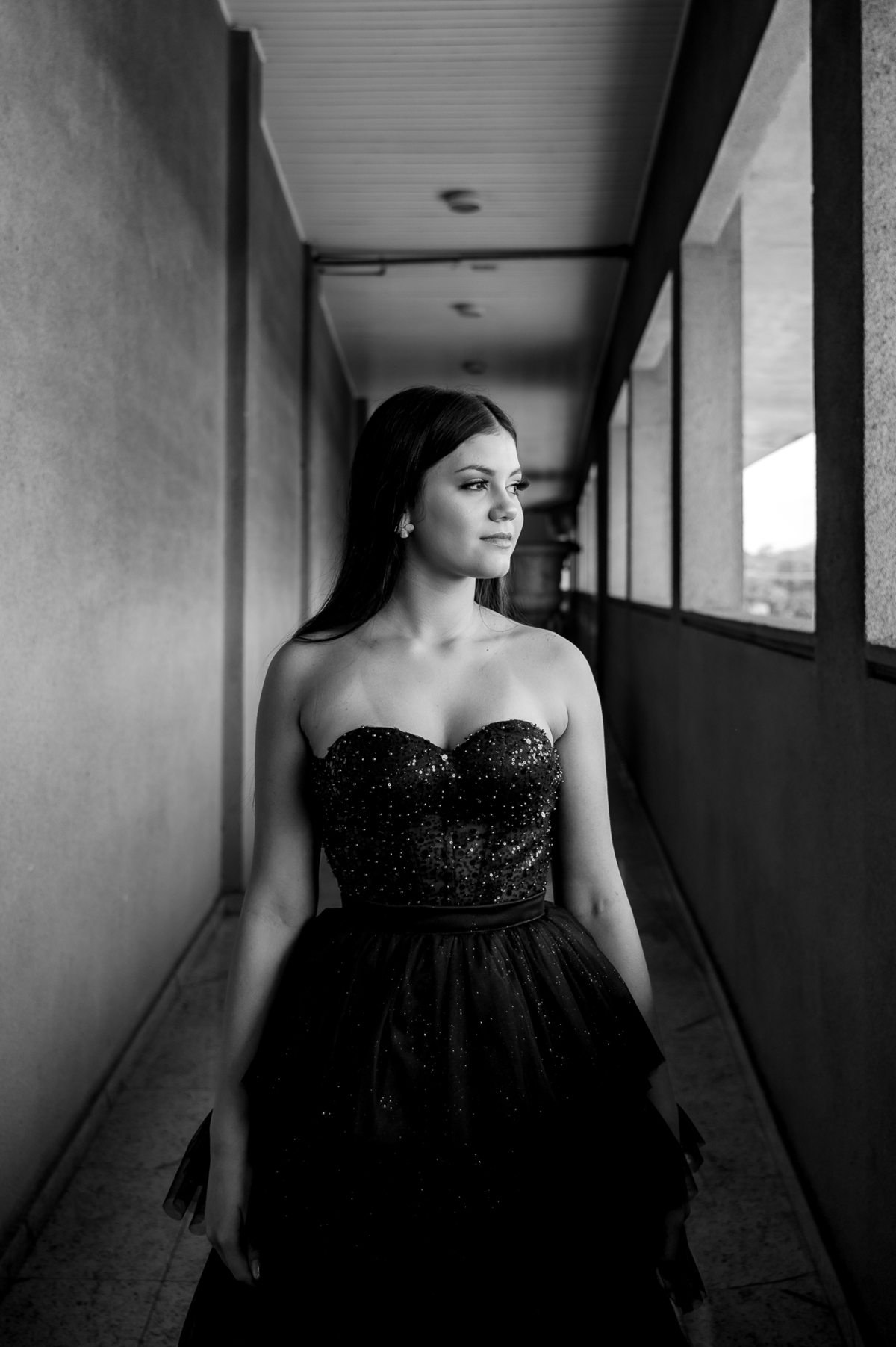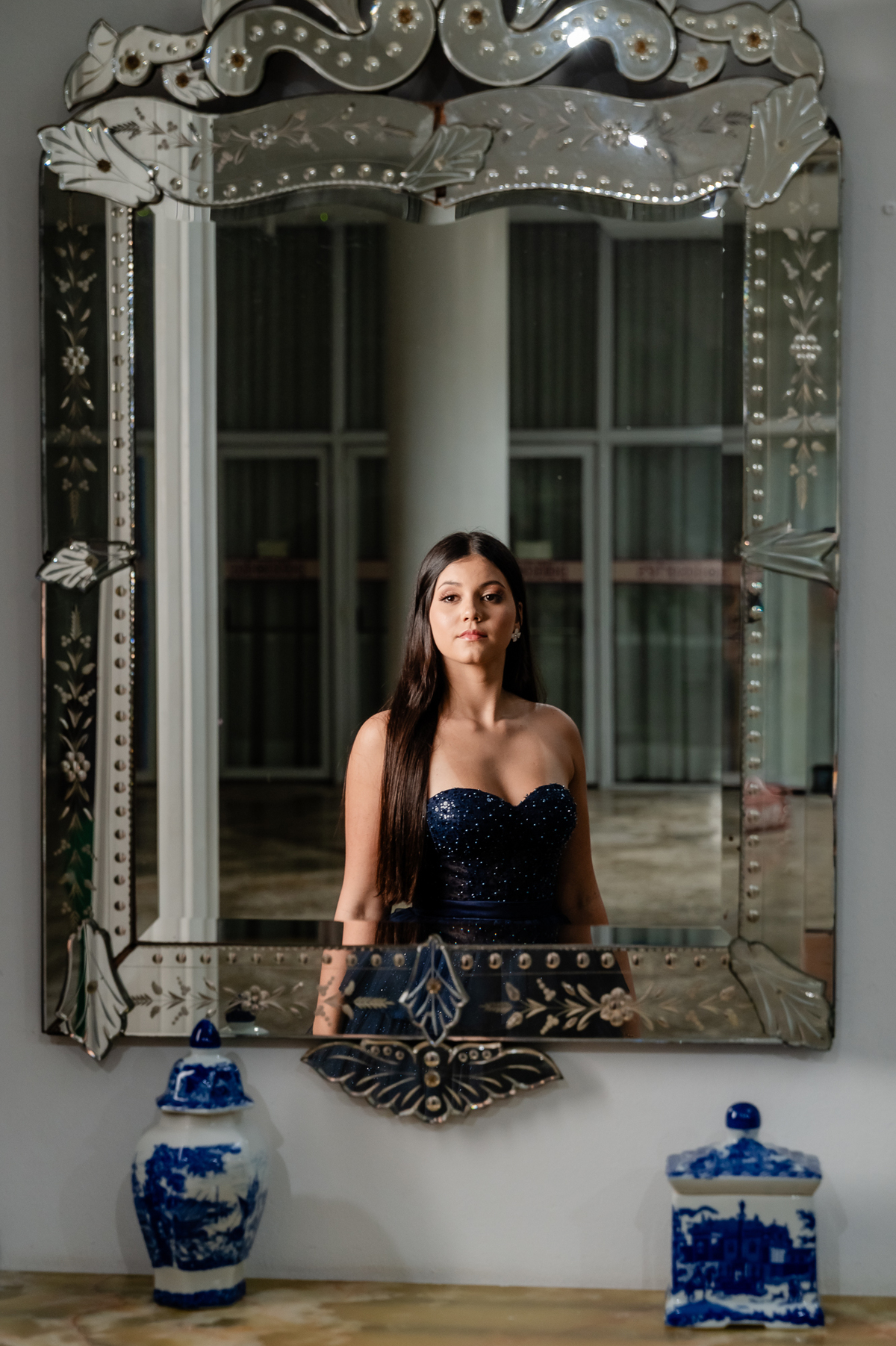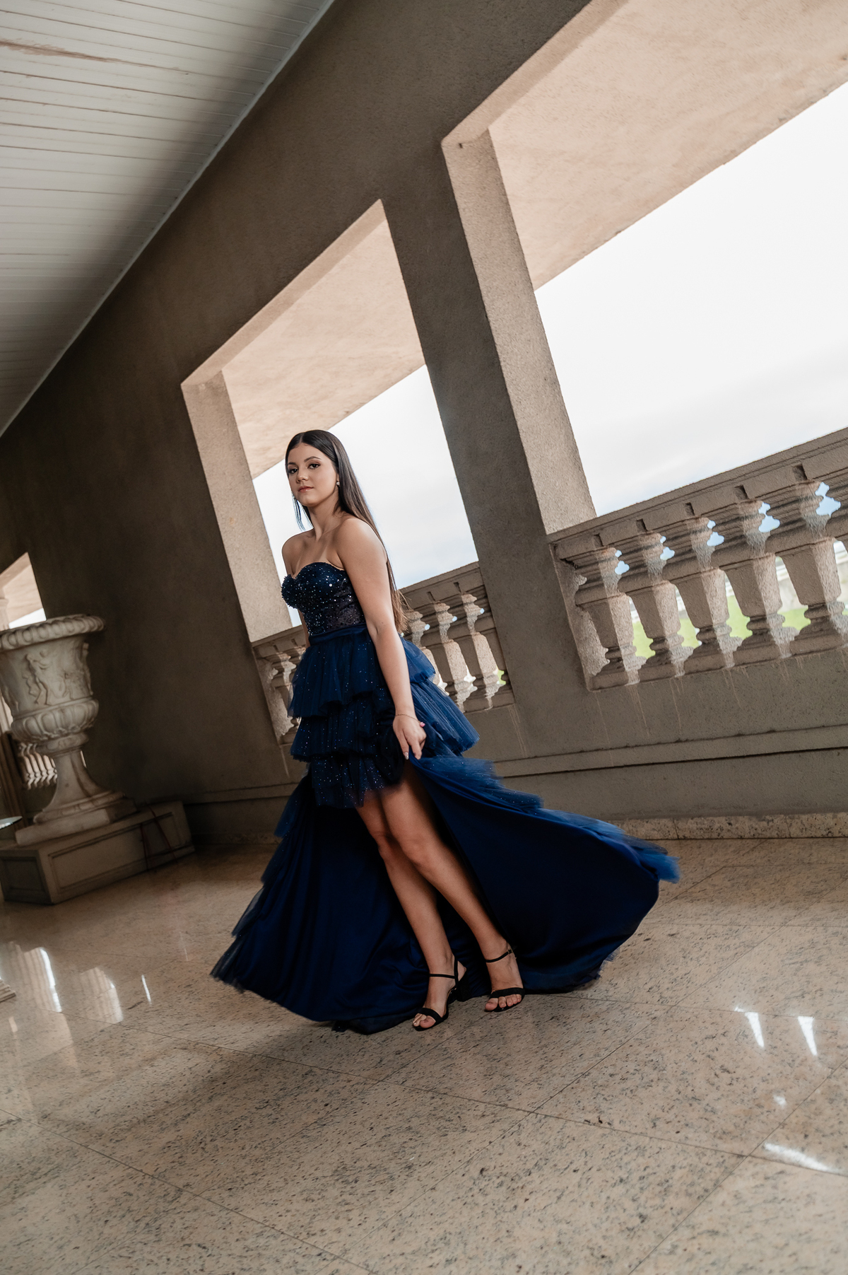 Outros registros a mostram em poses mais seguras, corpo erguido, olhar direto — evocando transformação, presença e o momento de celebrar “quem eu sou” ao entrar nos quinze anos, em um lindo cenário (escadas, colunas, corredores largos) criando metáforas visuais: a escadaria pode sugerir o “subir”, o crescimento; os espaços amplos podem sugerir novas possibilidades.