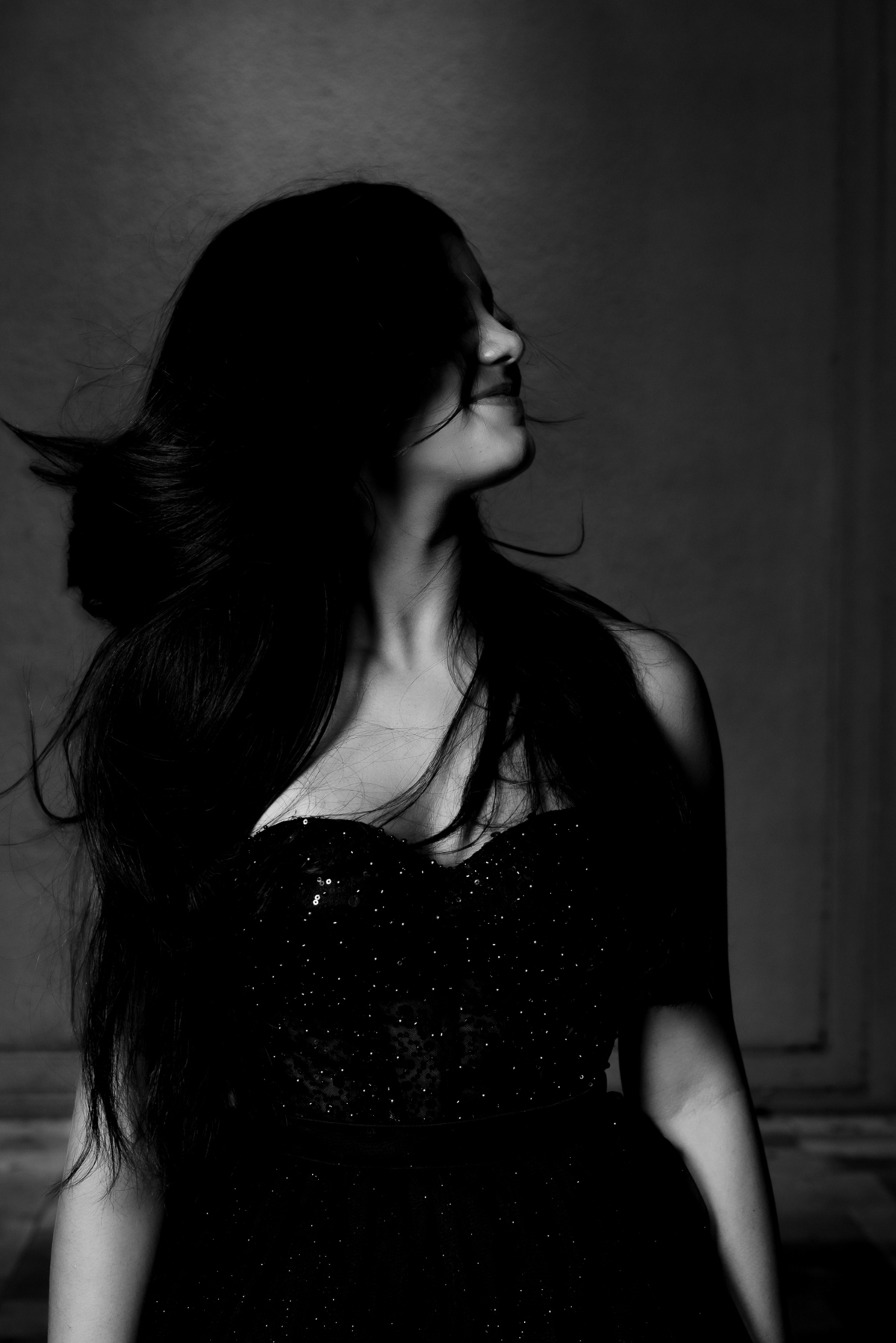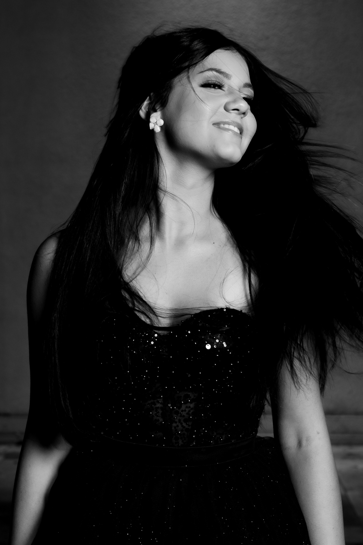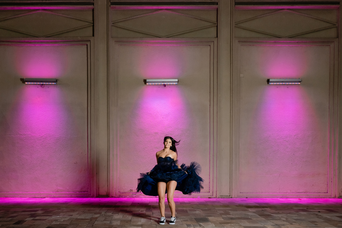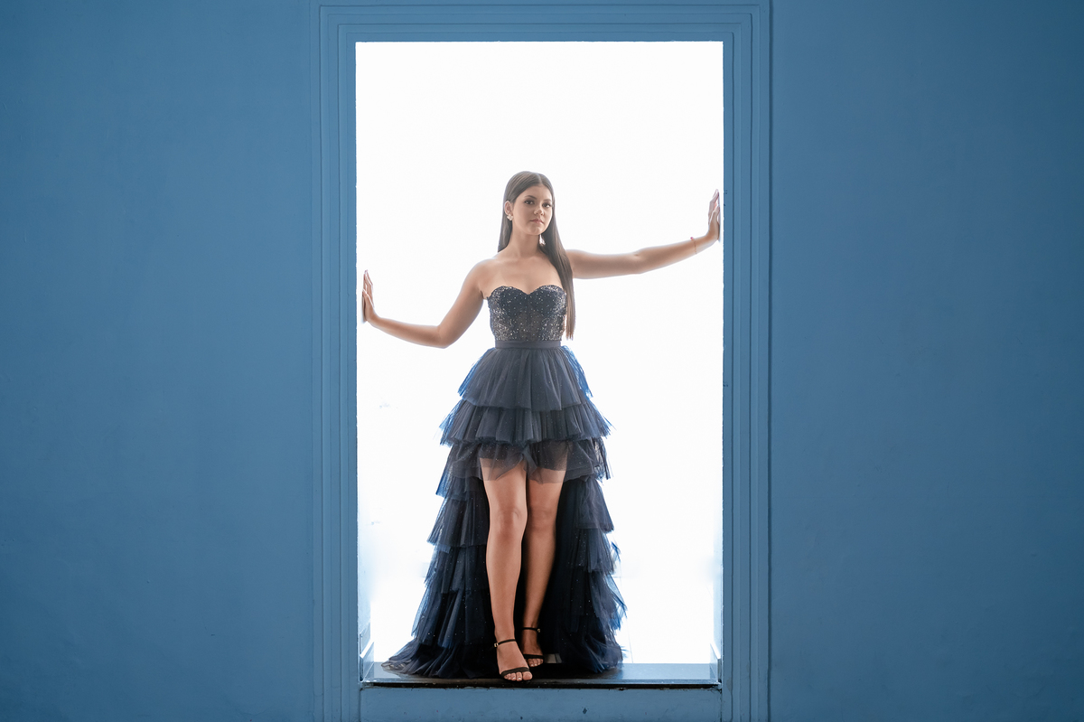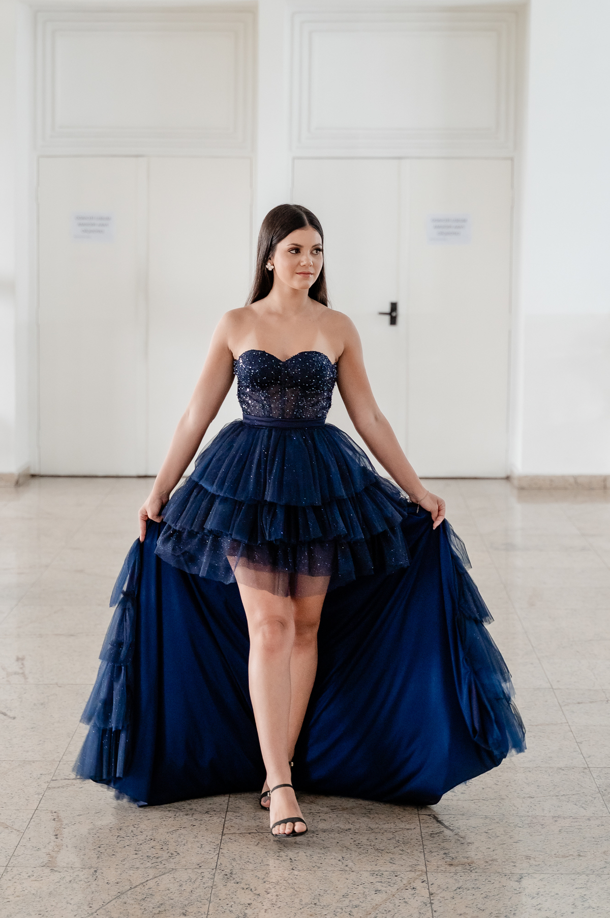 No silêncio do saguão, seus movimentos eram delicados, mas firmes. A cada pose, revelava um pouco mais de sua essência: a timidez se transformando em presença, o sorriso tímido se tornando riso leve. O vestido fluía como extensão do espaço, dançando com o ar que entrava pelas colunas, refletindo o branco das paredes e a imponência dos lustres.