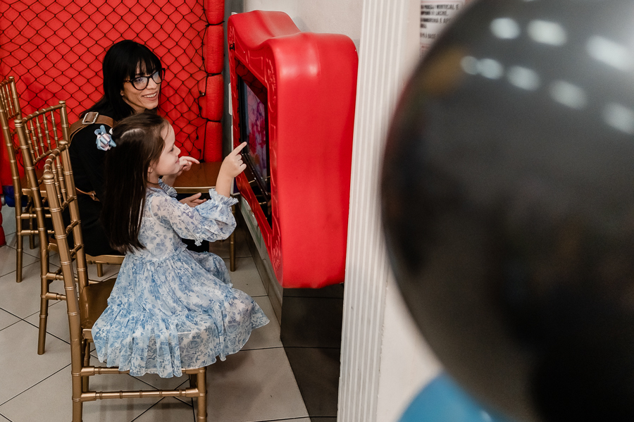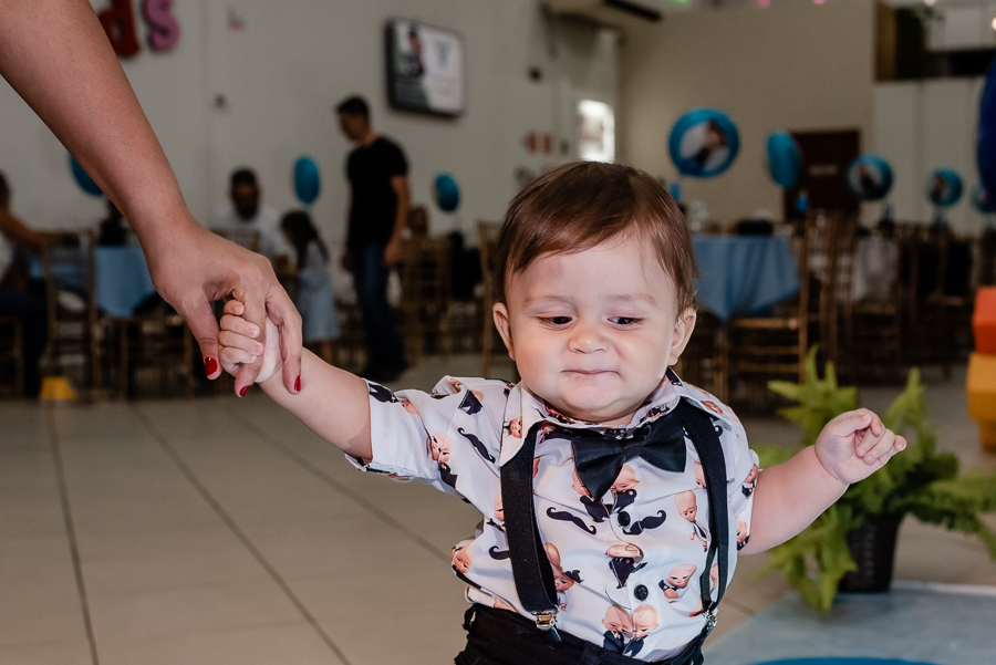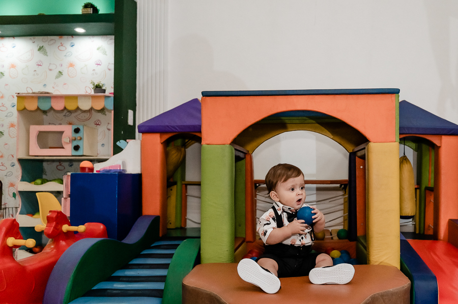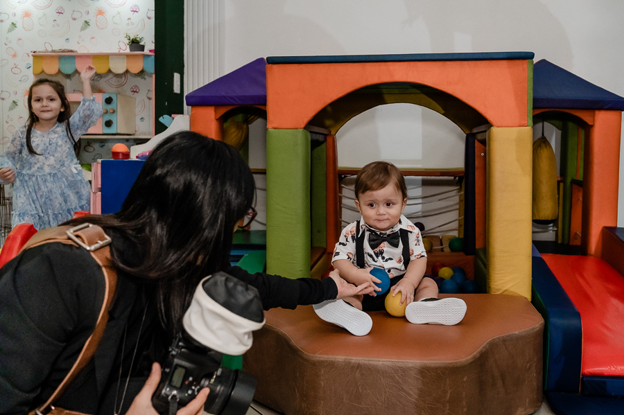 Junto com a mamãe, o papai e sua irmã Lívia, o Mateus foi conhecendo cada cantinho do espaço, a mesa decorada, os brinquedos...no início estava muito sério mas aos poucos foi mostrando seu sorriso.