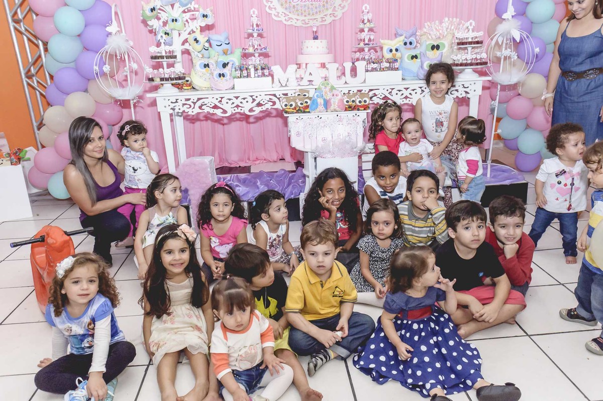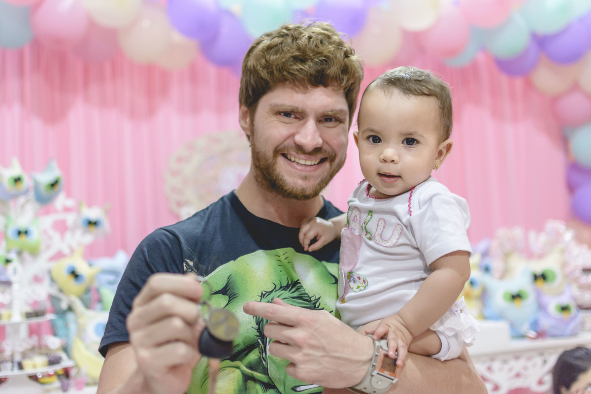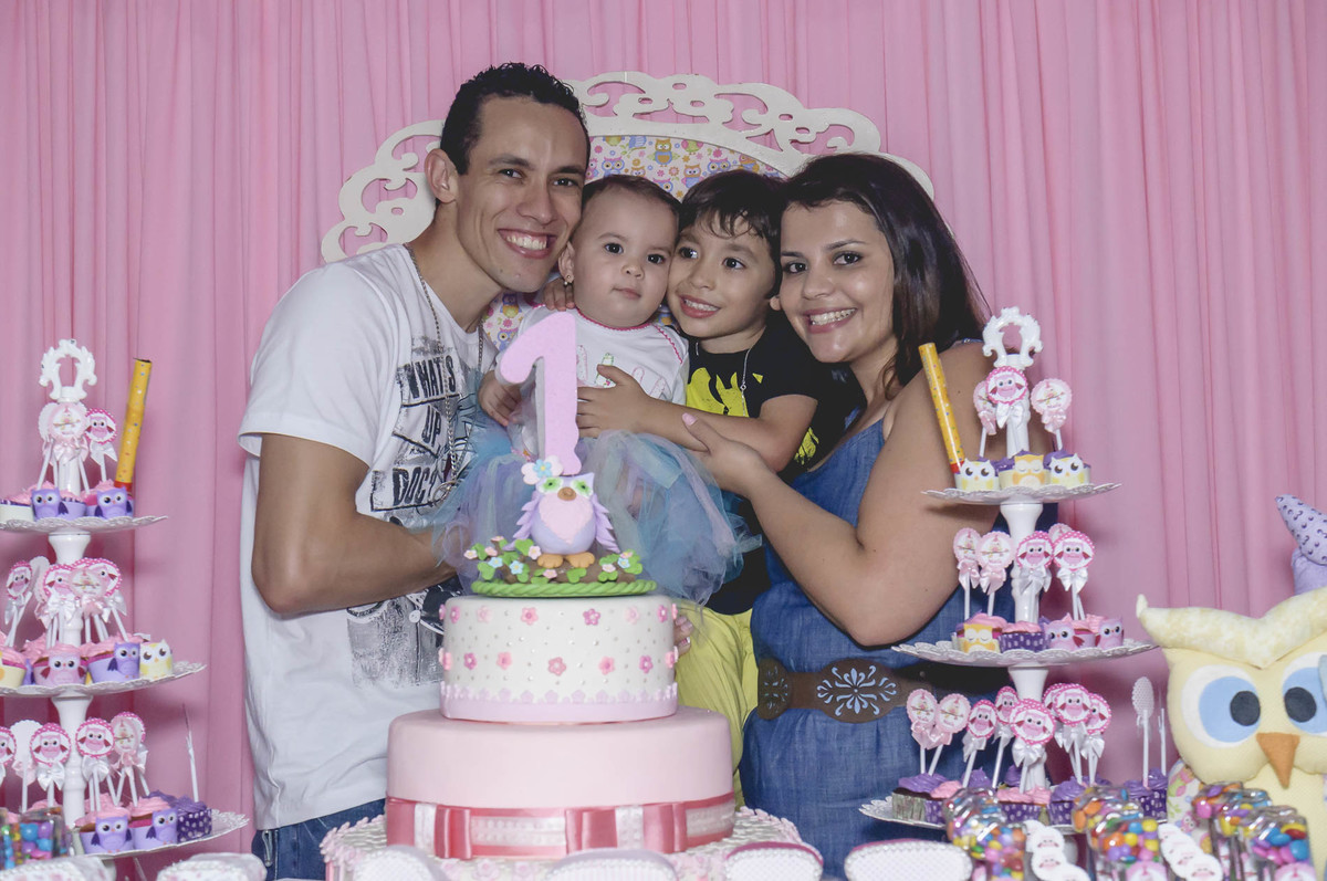 No dia da festa, tudo estava lindo, com a decoração de corujinhas que a tia Carol fez com tanto amor. Ela já está dando os primeiros passos, brincando na piscina de bolinhas, sorrindo para todos, e um grude do vovô.