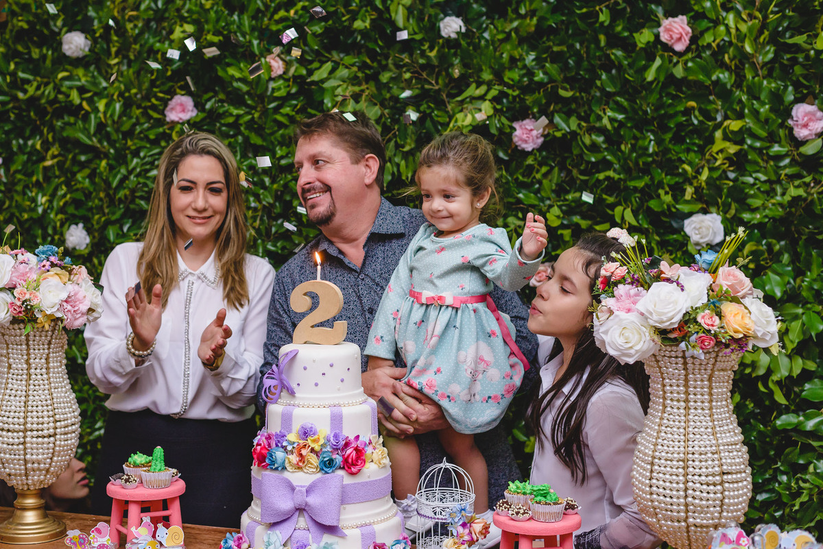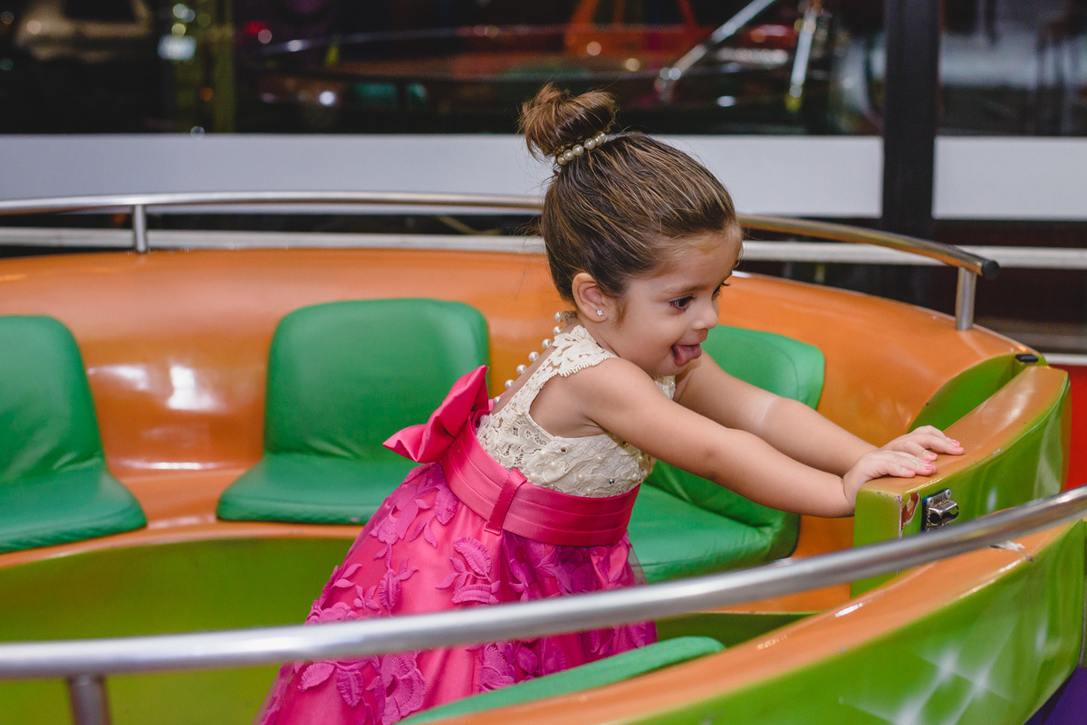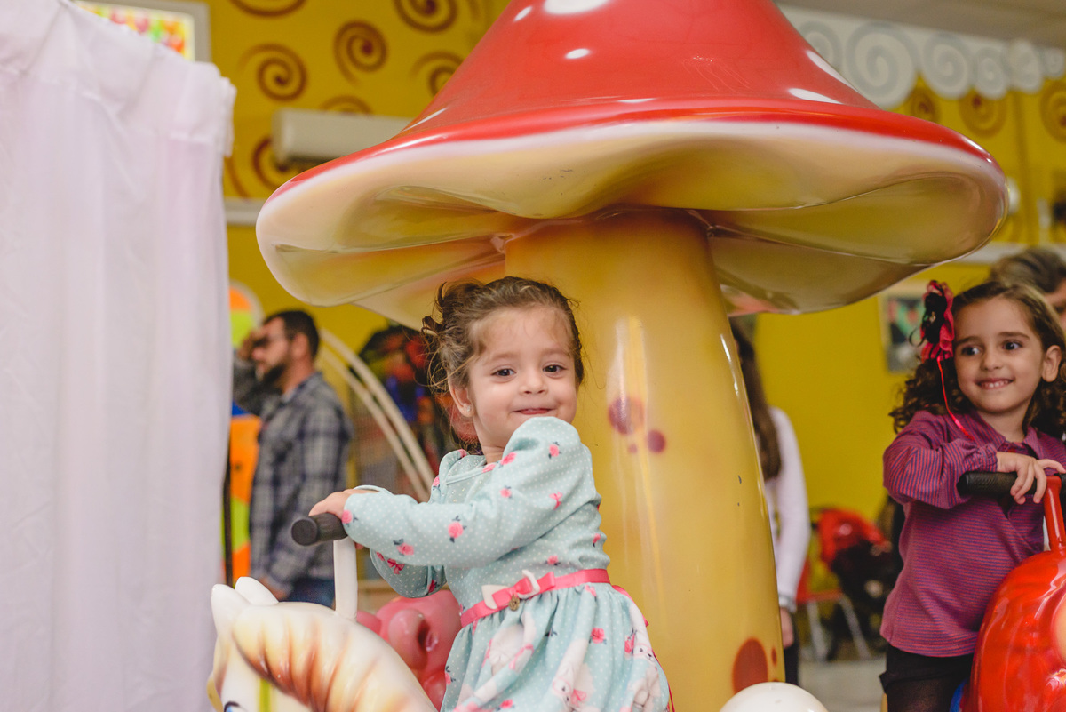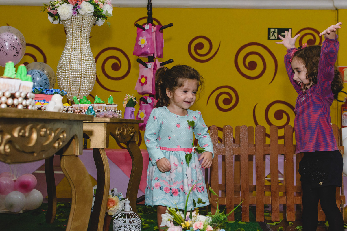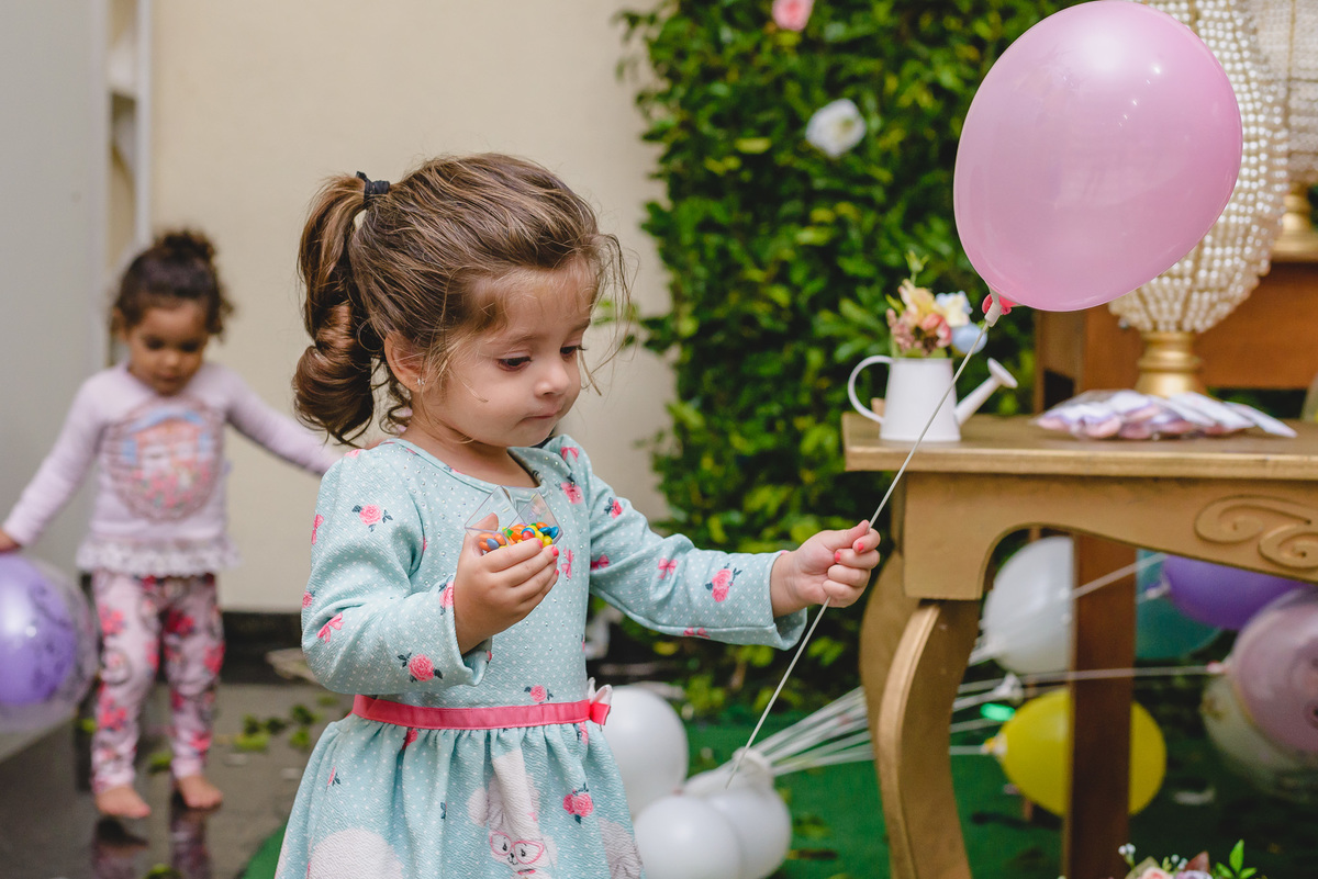 Depois dos parabéns a Manuella aproveitou para brincar no jardim que decorou sua festa, olhou cada detalhe com atenção e garantiu seu balão rosa.