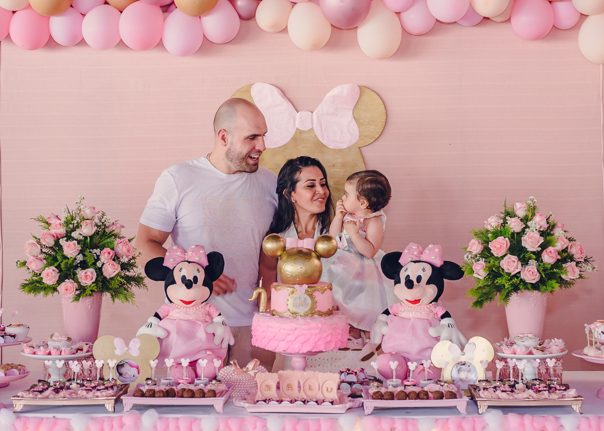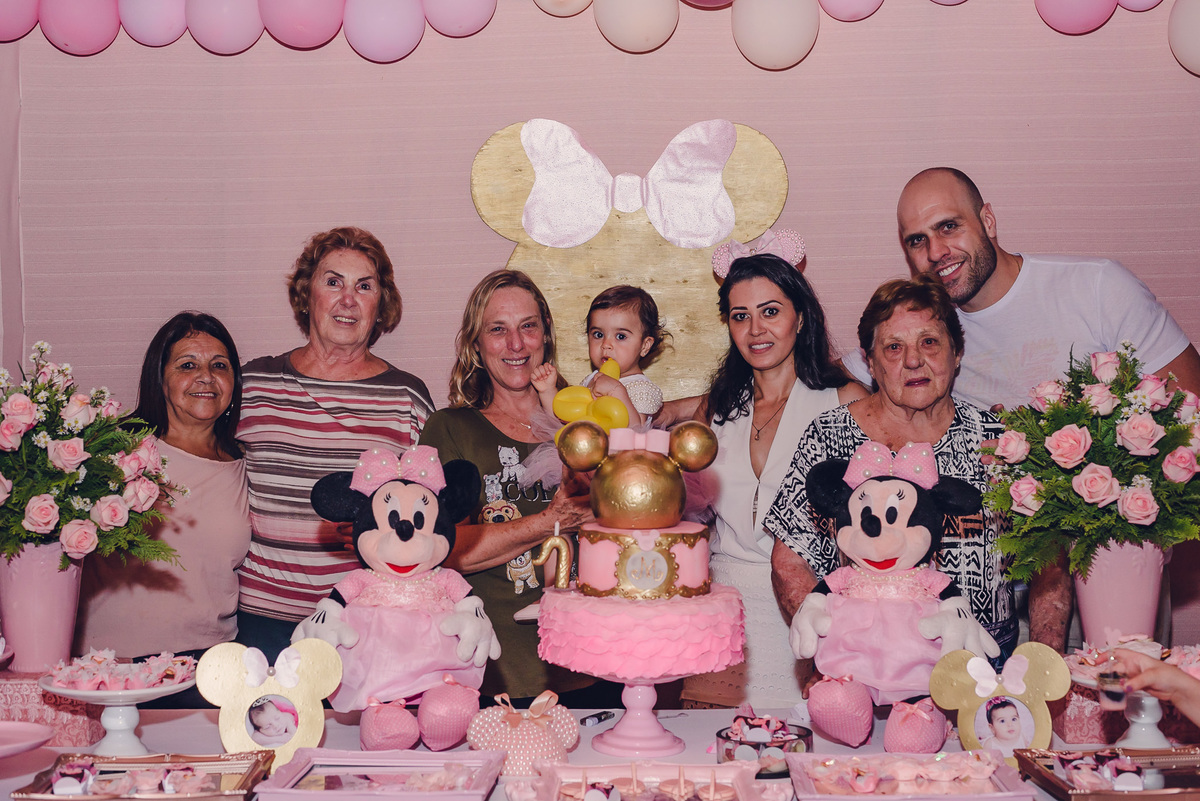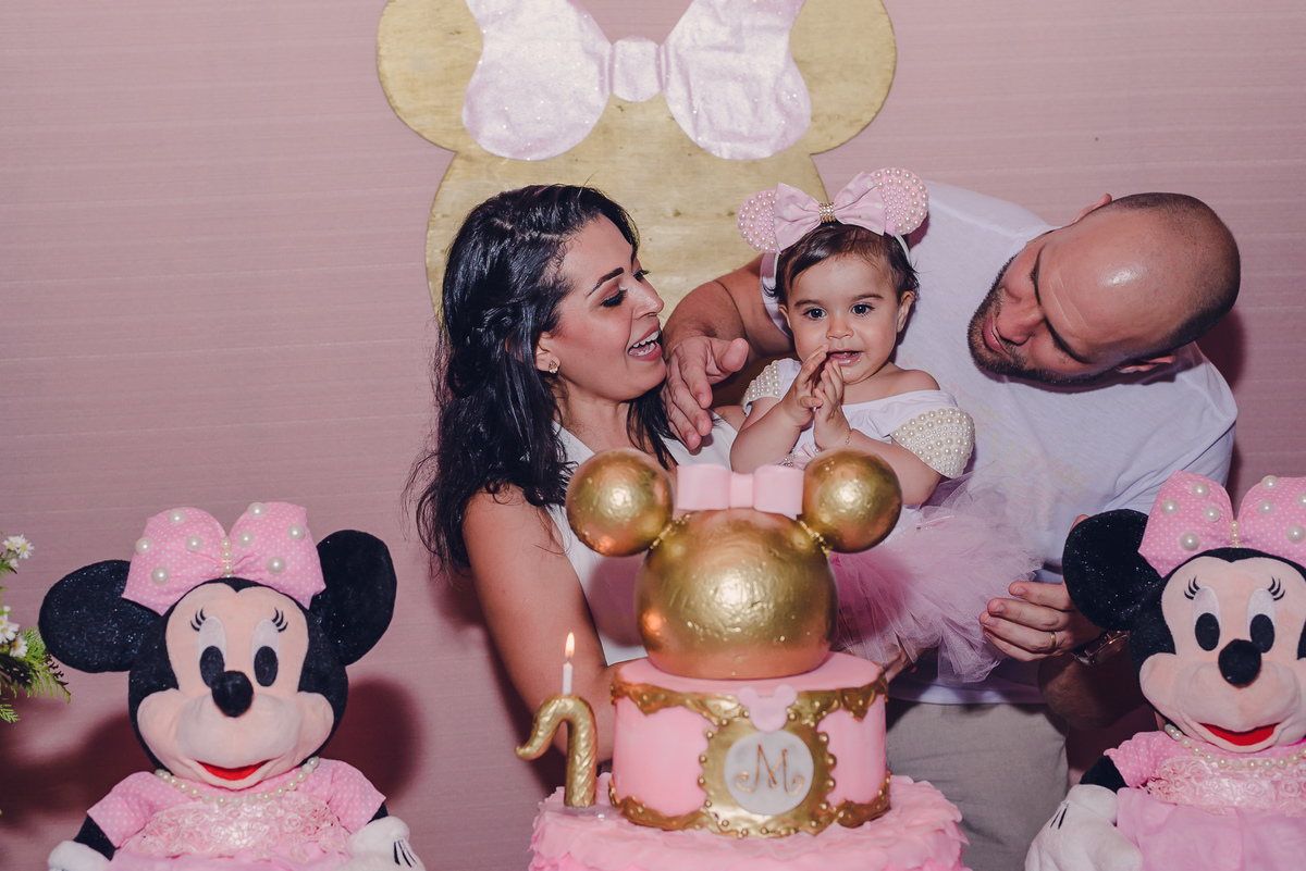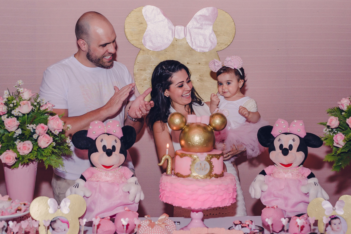 Depois de muita brincadeira, hora de se emocionar com um vídeo de retrospectiva, feito pelo titio. Teve até troca de vestido para a hora dos parabéns! Uma Minie de rosa que ficou um show!
