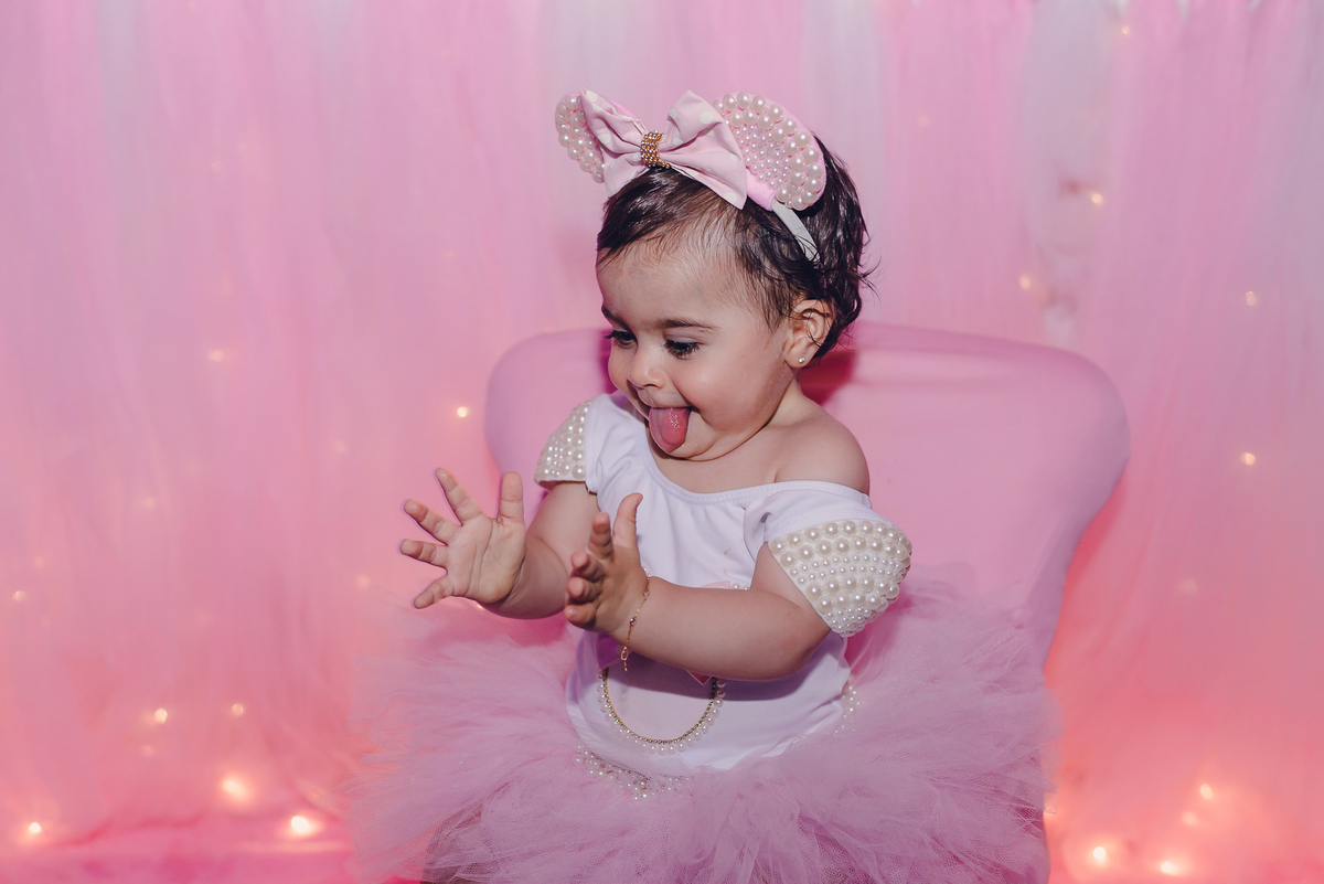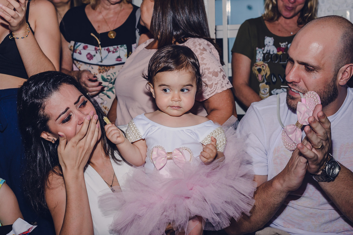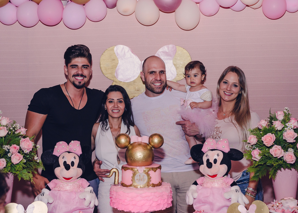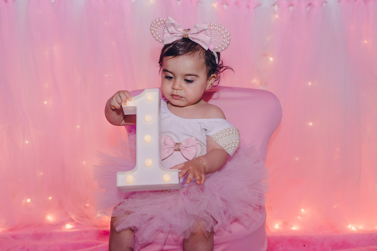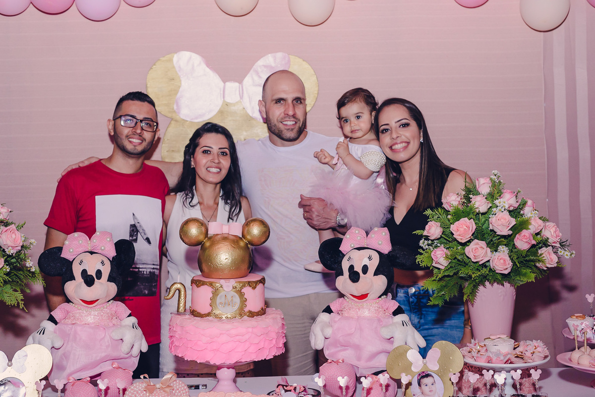 Depois de muita brincadeira, hora de se emocionar com um vídeo de retrospectiva, feito pelo titio. Teve até troca de vestido para a hora dos parabéns! Uma Minie de rosa que ficou um show!