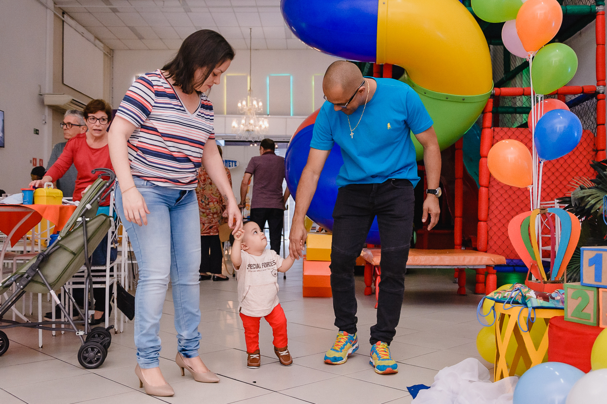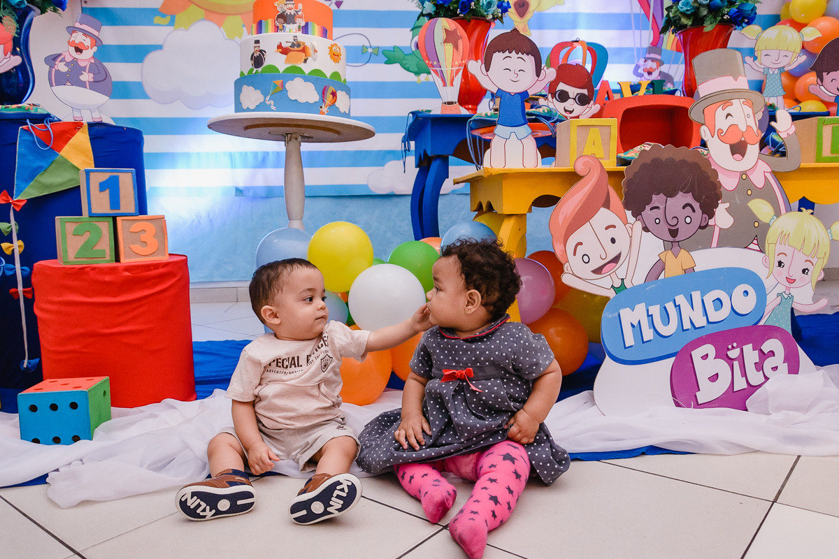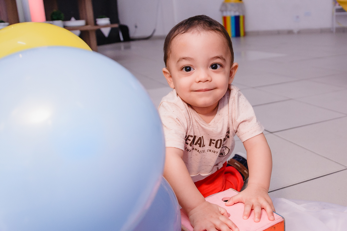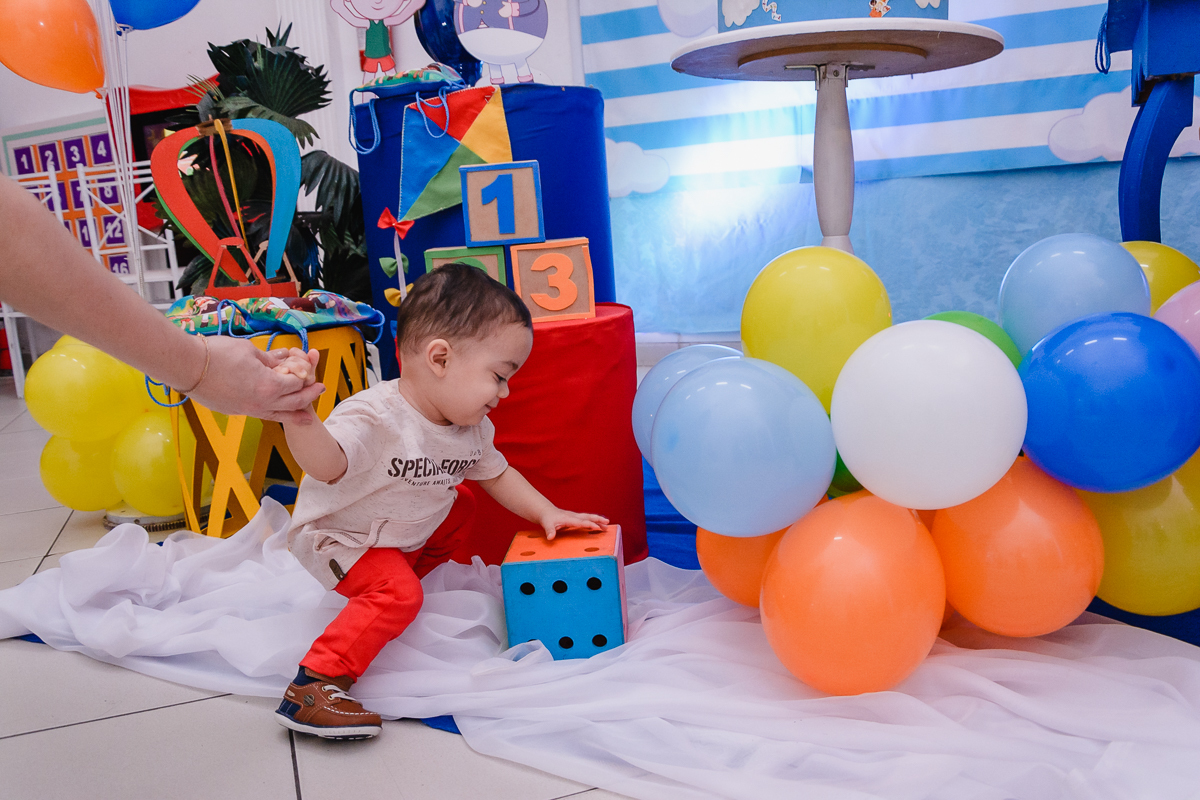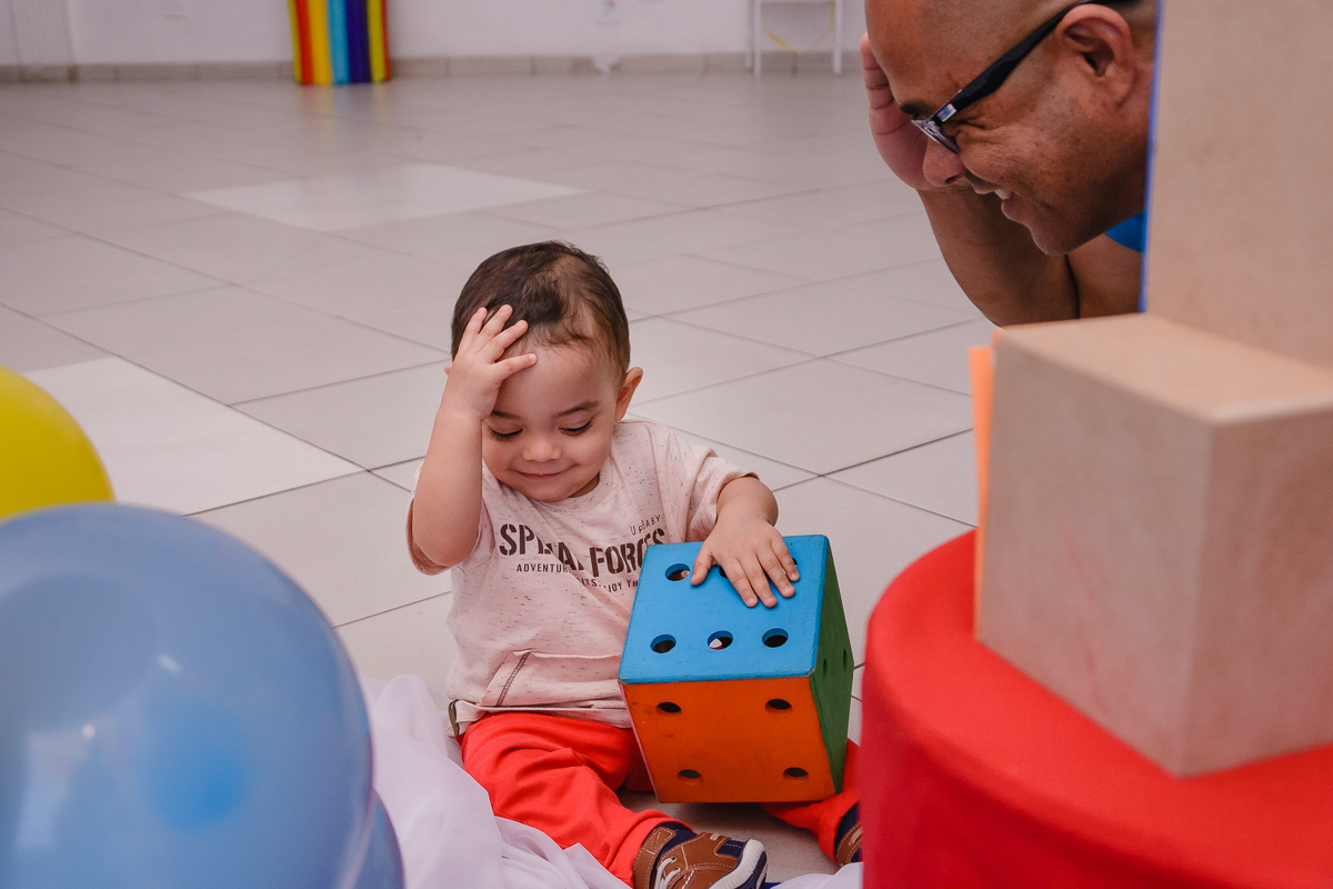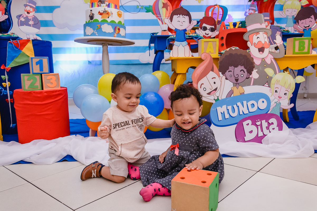 Pensa em um pequeno que brincou a festa toda, não parou um minuto! E só queria andar dando a mãozinha pra mamãe, pro papai e avós. Abraçou e sorriu pro seu irmão mais velho.Também escalou brinquedos com as titias aventureiras e adorou! Depois conheceu a mesa linda do Mundo Bita e brincou com um dado de madeira grande e colorido e se divertiu!