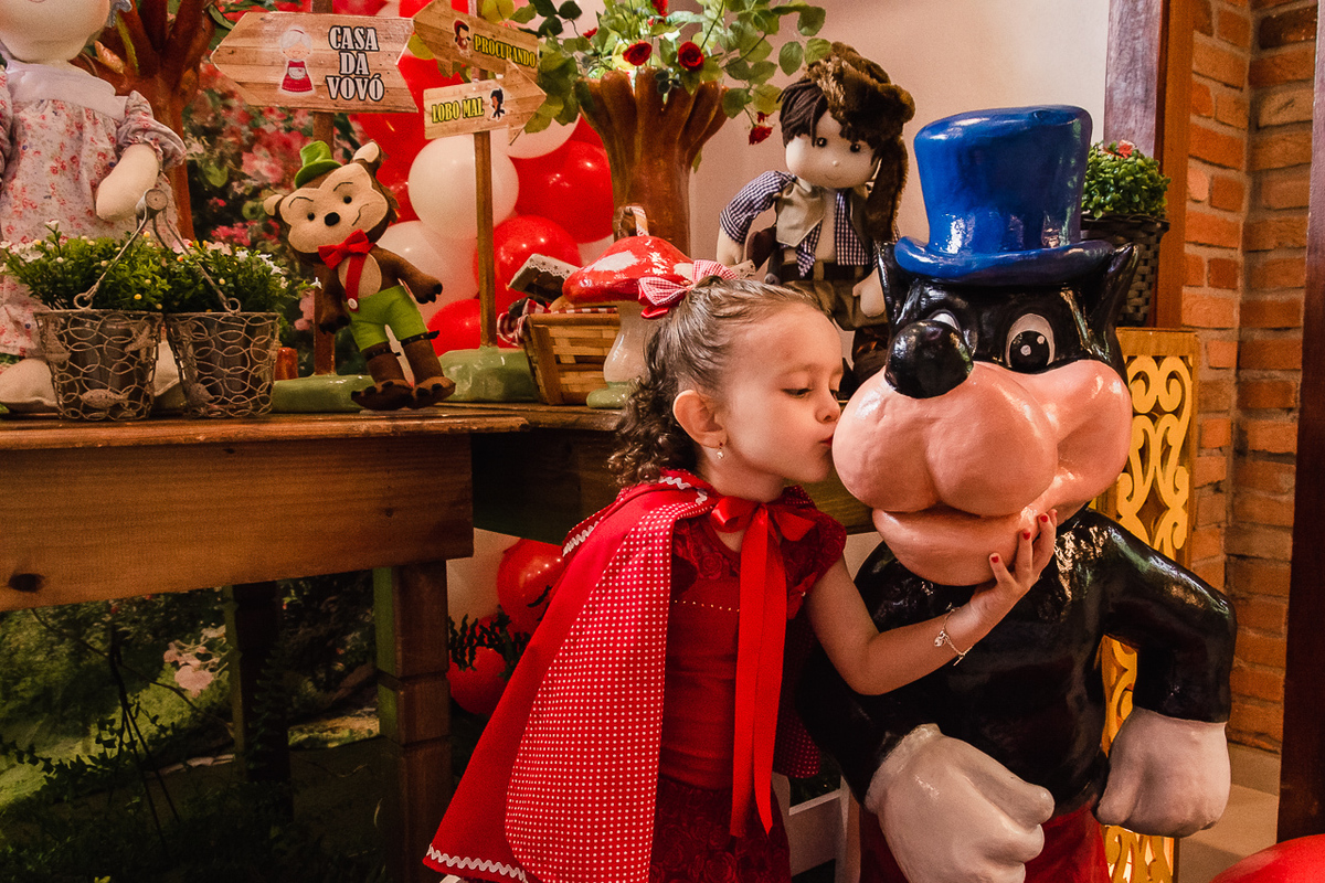 Tudo começou com a Soso curtindo os personagens na decoração, teve até beijinho no Lobo Mau! Depois começou a receber os convidados, especialmente os amiguinhos, com todo carinho!