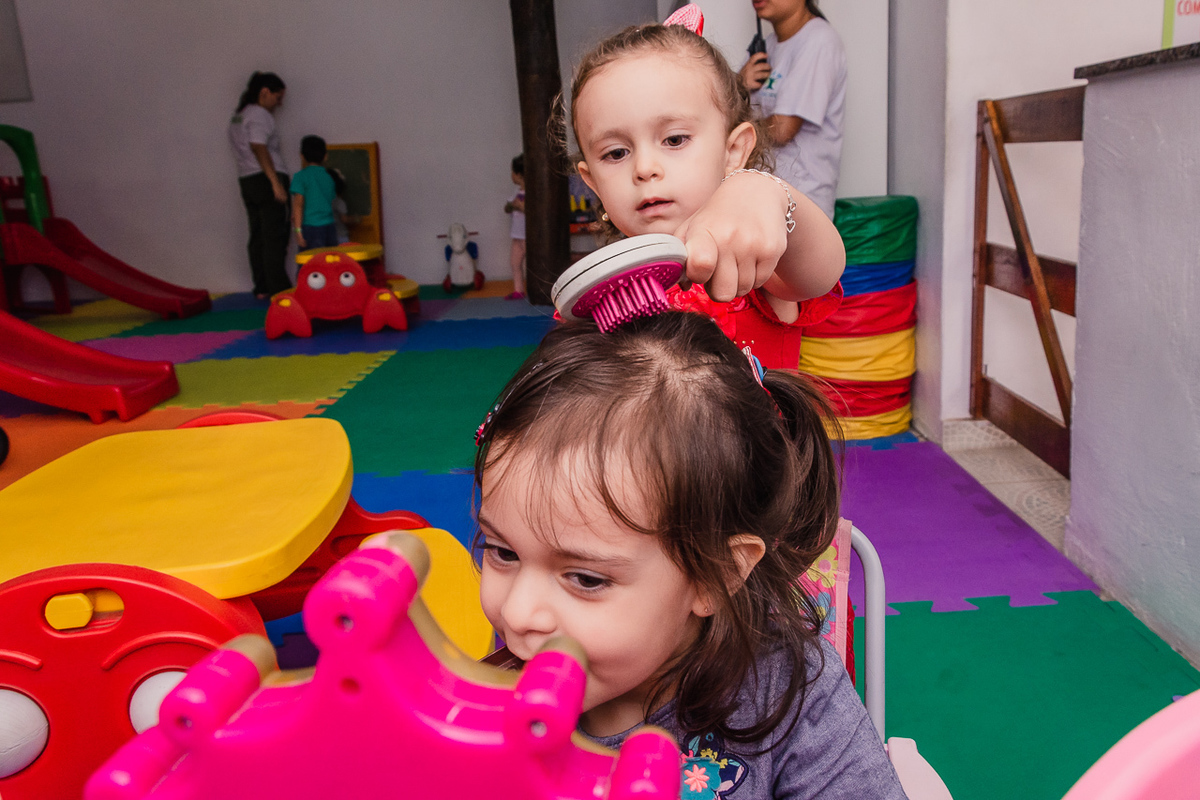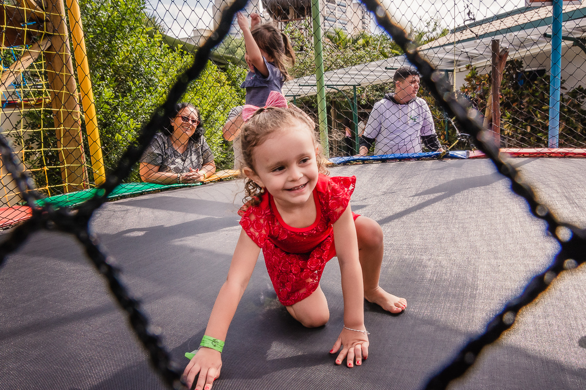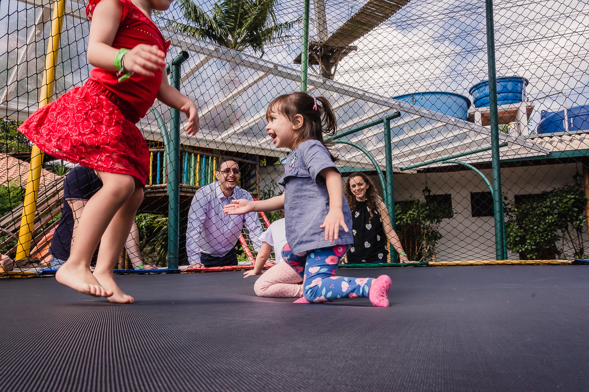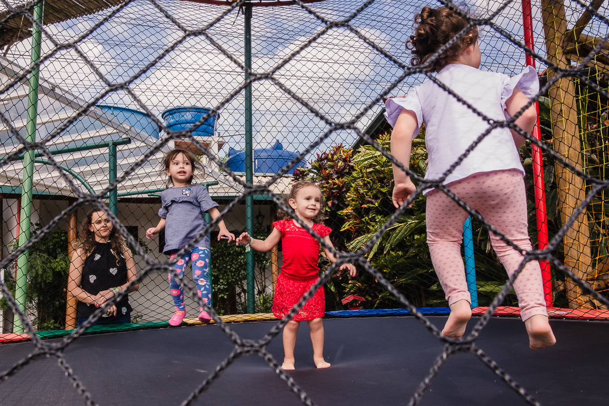 Então foi a vez de curtir os brinquedos! A Soso demorou um pouquinho para criar coragem para descer o escorrega maior, queria sempre um monitor com ela, mas a hora que a coragem chegou...desceu de todas as formas possíveis! Aí o foco mudou para o pula-pula com as amiguinhas e amiguinhos, animação total. E ainda descobriu mais um cantinho onde pode brincar de casinha, de cabeleireira e de dirigir carrinhos. Os adultos também curtiram todo o espaço, encantados pelas crianças sendo felizes e toda natureza a sua volta.