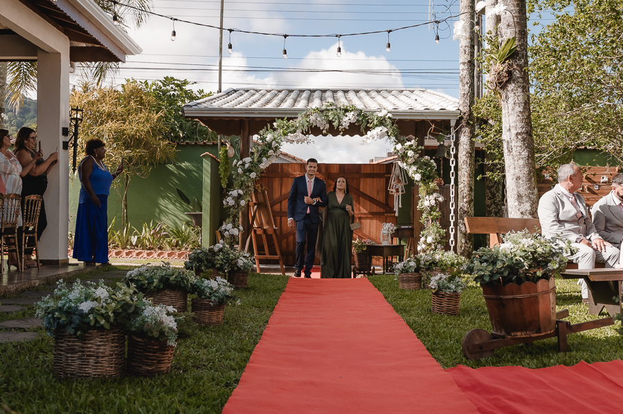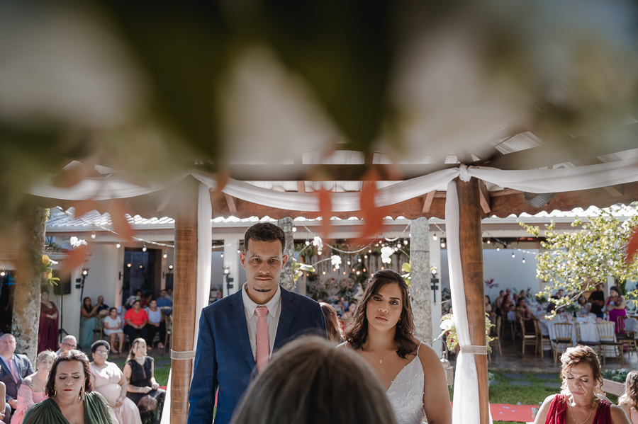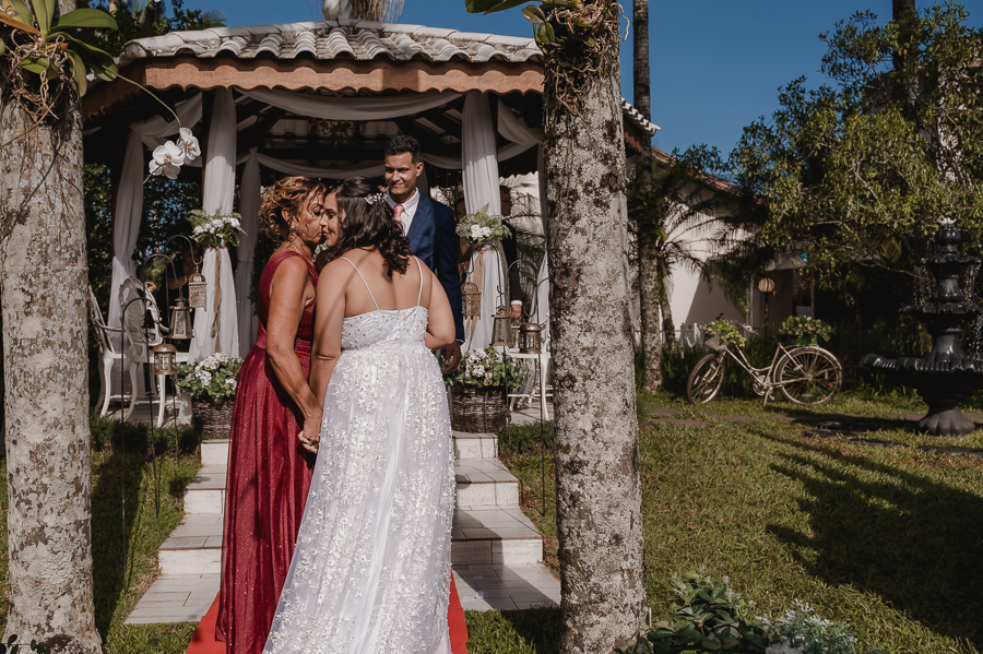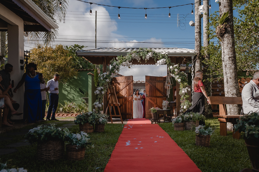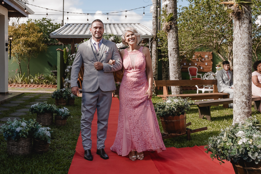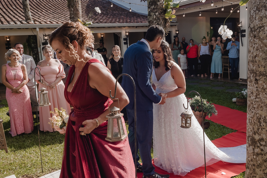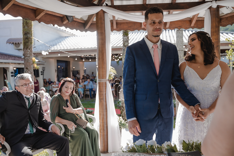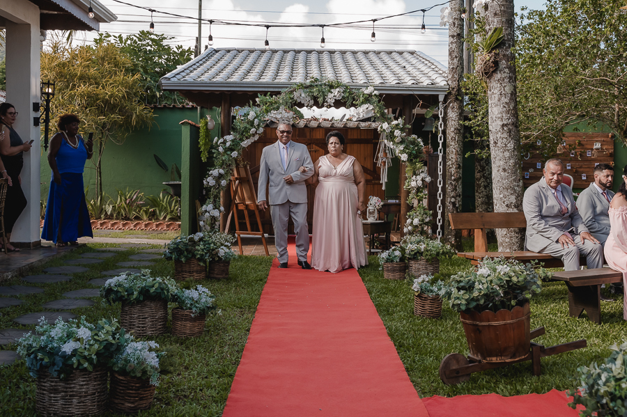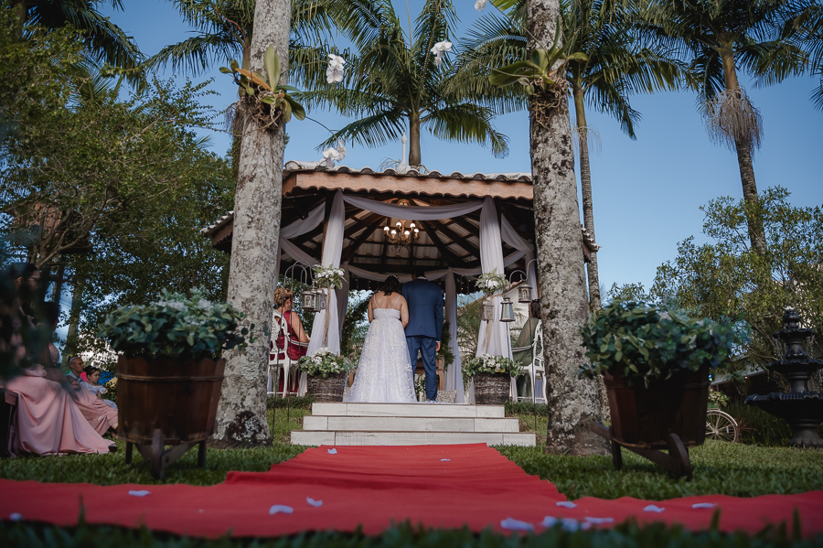 Após, seguimos para a cerimônia, realizada no Jardim das Orquídeas, em Praia Grande - SP, onde familiares e amigos esperavam ansiosos para ver o realização do sonho do casal de se tornarem um só.
