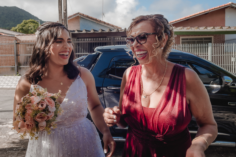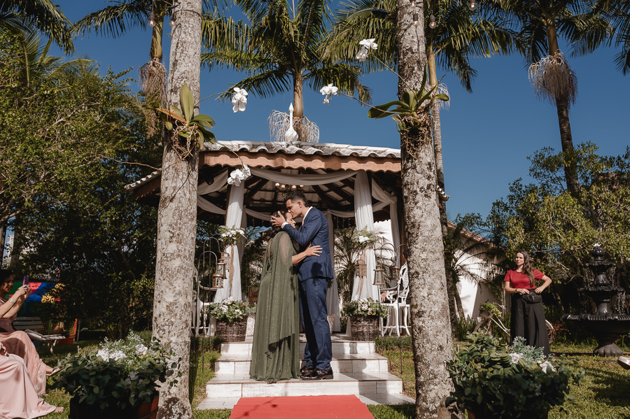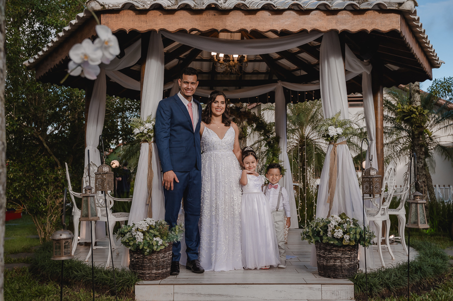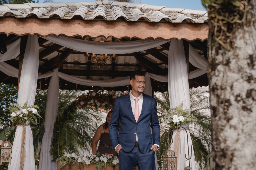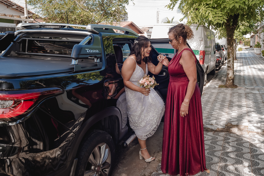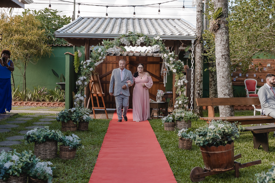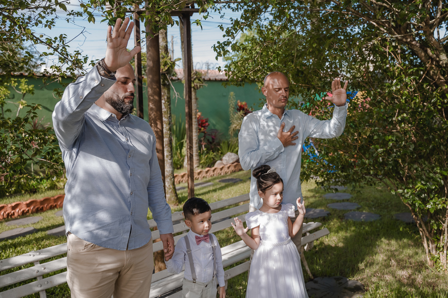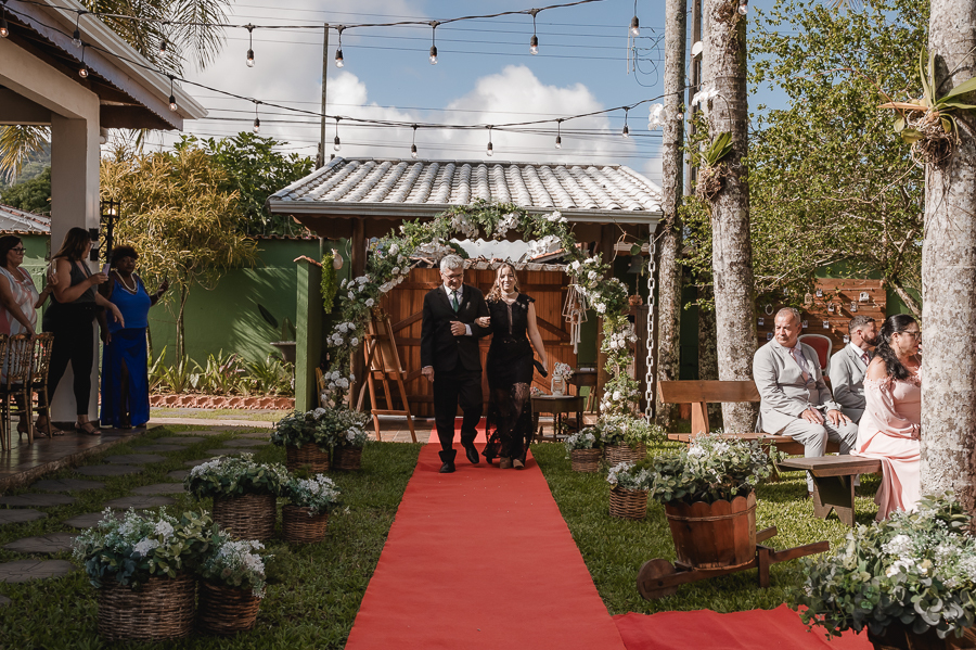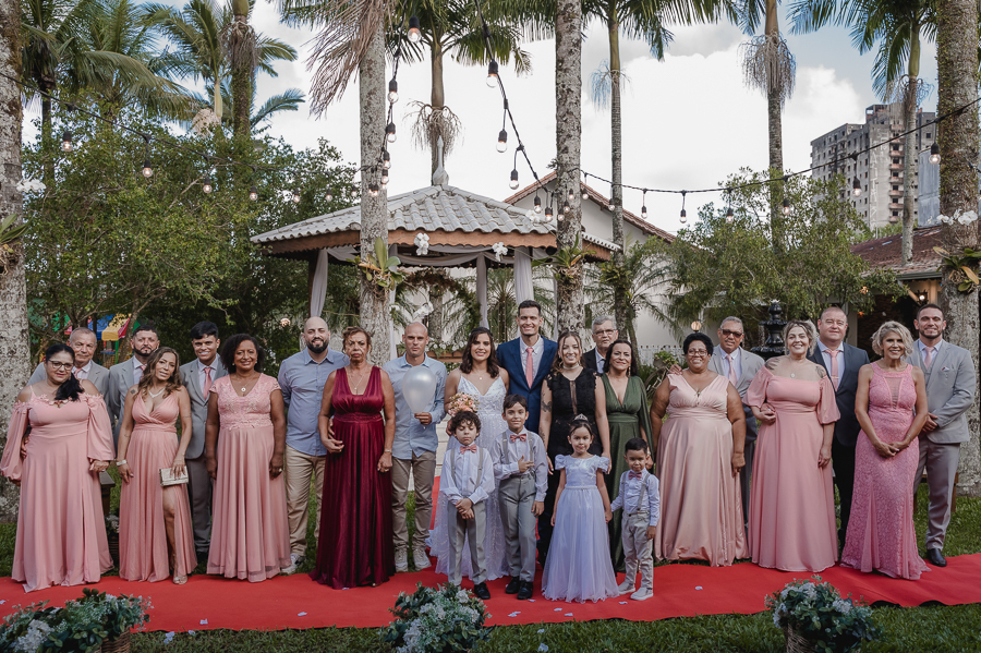 Após, seguimos para a cerimônia, realizada no Jardim das Orquídeas, em Praia Grande - SP, onde familiares e amigos esperavam ansiosos para ver o realização do sonho do casal de se tornarem um só.