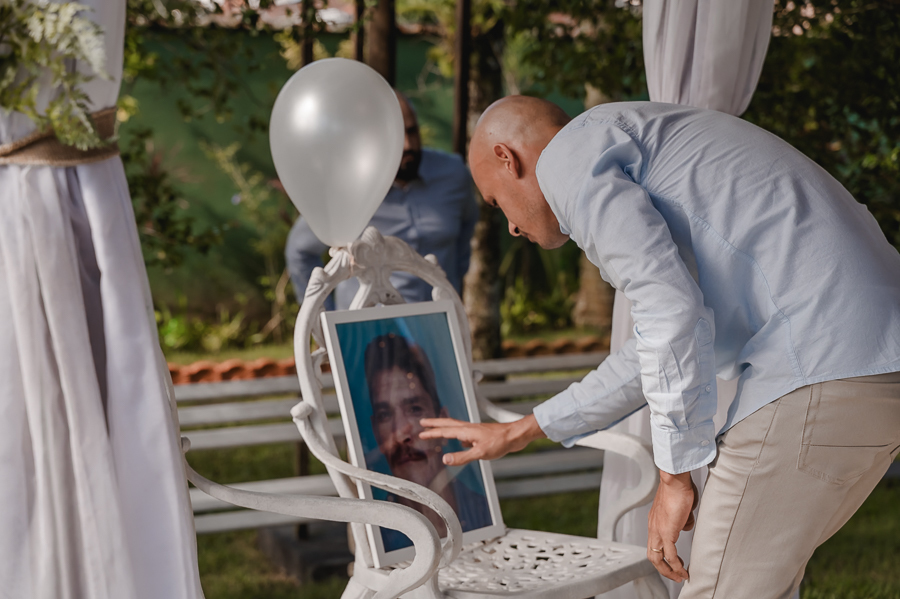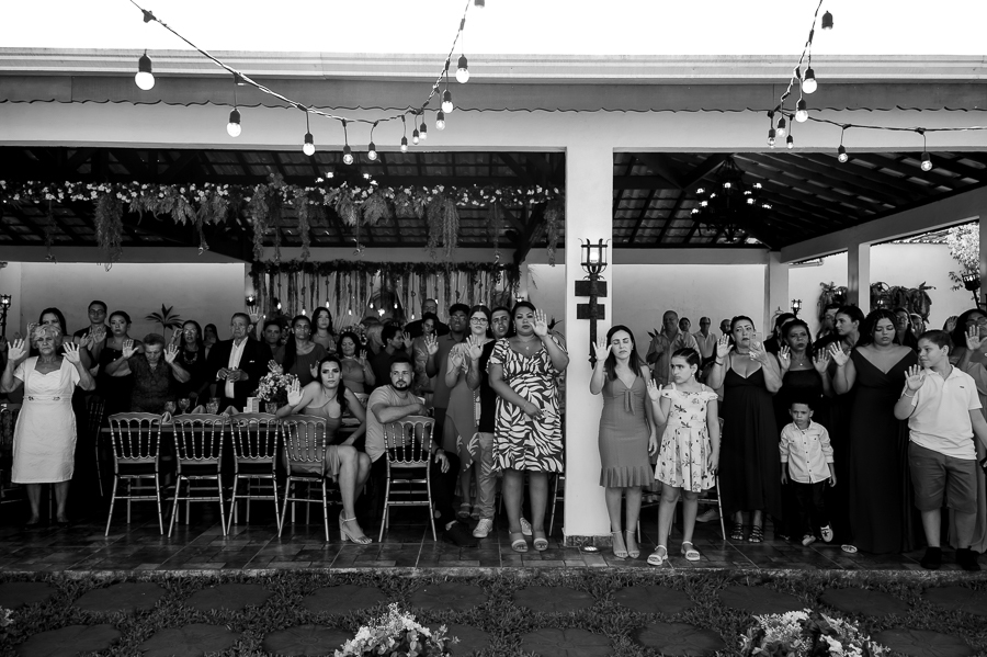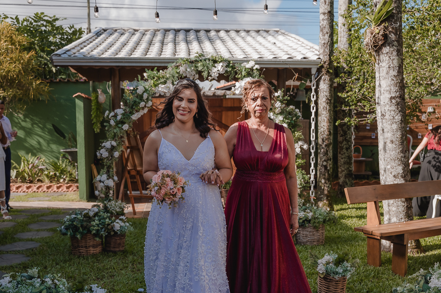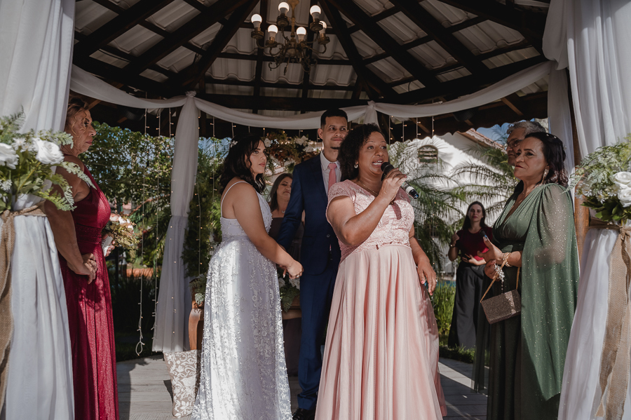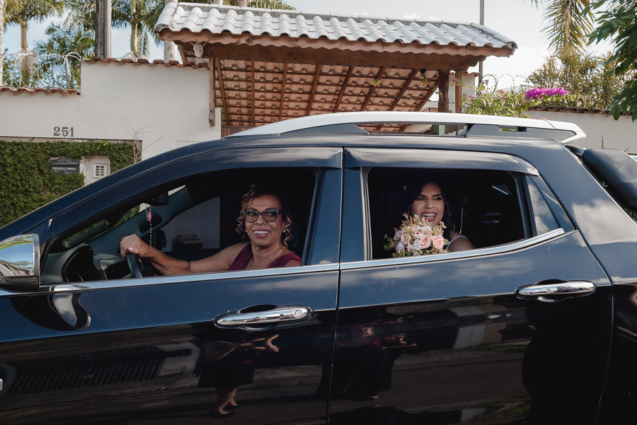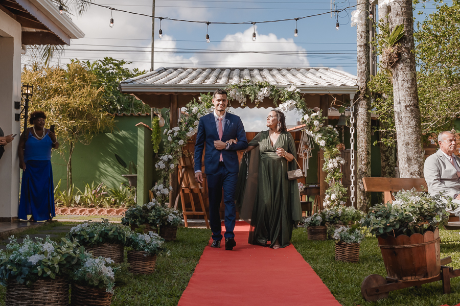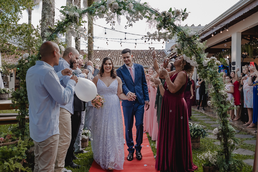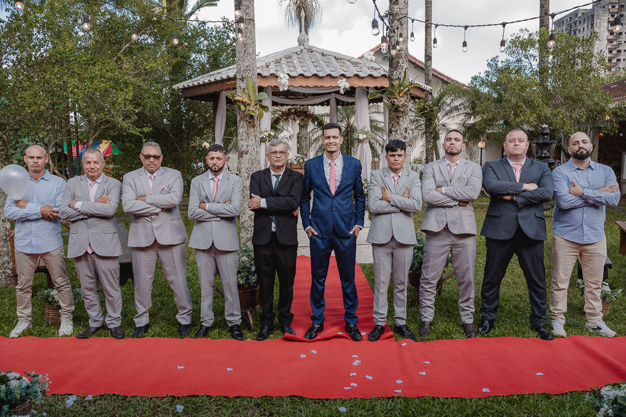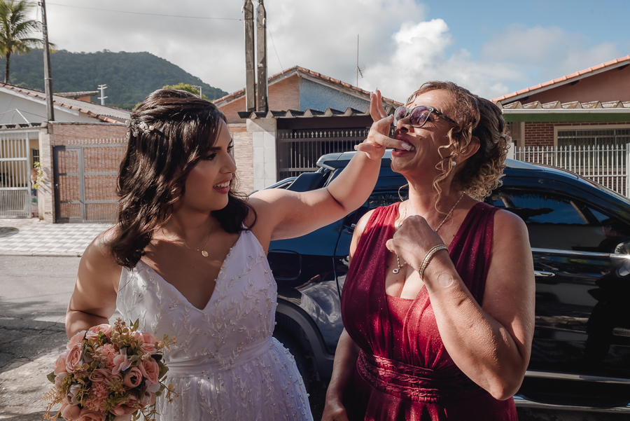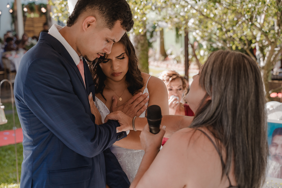 Após, seguimos para a cerimônia, realizada no Jardim das Orquídeas, em Praia Grande - SP, onde familiares e amigos esperavam ansiosos para ver o realização do sonho do casal de se tornarem um só.