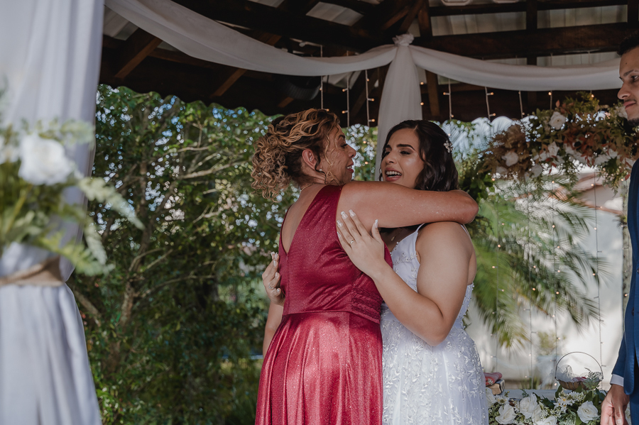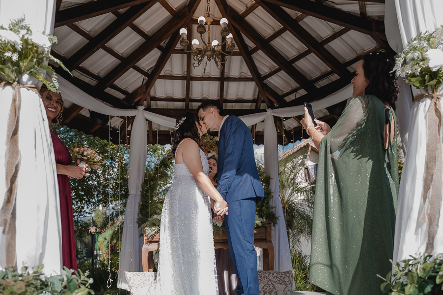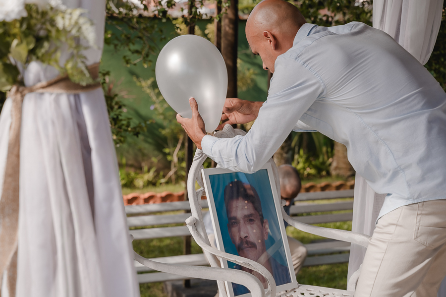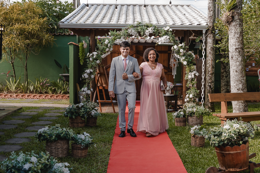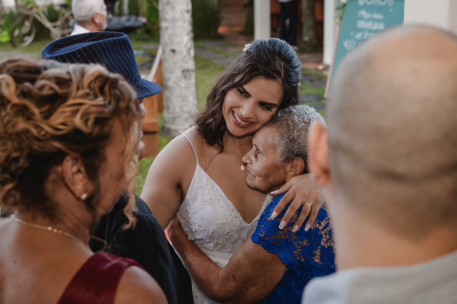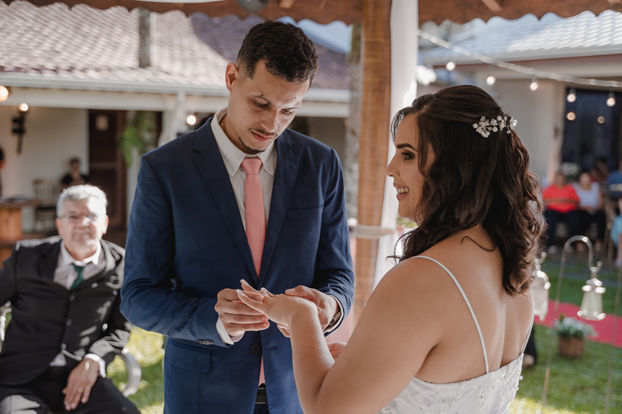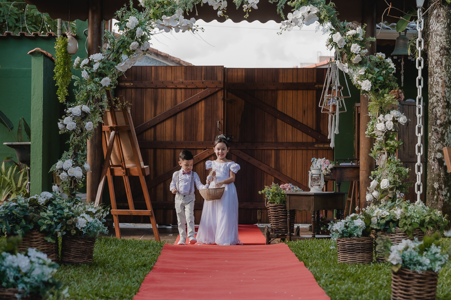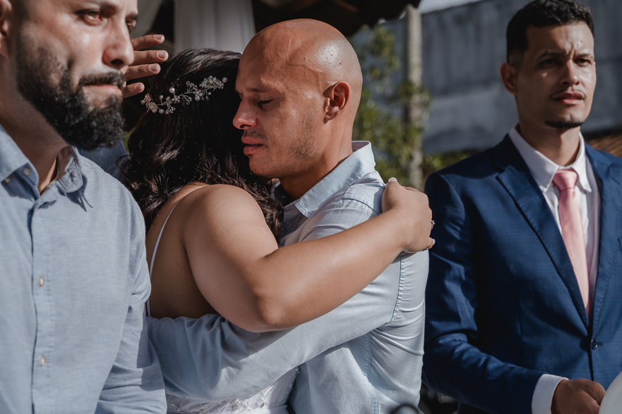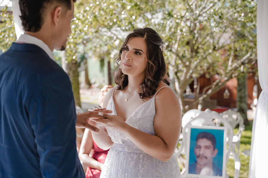 Após, seguimos para a cerimônia, realizada no Jardim das Orquídeas, em Praia Grande - SP, onde familiares e amigos esperavam ansiosos para ver o realização do sonho do casal de se tornarem um só.