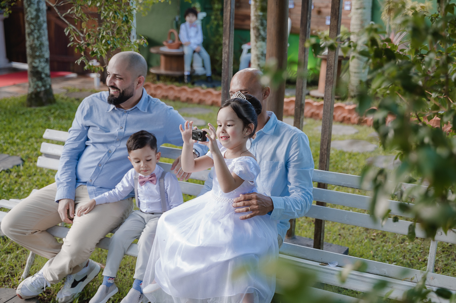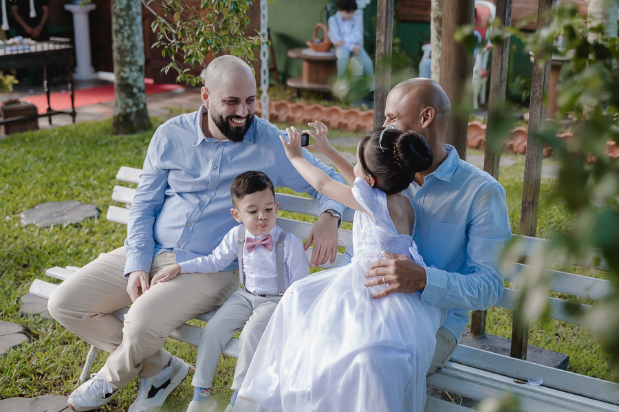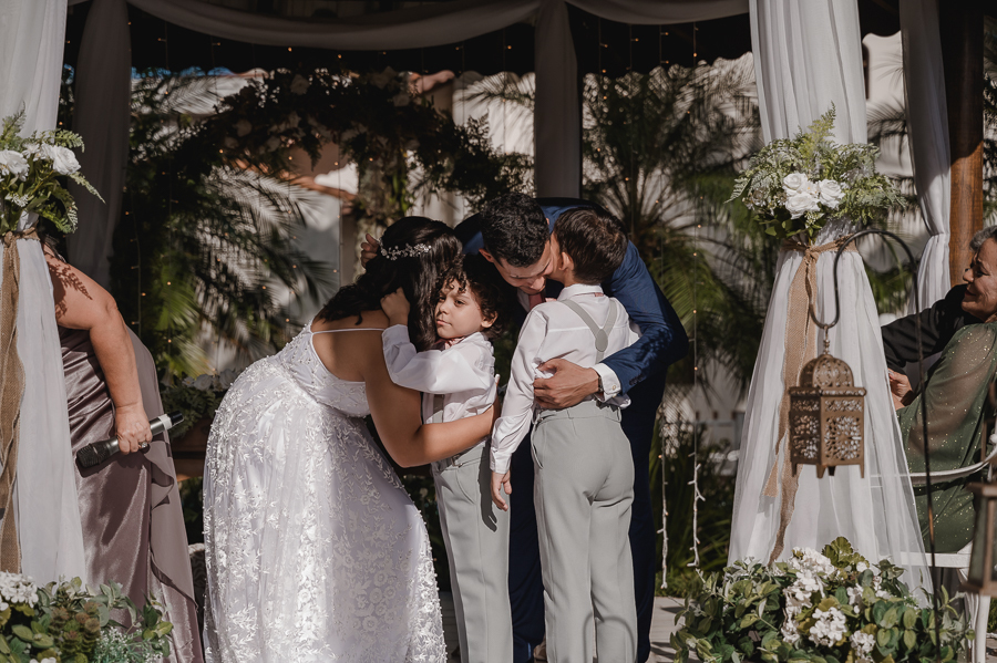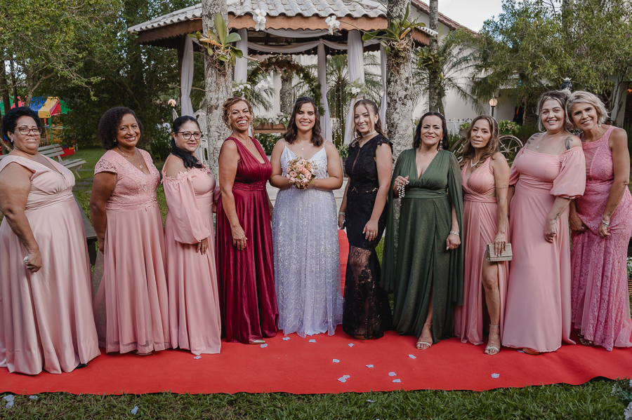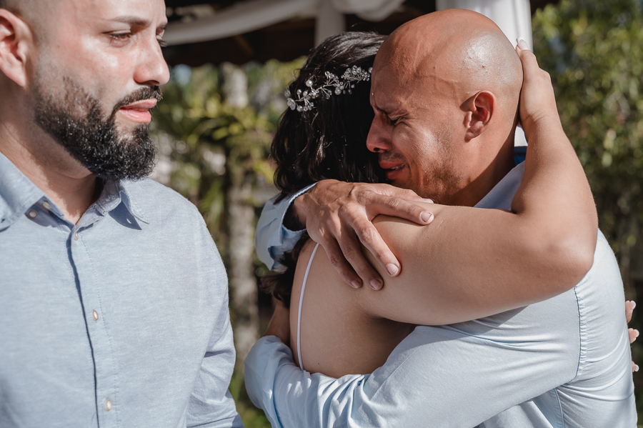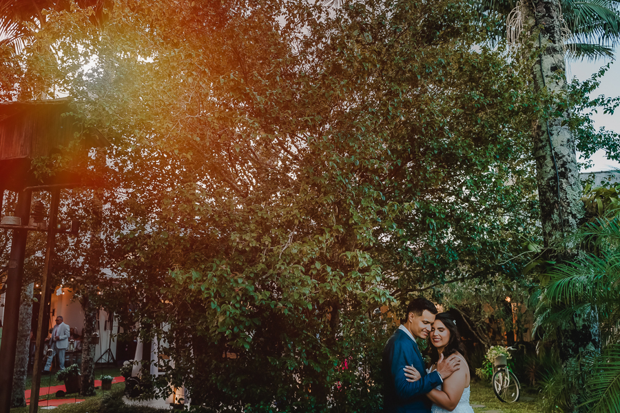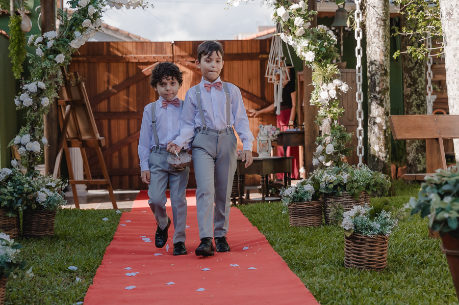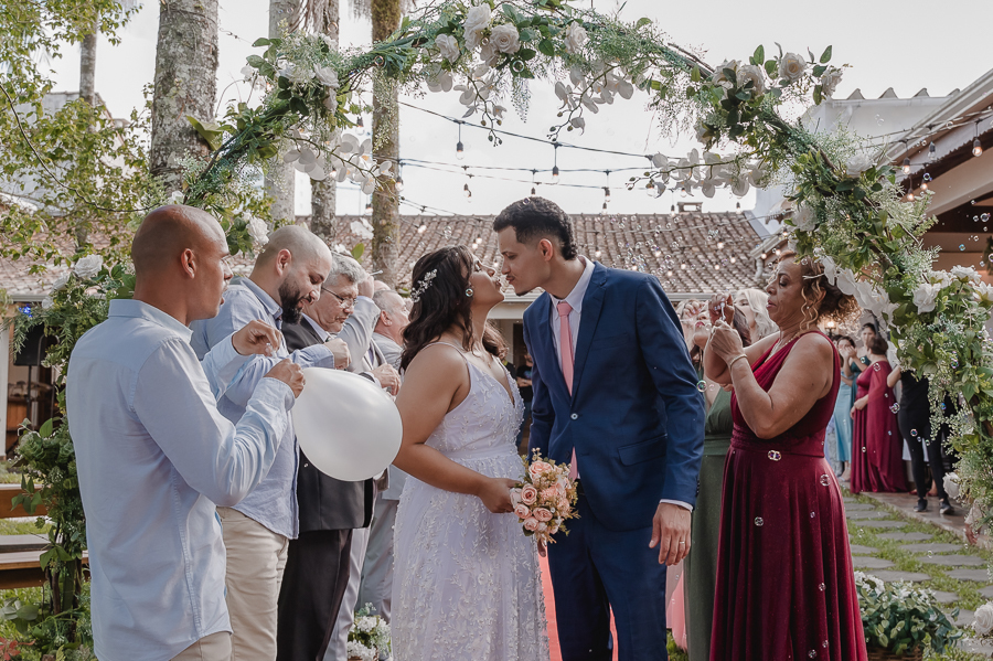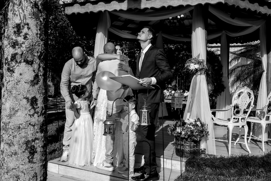 Após, seguimos para a cerimônia, realizada no Jardim das Orquídeas, em Praia Grande - SP, onde familiares e amigos esperavam ansiosos para ver o realização do sonho do casal de se tornarem um só.