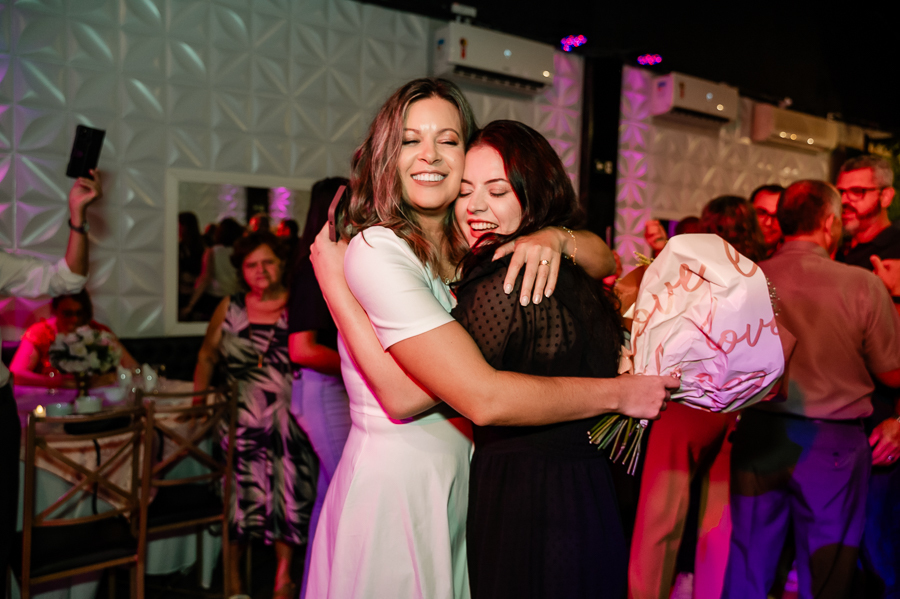 Ambos emocionados receberam os cumprimentos dos parentes e convidados. Depois houve muita dança e festa com o Renato e a Fernanda dançando com os amigos até a madrugada.