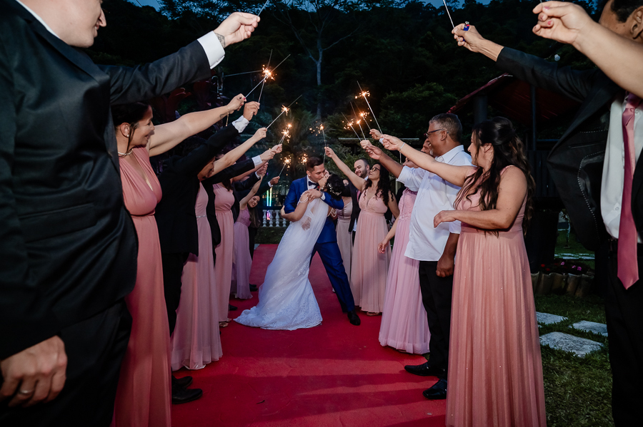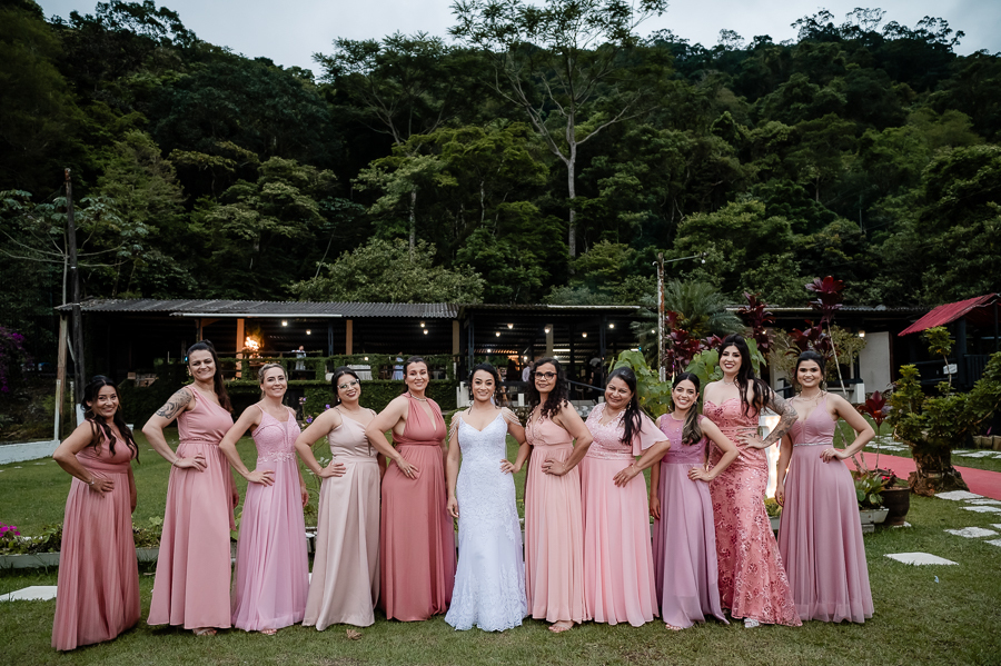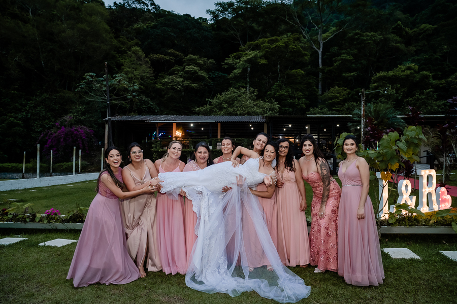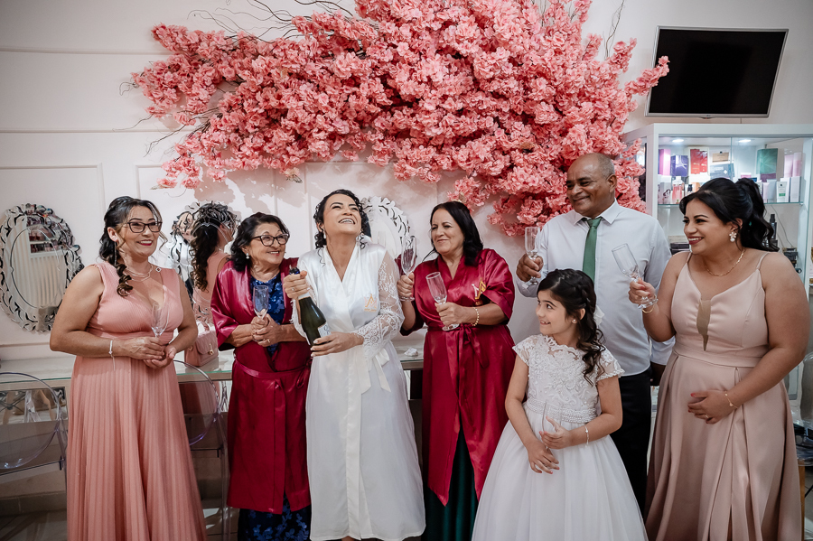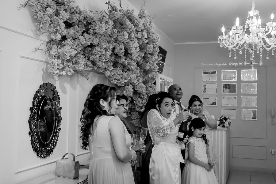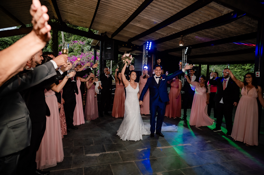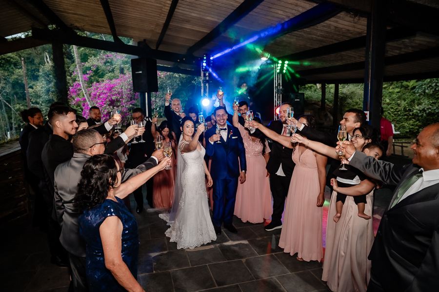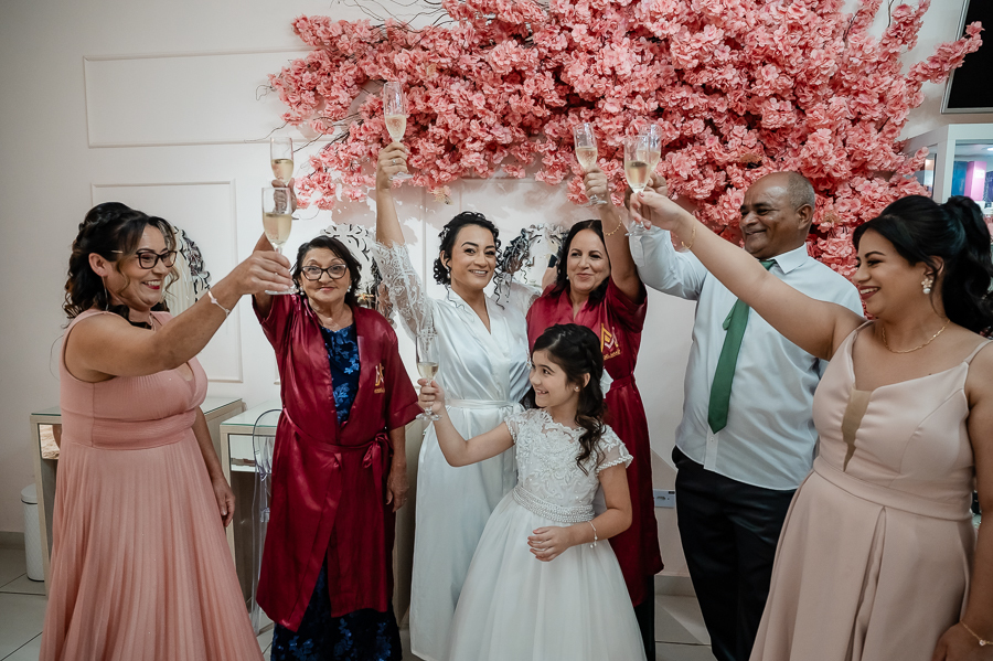 Ao chegarmos, fizemos fotos da Larissa e do Rafael no jardim, enquanto a assessora Nicolle organizou os pais da noiva, do noivo e os padrinhos e madrinhas para um brinde especial e assim, o casal entrou no salão com muita alegria. Depois voltamos para o jardim para registrarmos as fotos com os padrinhos e madrinhas com os noivos.