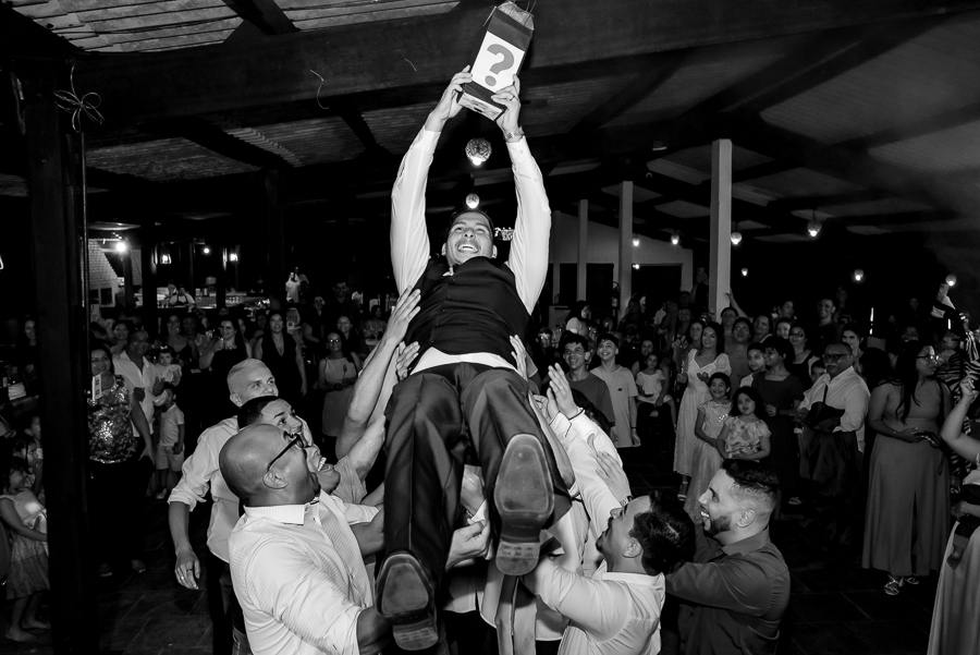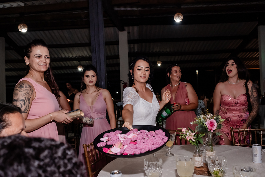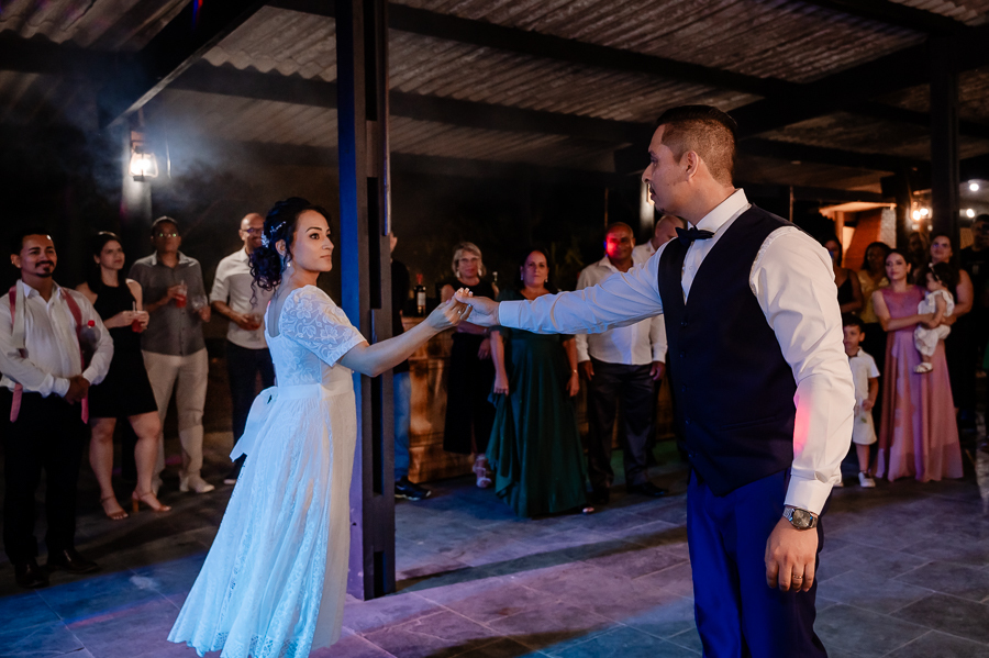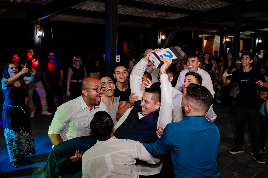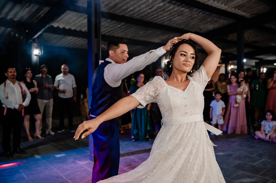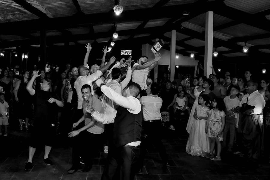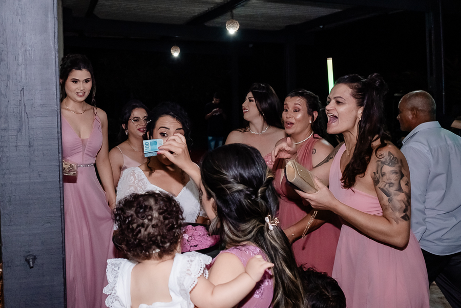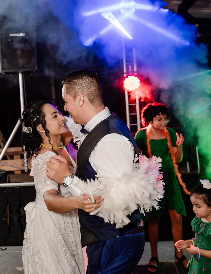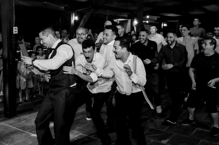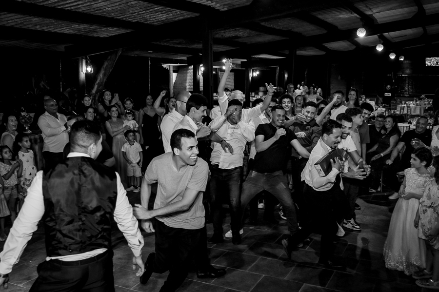 A festa seguiu com a passagem do sapatinho da noiva e gravata do noivo junto aos seus padrinhos e madrinhas. E para a surpresa de todos, o casal preparou uma dança maravilhosa antes de darem início a balada. E os dois deixaram a timidez de lado e arrasaram! Agora todos para a pista, onde festejaram muito com muita dança e muita alegria.