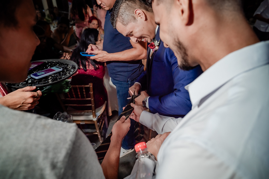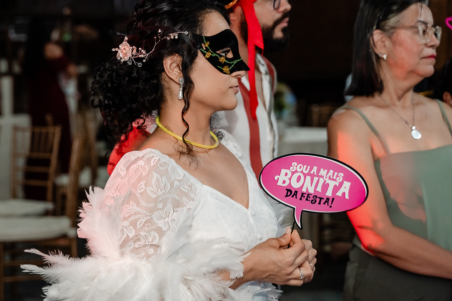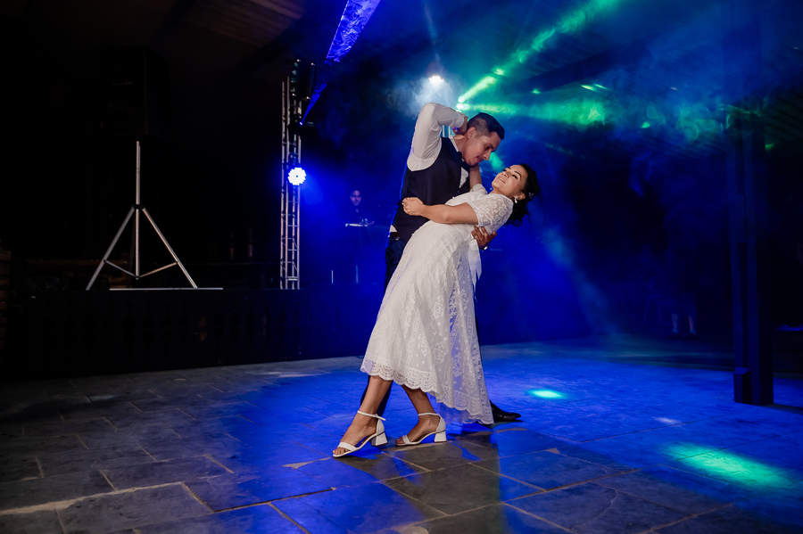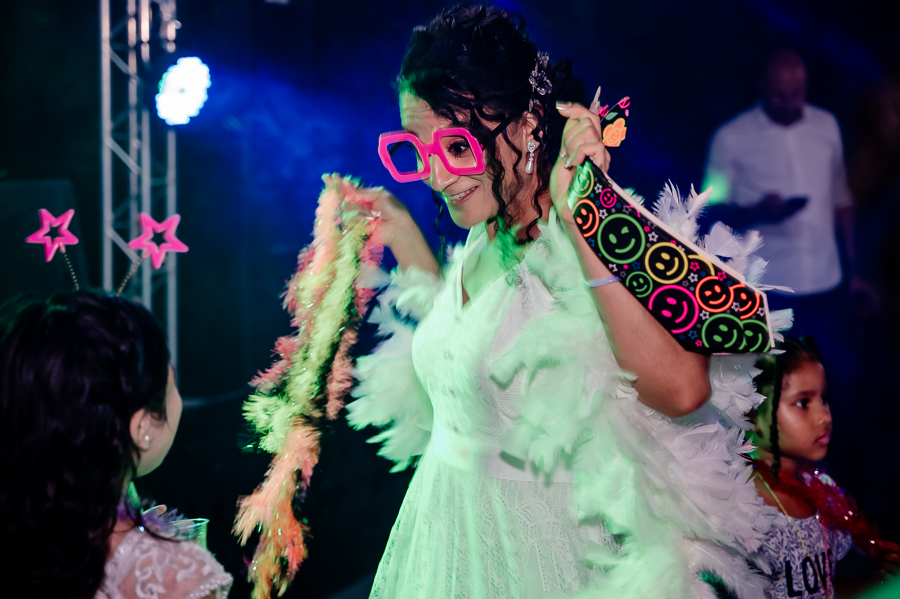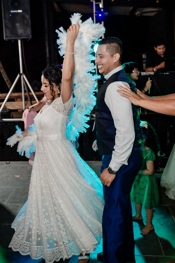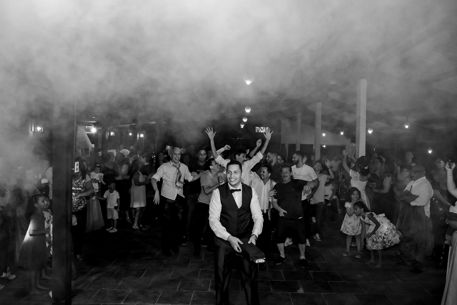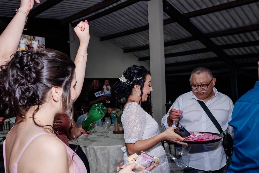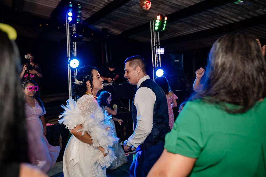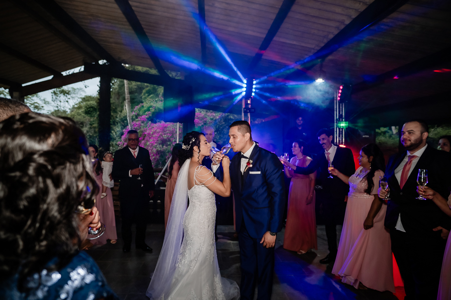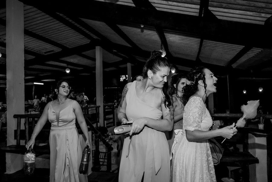 A festa seguiu com a passagem do sapatinho da noiva e gravata do noivo junto aos seus padrinhos e madrinhas. E para a surpresa de todos, o casal preparou uma dança maravilhosa antes de darem início a balada. E os dois deixaram a timidez de lado e arrasaram! Agora todos para a pista, onde festejaram muito com muita dança e muita alegria.