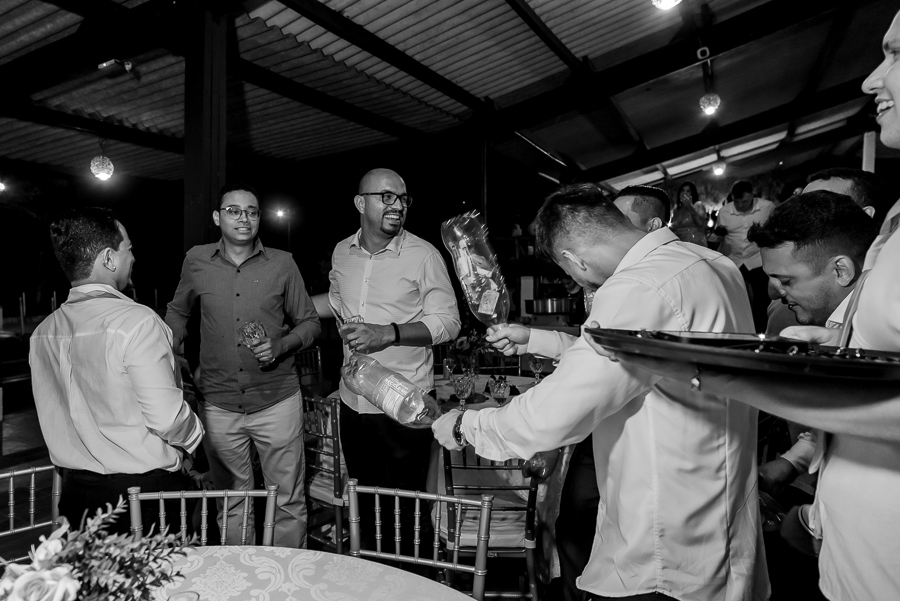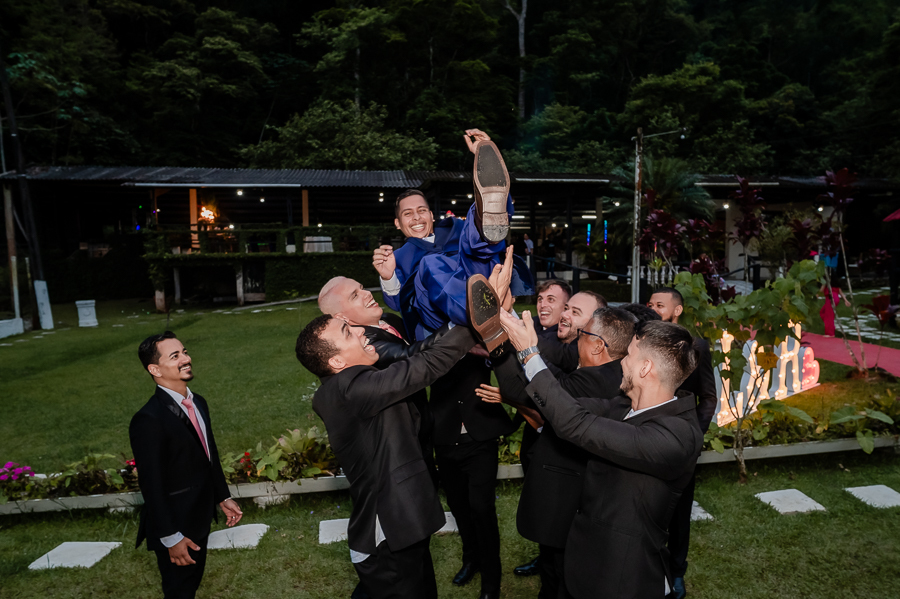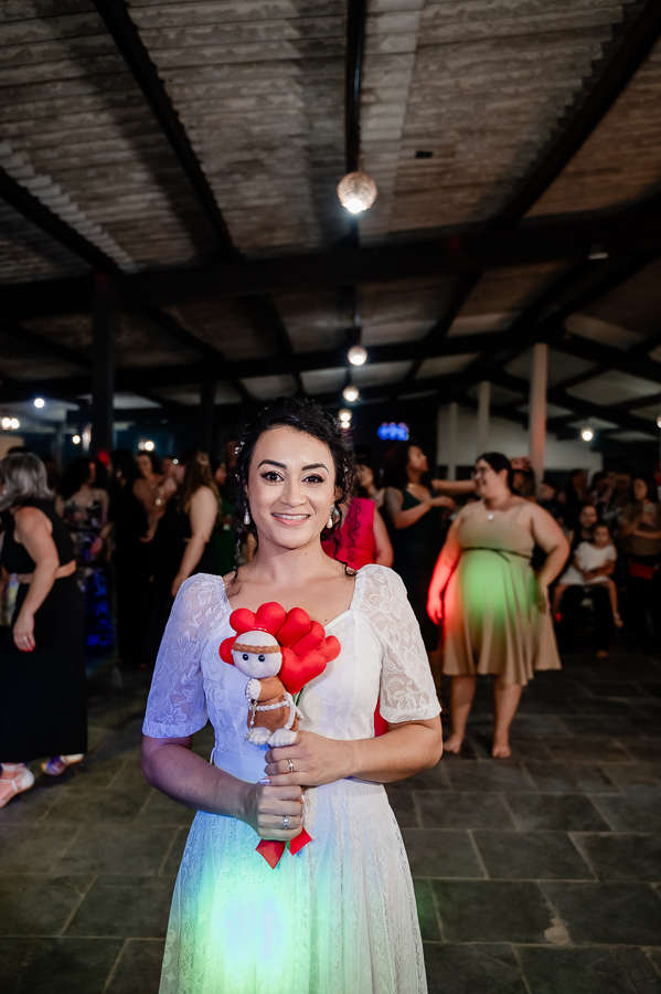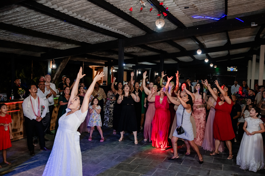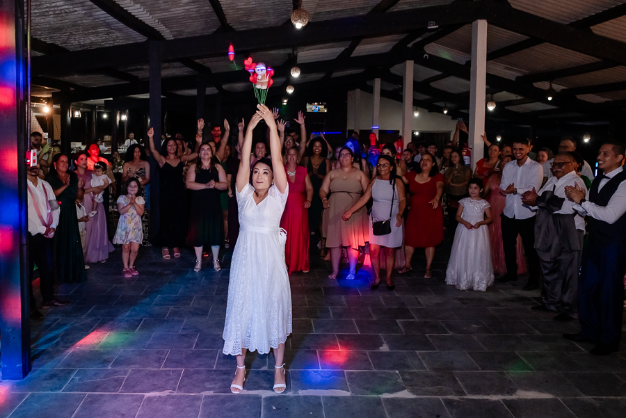 E é claro, que teve o momento de jogar o buquê e a Larissa escolheu um que desse oportunidade de mais amigas pegarem essa lembrança tão especial. O buquê de Santo Antônio. O Rafael também quis presentear os amigos e jogou a caixa de bebida.