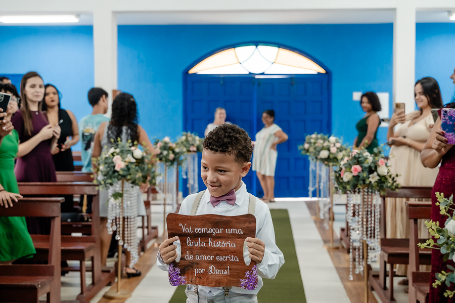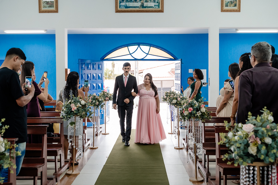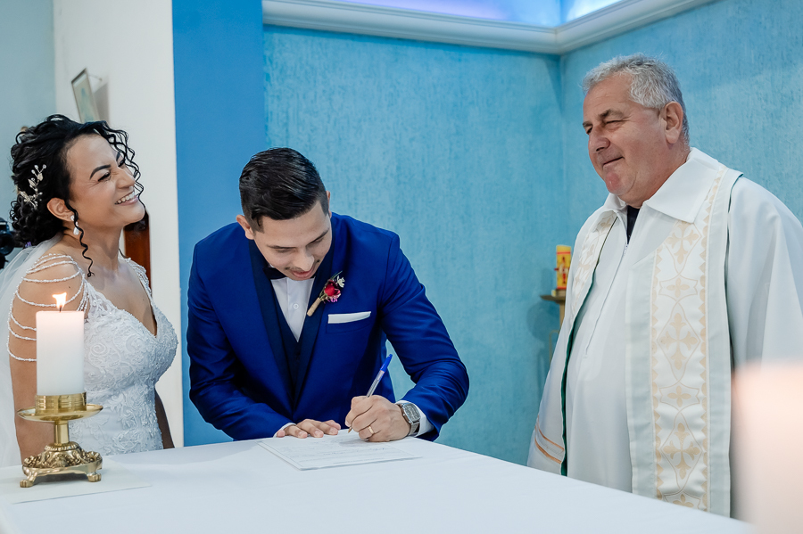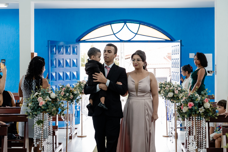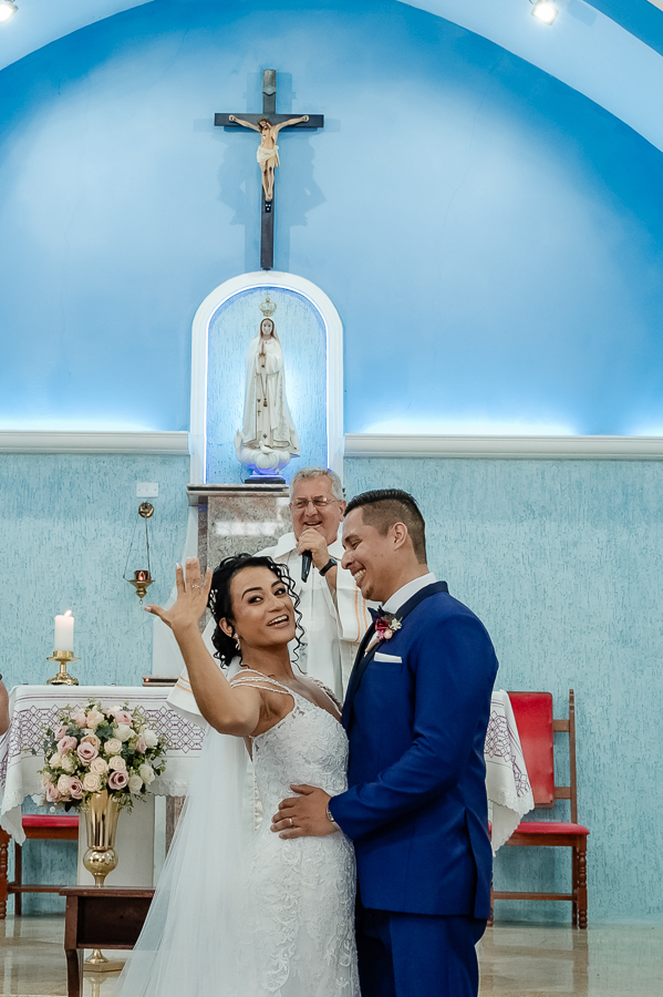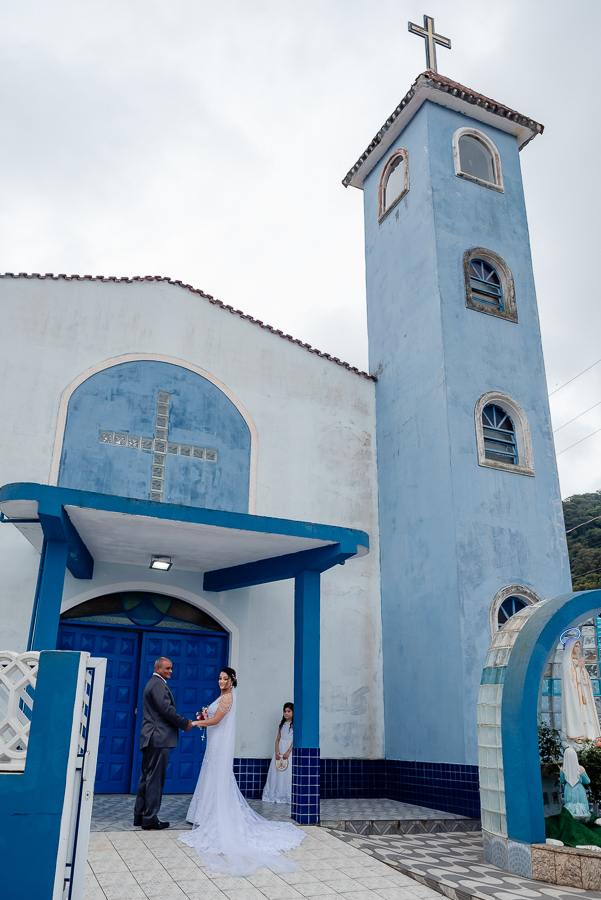 Seguimos para a igreja, a Comunidade Nossa Senhora de Fátima, também em Mongaguá - SP, onde o Rafael, as madrinhas, padrinhos e seus convidados aguardavam ansiosos pela chegada da Larissa.