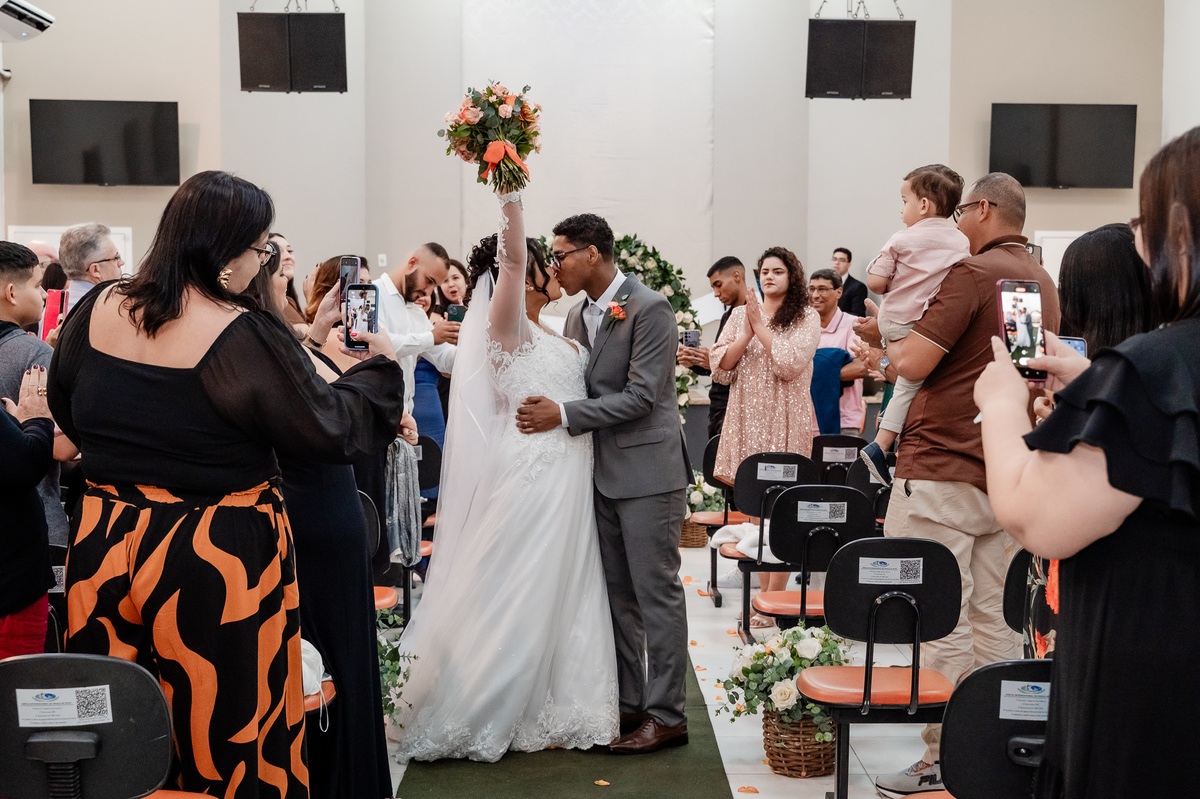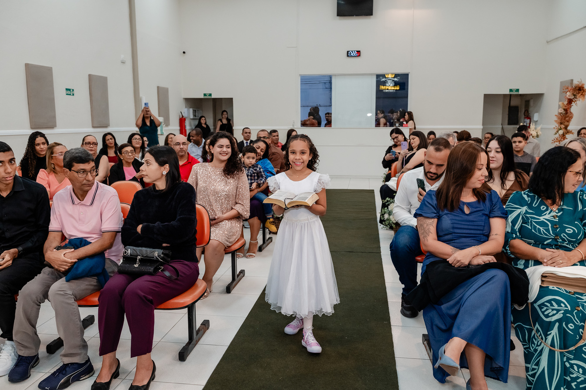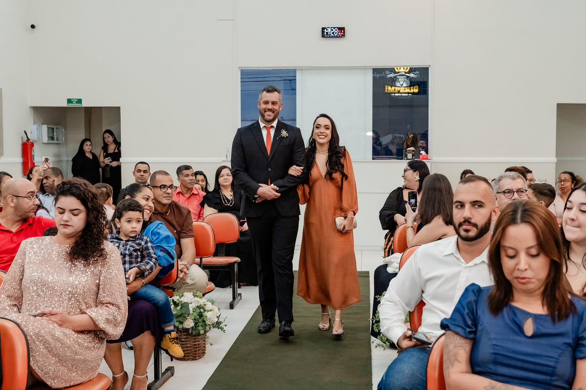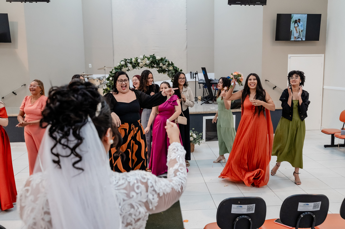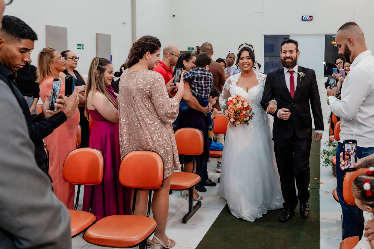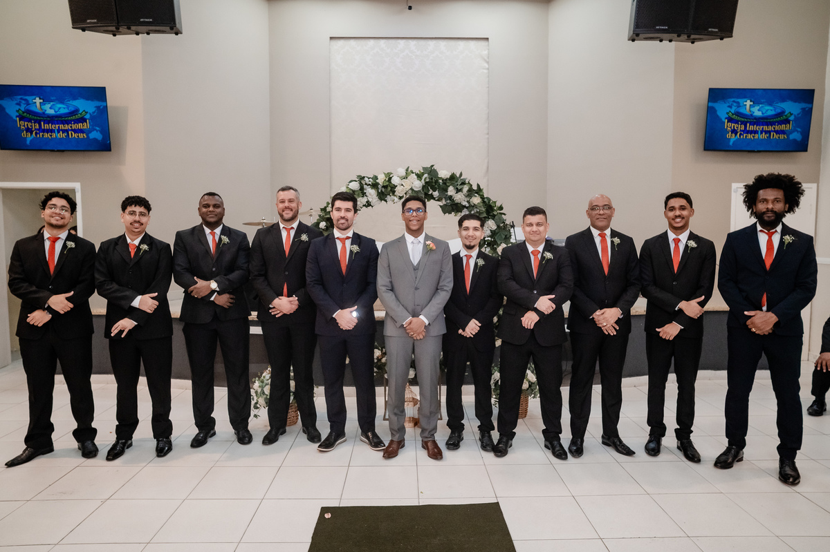 Seguimos para a cerimônia, que aconteceu na Igreja Internacional da Graça de Deus, em Praia Grande - SP, onde o Samuel, padrinhos, madrinhas e convidados, aguardavam a chegada da Vitória, sendo recepcionados pela querida Nicolle, assessora escolhida pelo casal.