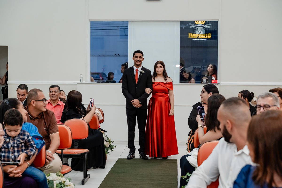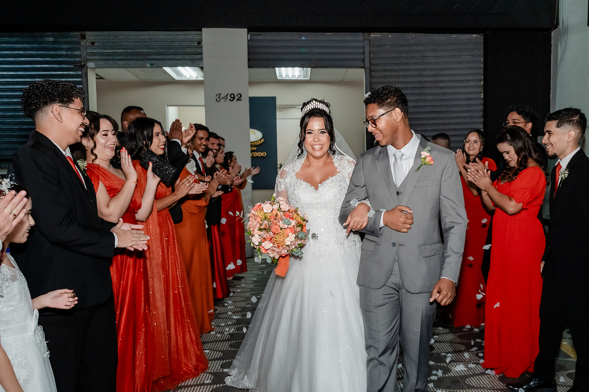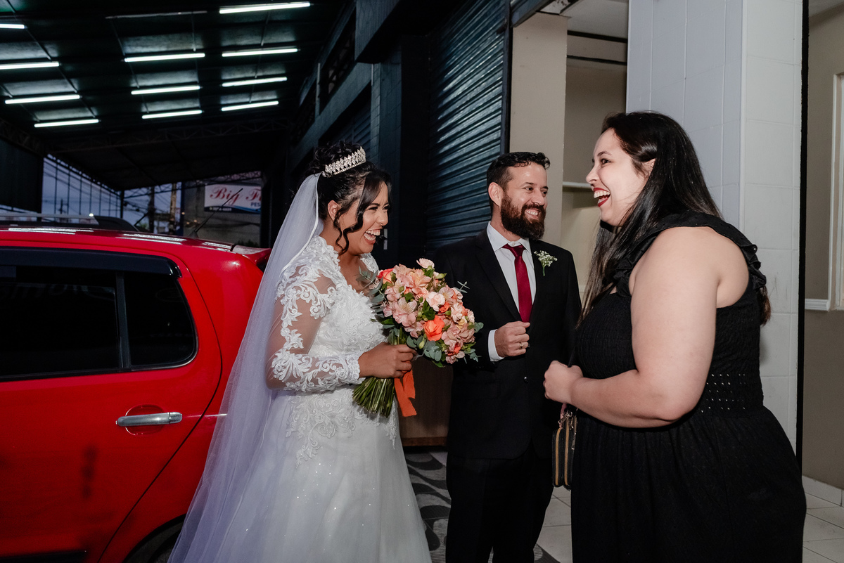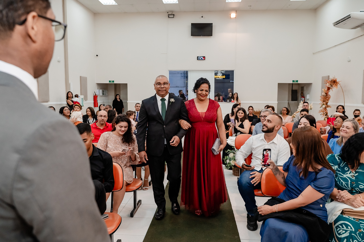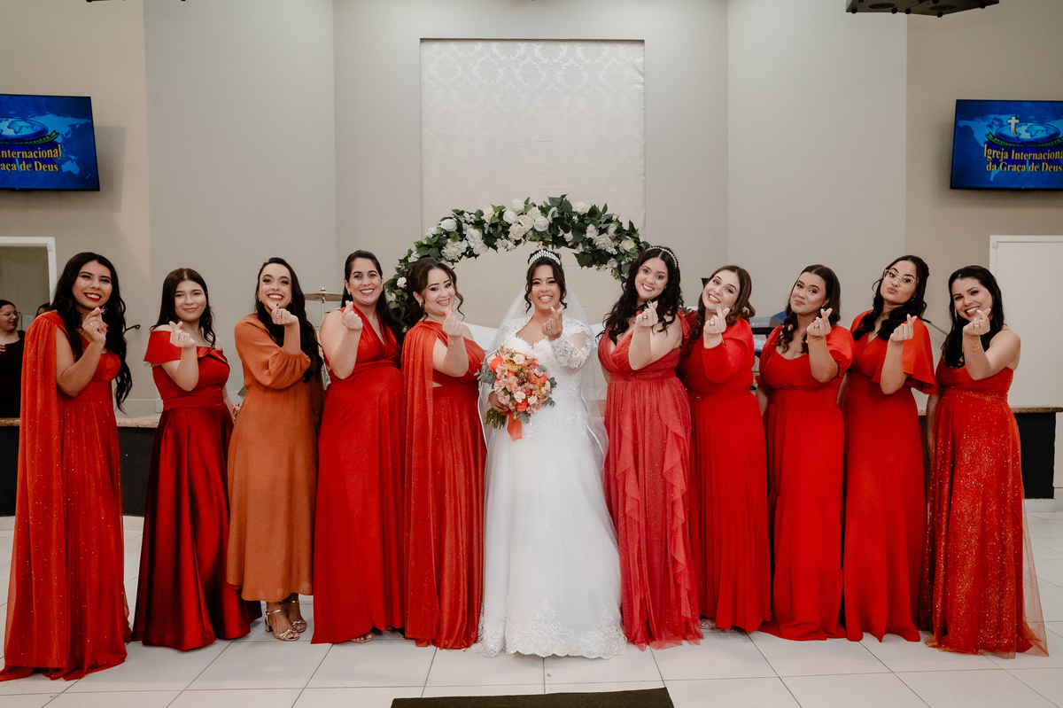 Seguimos para a cerimônia, que aconteceu na Igreja Internacional da Graça de Deus, em Praia Grande - SP, onde o Samuel, padrinhos, madrinhas e convidados, aguardavam a chegada da Vitória, sendo recepcionados pela querida Nicolle, assessora escolhida pelo casal.