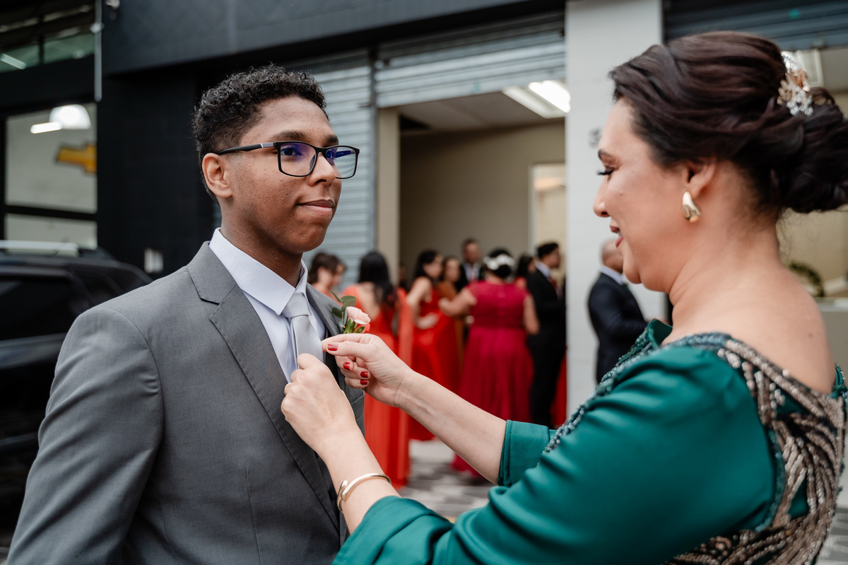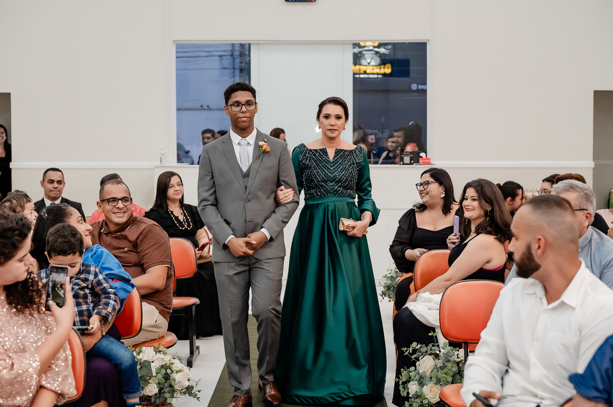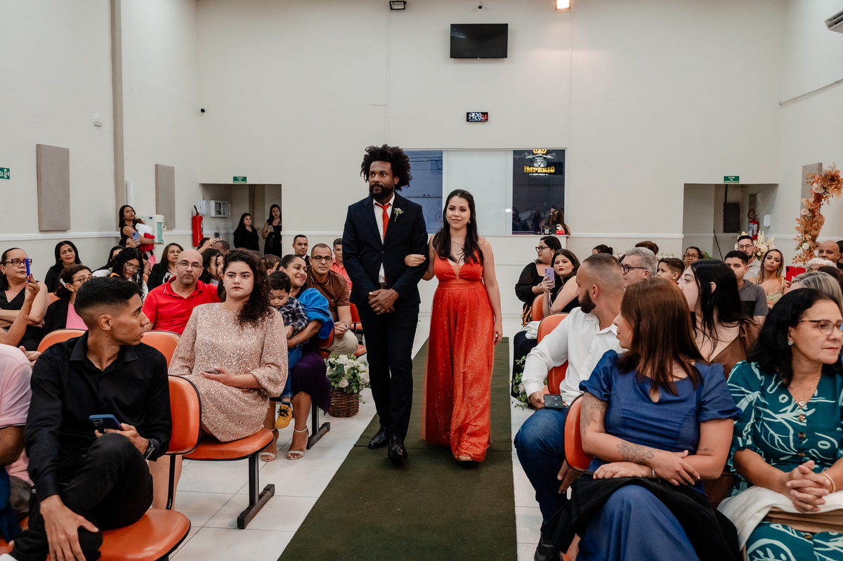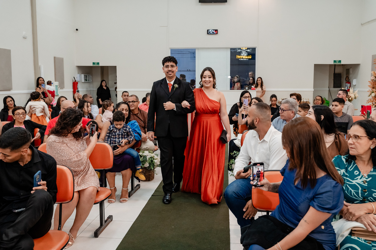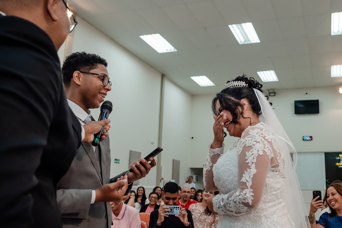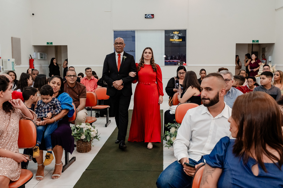 Seguimos para a cerimônia, que aconteceu na Igreja Internacional da Graça de Deus, em Praia Grande - SP, onde o Samuel, padrinhos, madrinhas e convidados, aguardavam a chegada da Vitória, sendo recepcionados pela querida Nicolle, assessora escolhida pelo casal.