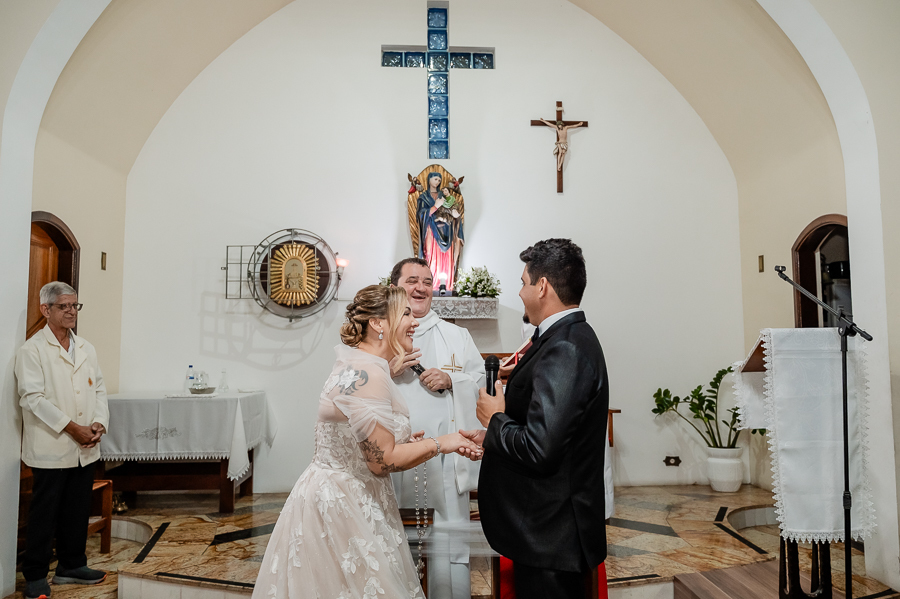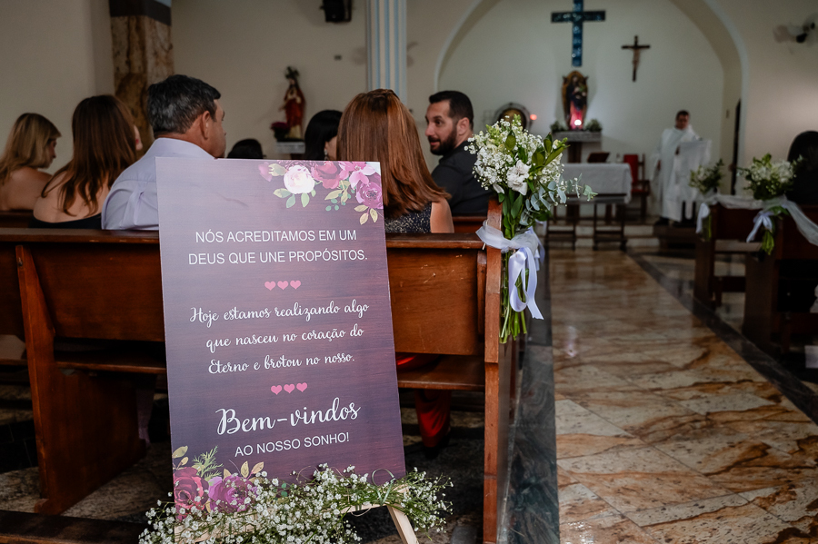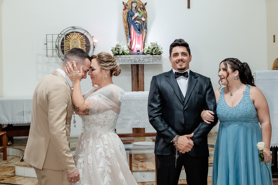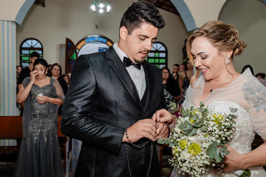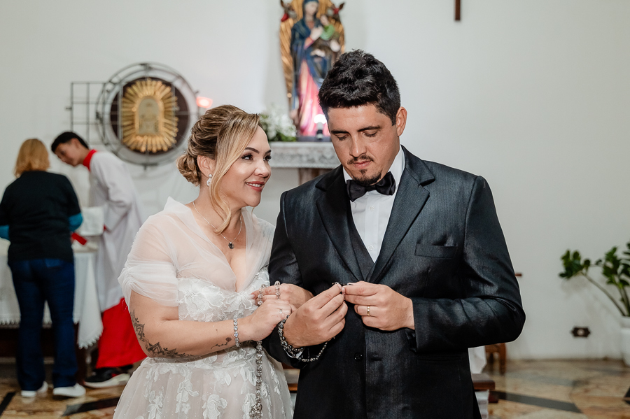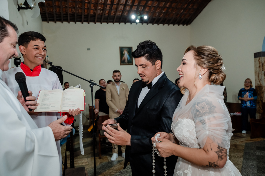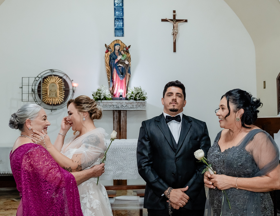 Foi uma linda cerimônia onde a Rosiane e o Caio receberam a benção do padre Rogério de toda a família e amigos presentes. Realizaram seu desejo de estarem em comunhão com Deus e vivenciaram tudo com muita emoção.