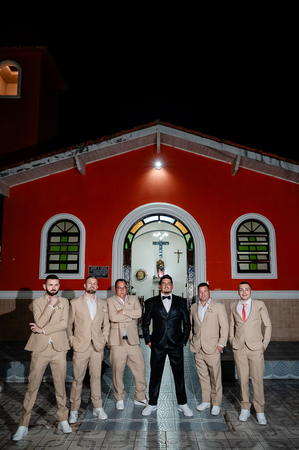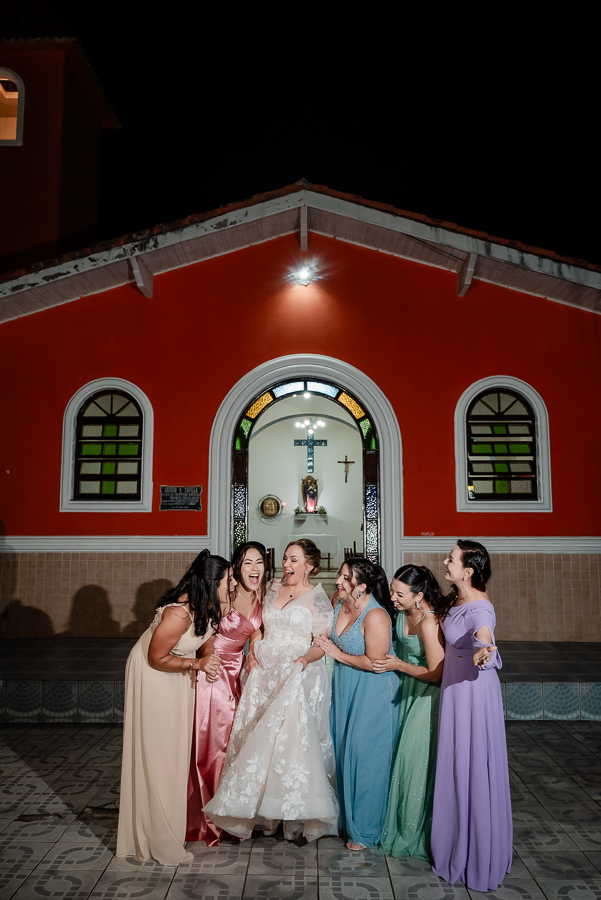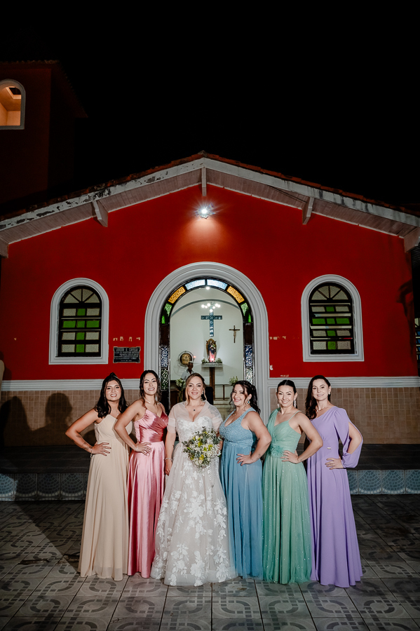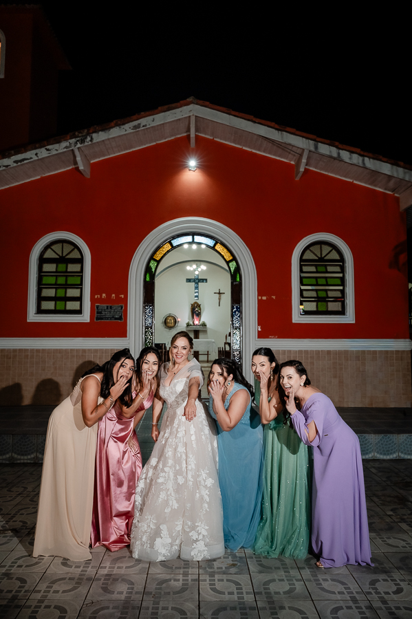 Depois de pronta, com seu vestido deslumbrante tivemos tempo para fotos dela com as madrinhas, que chegaram para ver a noiva antes do casamento. Tudo pronto seguimos para a capela Ns. Sra. do Perpétuo do Socorro, também em Mongaguá - Sp.
