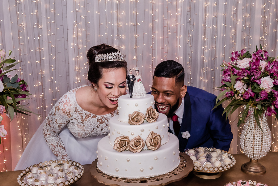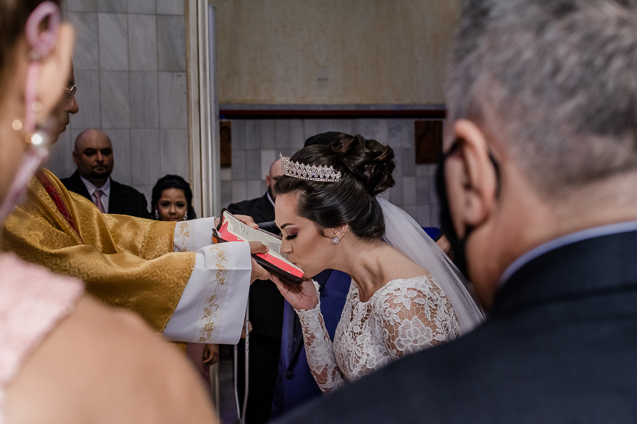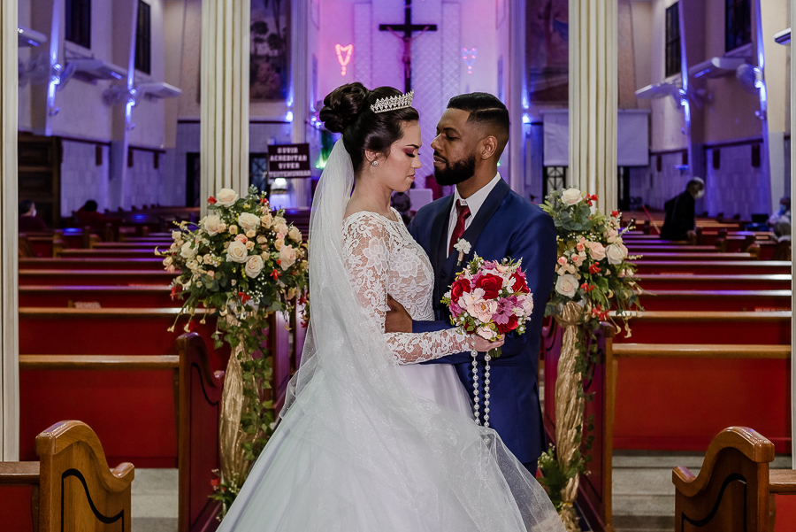 Depois um ensaio do casal feito na igreja, enquanto os convidados se dirigiam para a festa, realizada no Buffet Beleléu, em Praia Grande - SP.