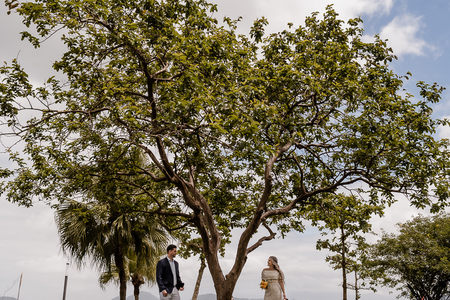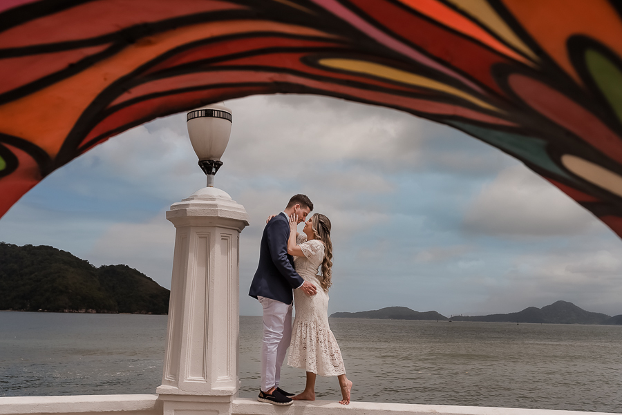 Eles escolheram a ponta da praia como cenário de suas fotos porque a Raphaela é surfista, ama a praia e o mar. E aproveitamos também a praça em frente ao Aquário, que acrescentou um pouquinho mais de natureza, com suas lindas árvores. Depois, seguimos em direção a escultura em frente ao mar, com o nome da cidade de Santos. E eles foram ousados, para fazerem umas fotos nas pedras, a Rapha tirou suas sandálias e subiu na mureta junto com o Kauê, para sentarem nas pedras de encontro ao mar.
