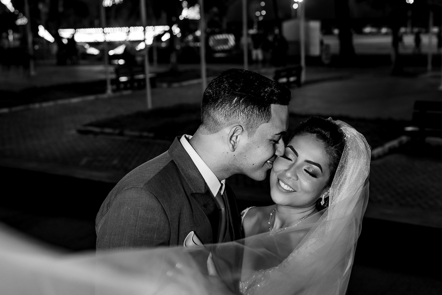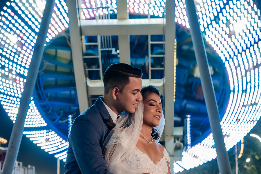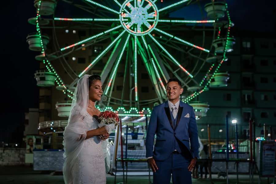 Depois, um lindo ensaio do casal ao lado da Igreja, com um cenário de Parque de Diversões, que combinou muito com eles já que são românticos e divertidos.