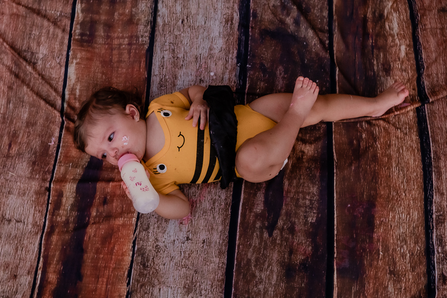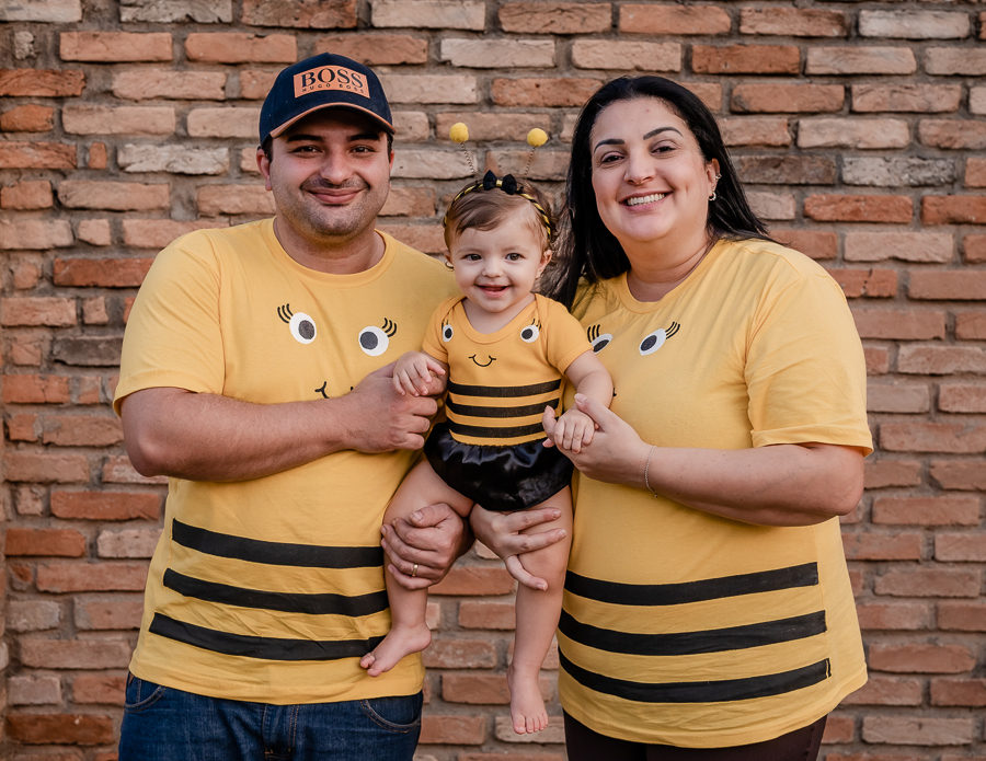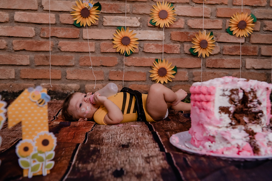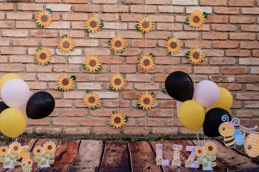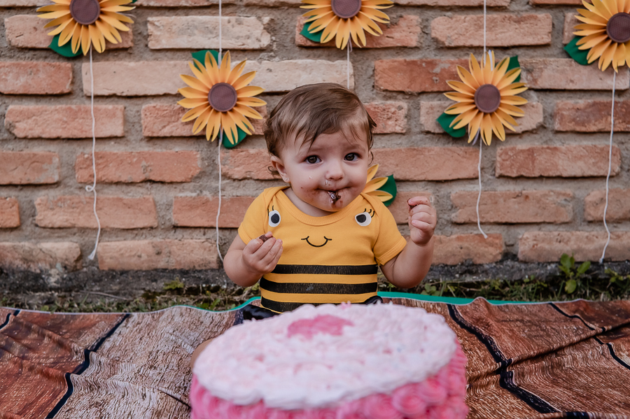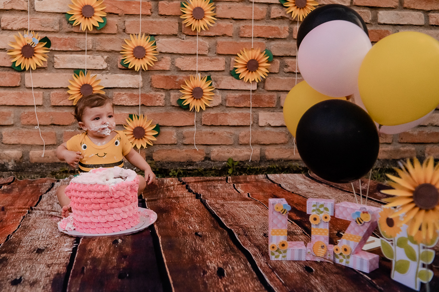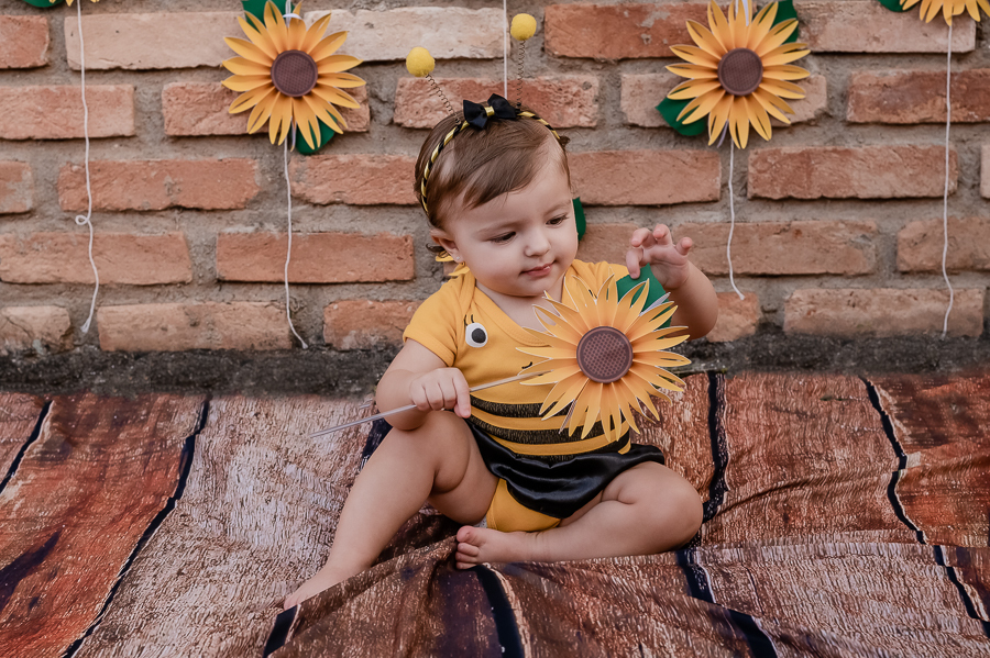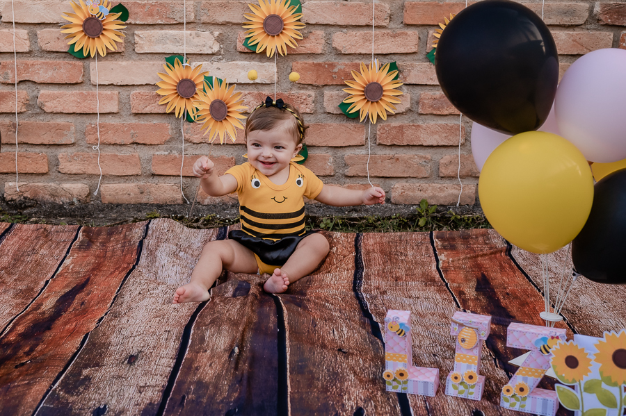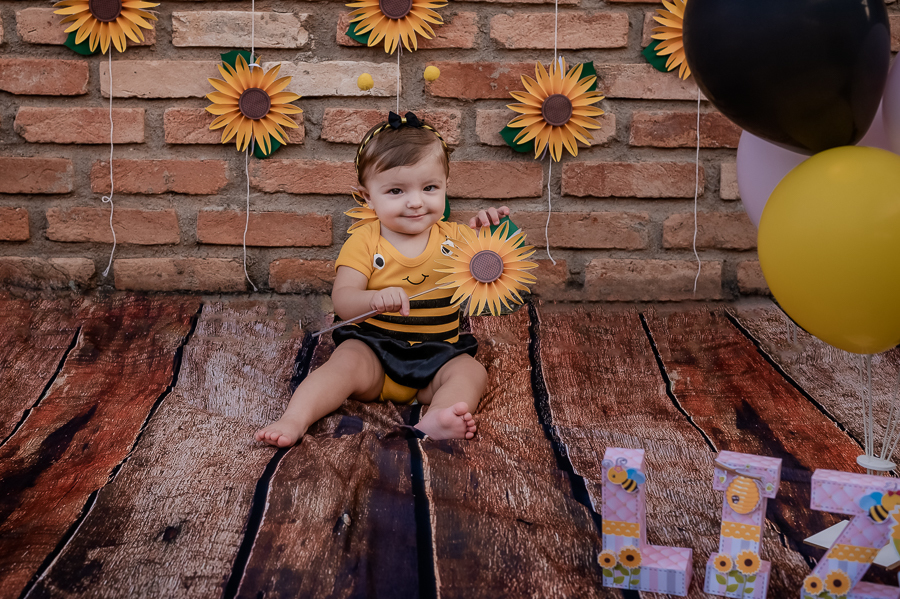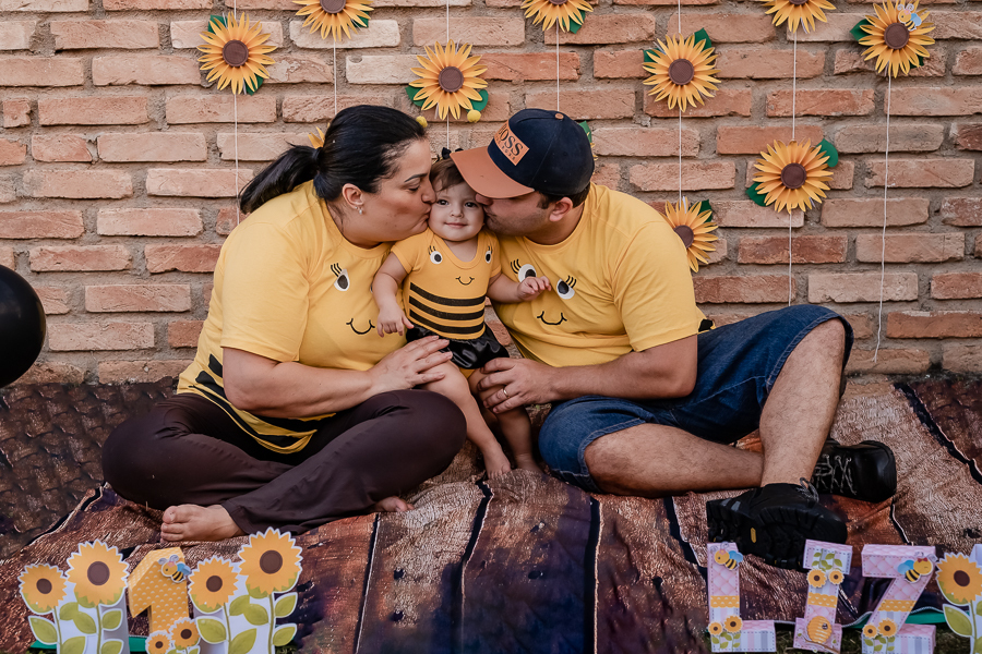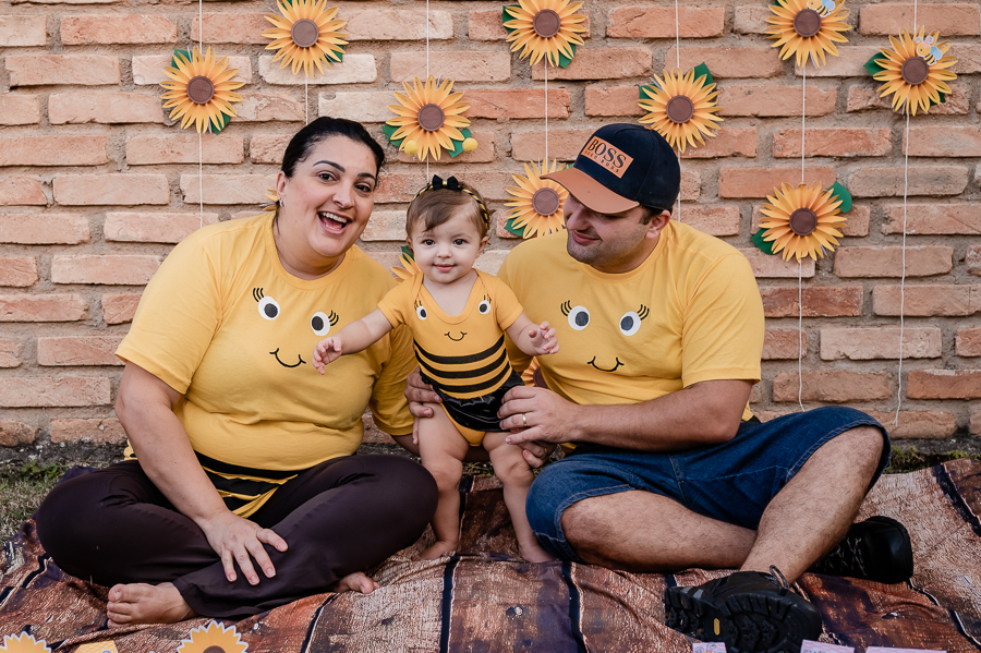 A mamãe muito habilidosa preparou o tema do ensaio, que foi realizado na casa da dona Cida, vizinha e amiga do casal, em Mongaguá -SP, com todo carinho. A Pri tirava fotos mensais da Liz em uma roupinha de abelhinha, a mesma que ela utilizou no Smash the Cake, então ela aproveitou a ideia e criou uma linda decoração, com girassóis, borboletas e abelhinhas. Fez também uma camiseta para ela e para o Robson. E o jardim da casa da dona Cida foi o cenário perfeito para completar.