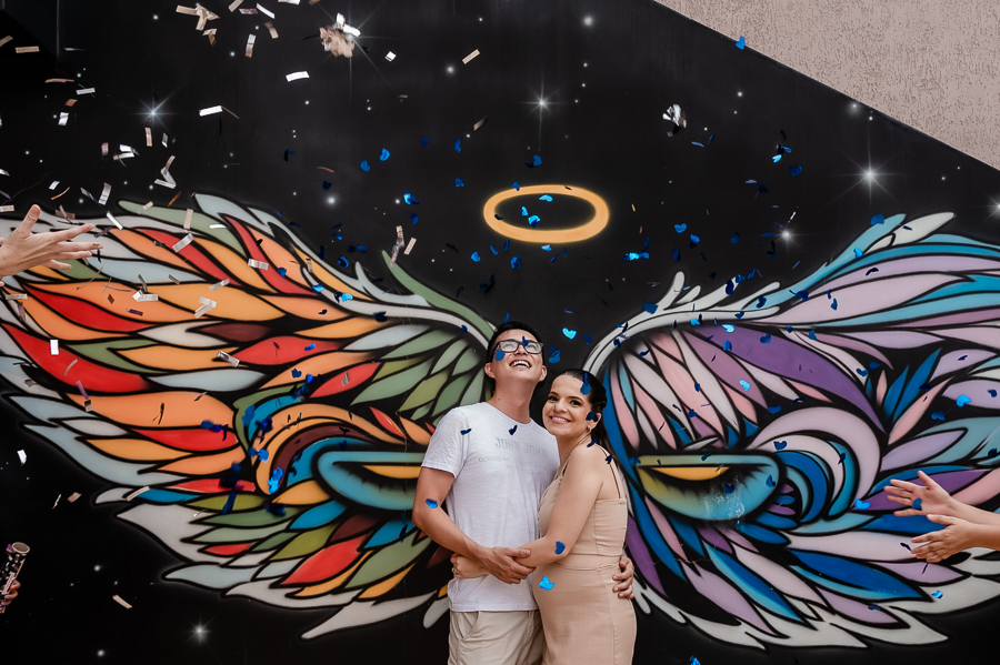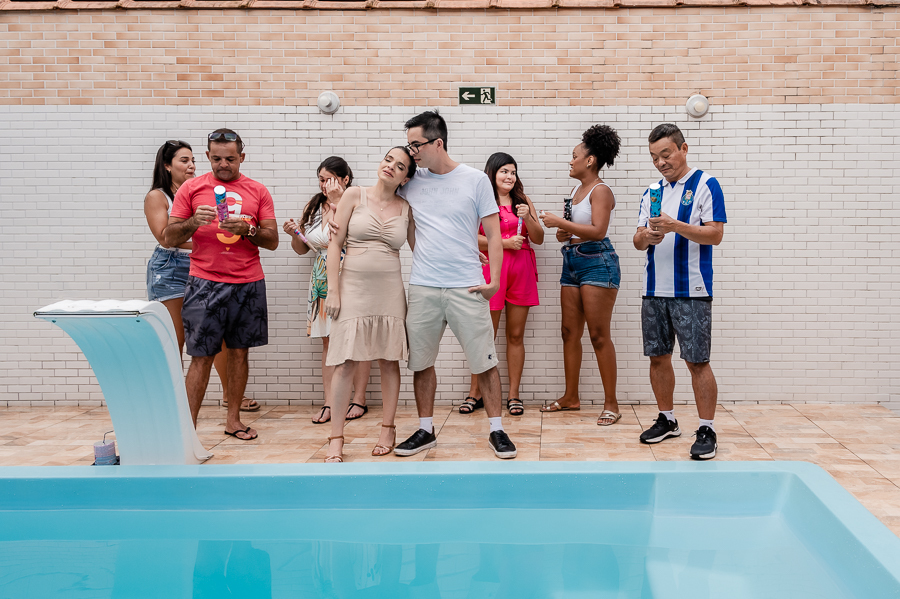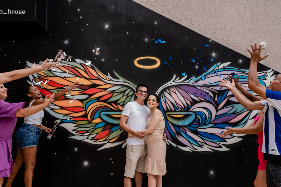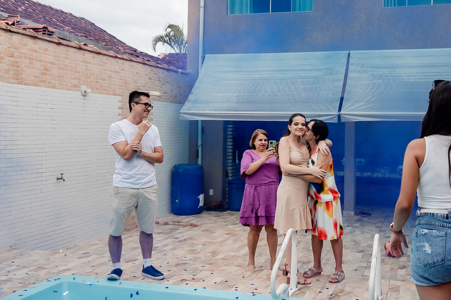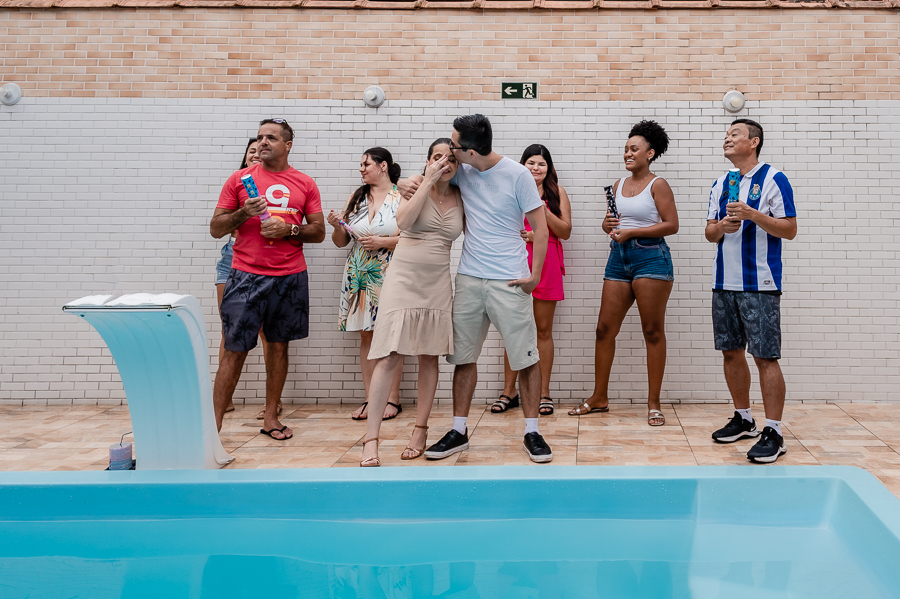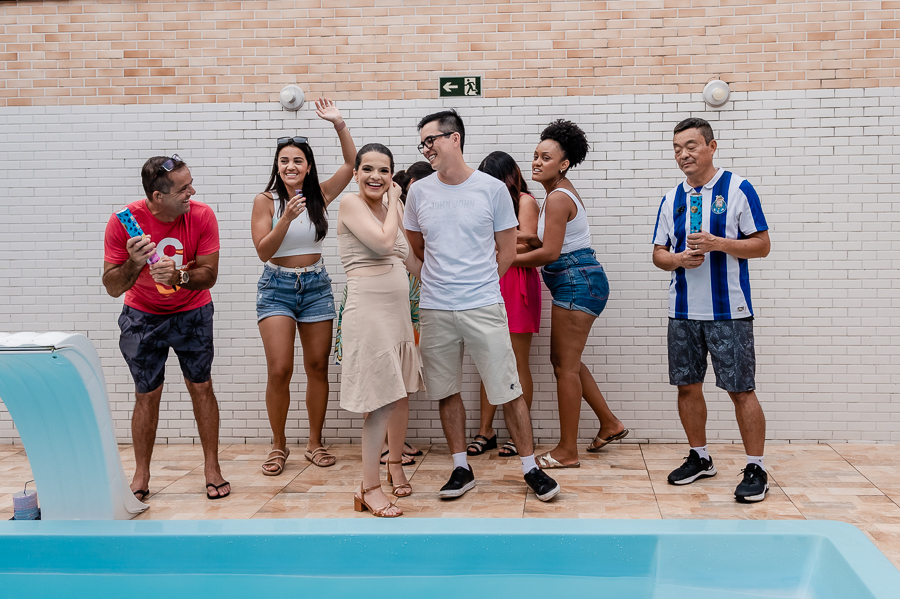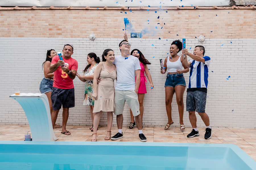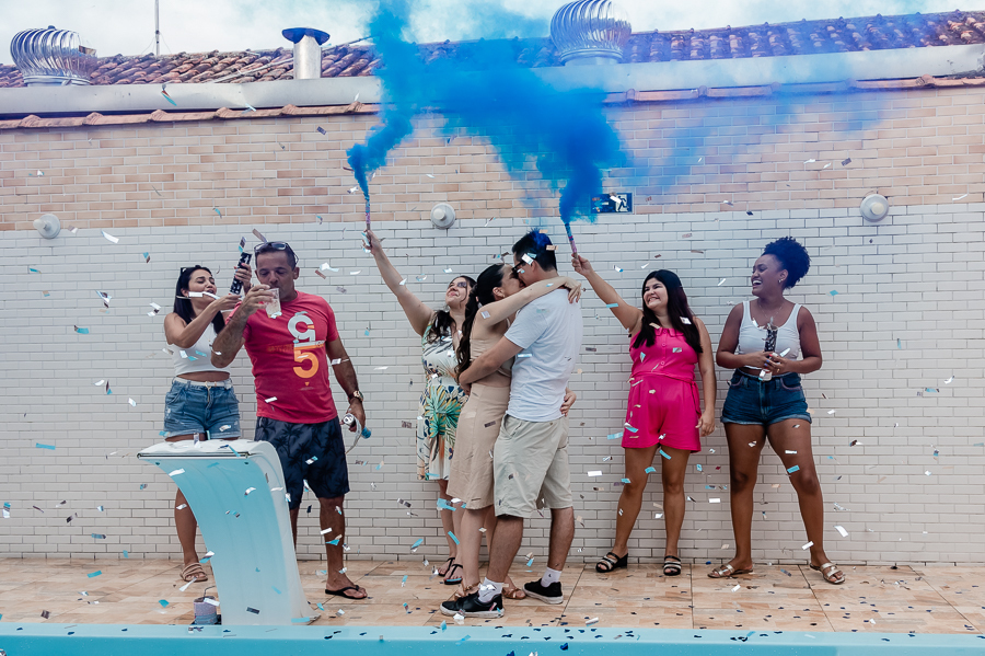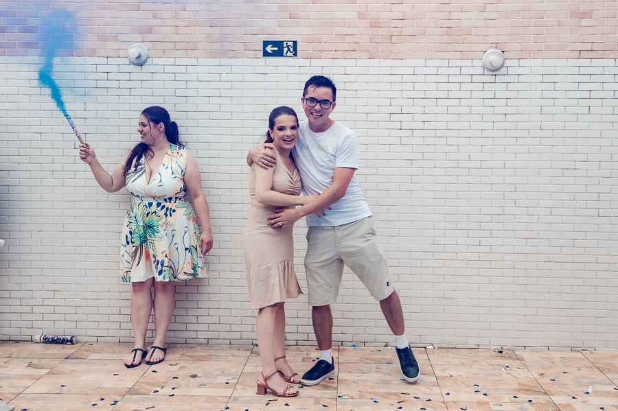 As amigas da Thaís e do Renan colocaram a fumaça atrás do casal e seguraram os canudos para o estouro.