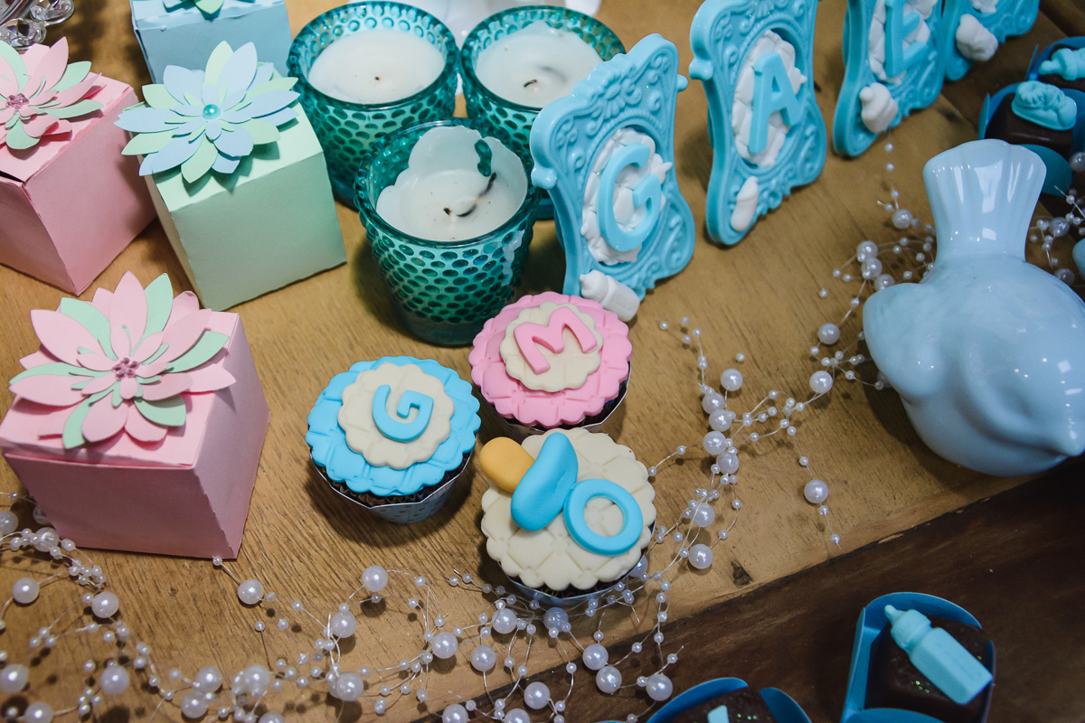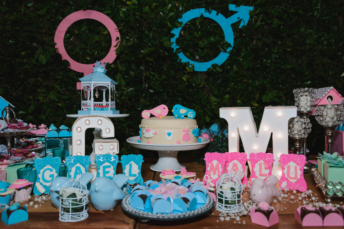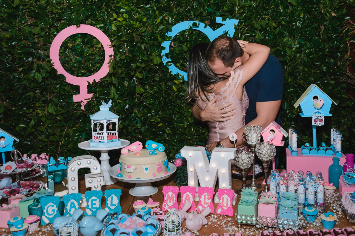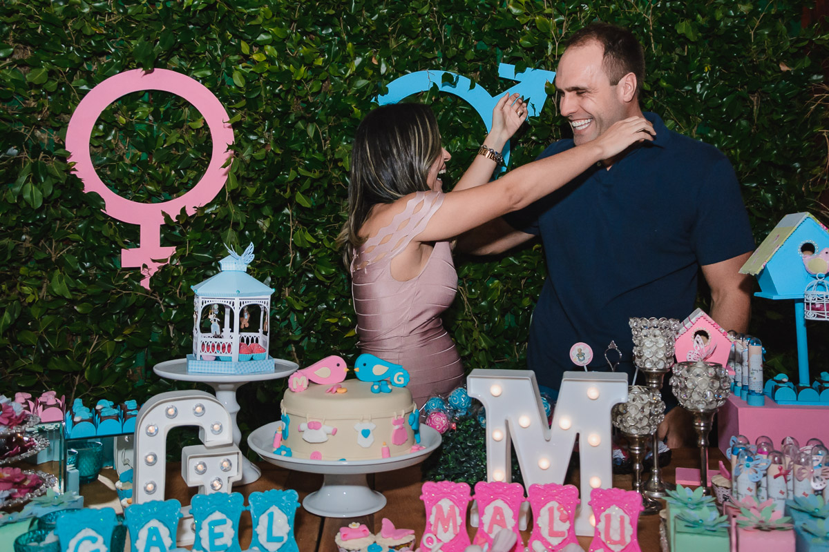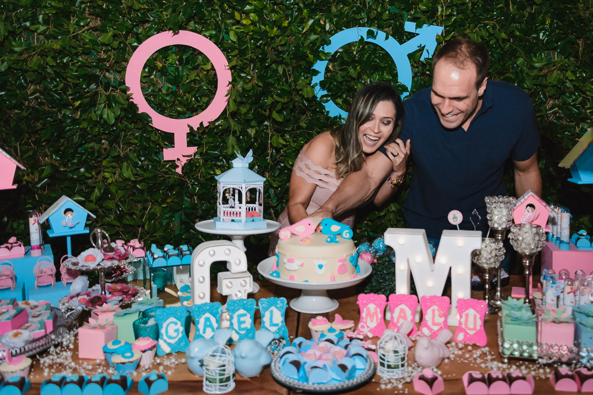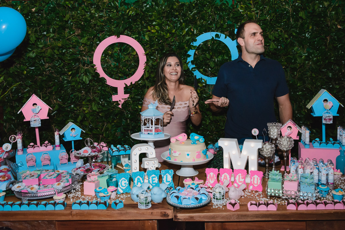 Todos se aproximaram da mesa principal. A Paula e o Gabriel se prepararam para cortar o bolo e ver qual a cor estaria presente! Seria azul ou rosa?